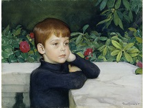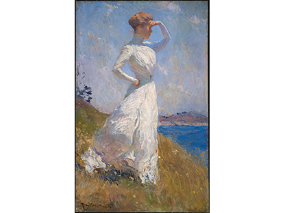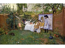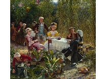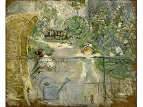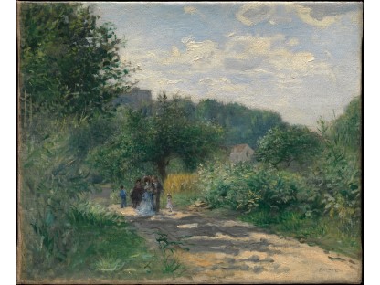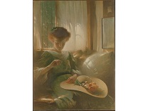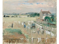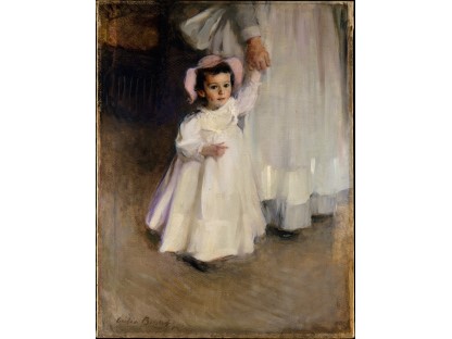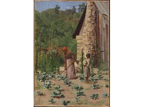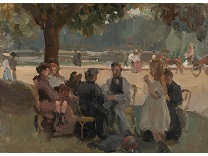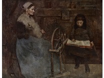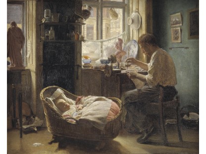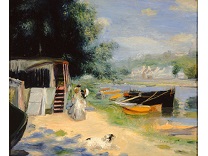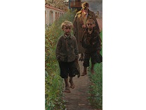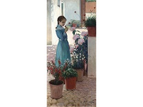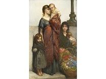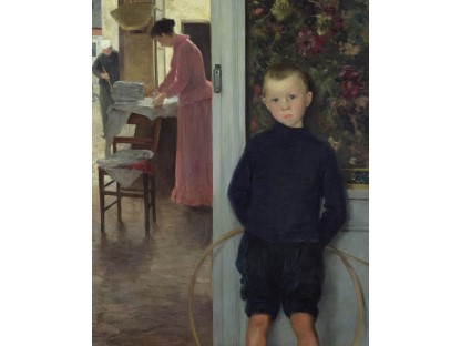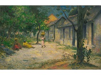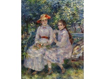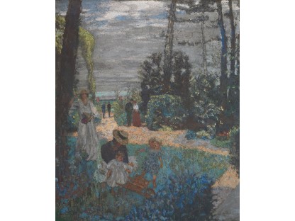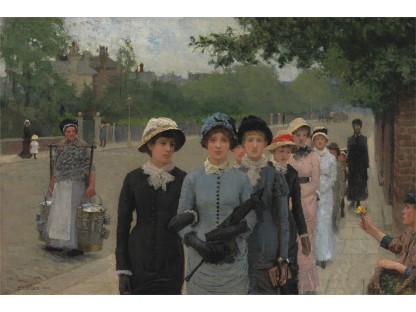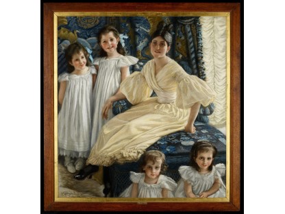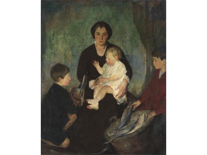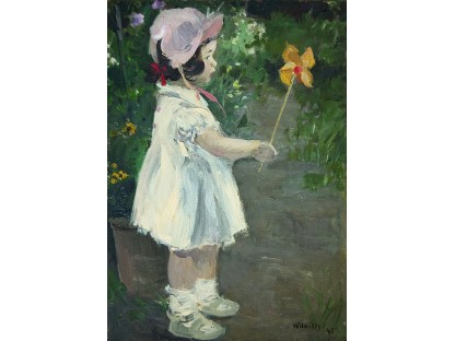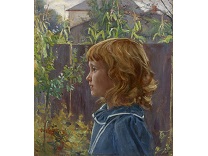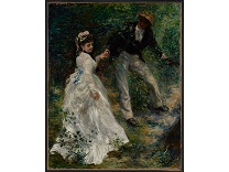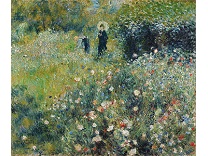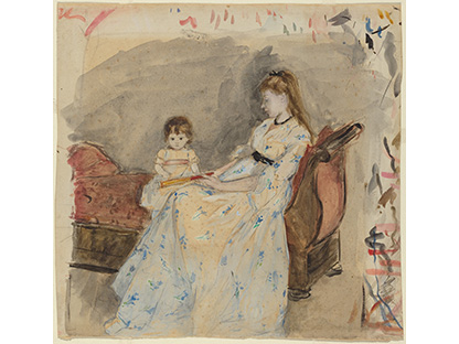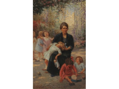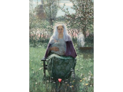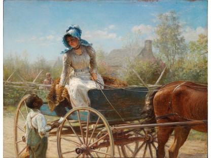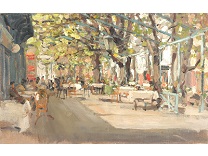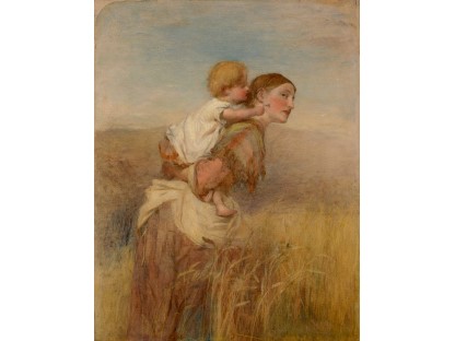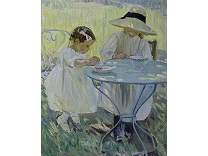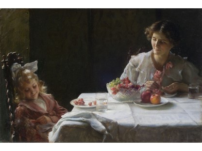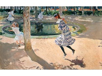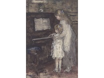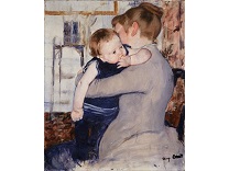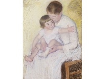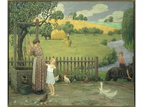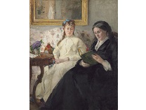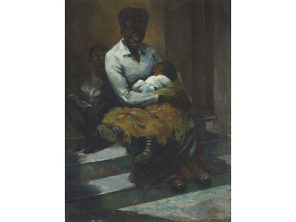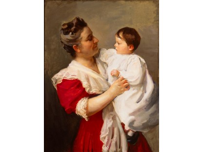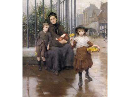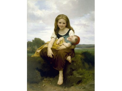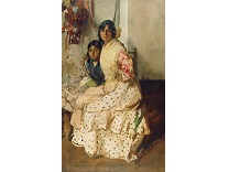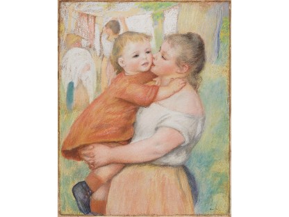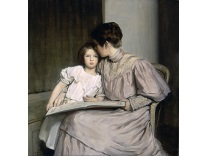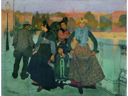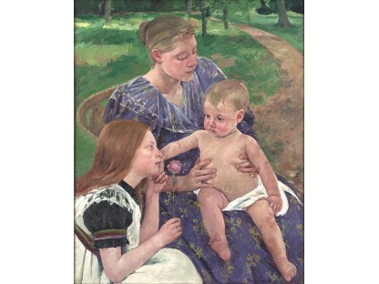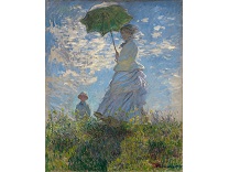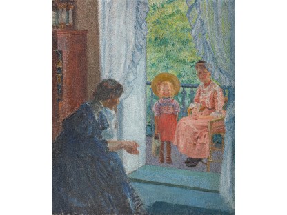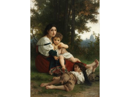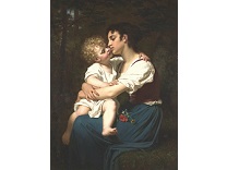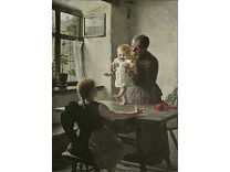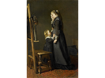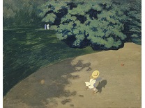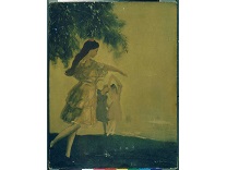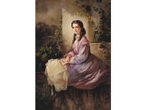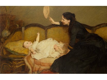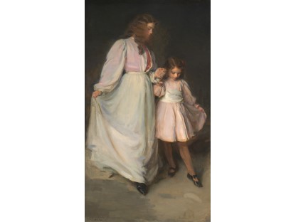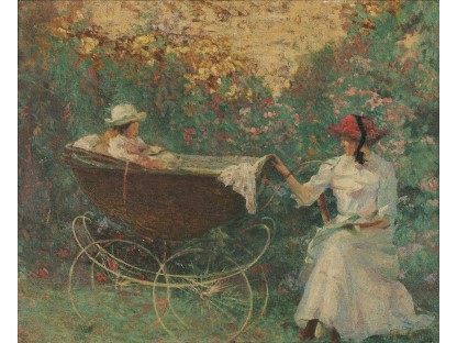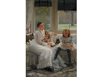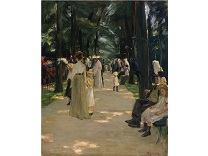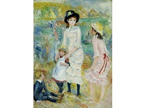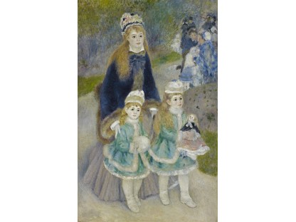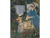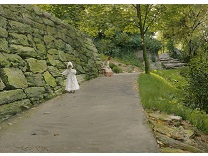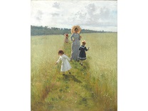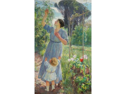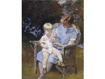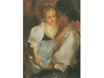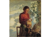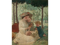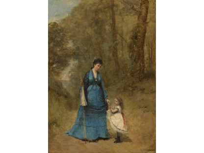 此画描绘了一个阳光明媚的清晨,母亲和孩子散步场景,充分表现了人物的惬意心情以及其中的微风、蓝天的那种恬静美好。