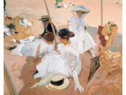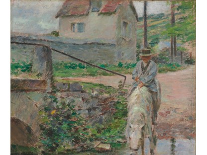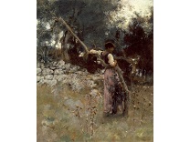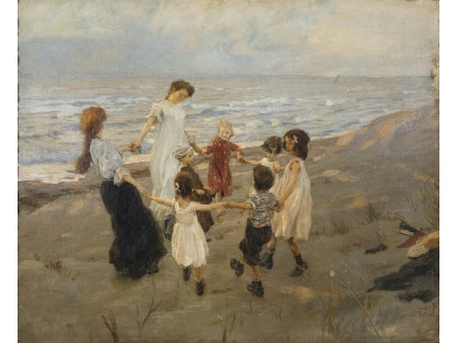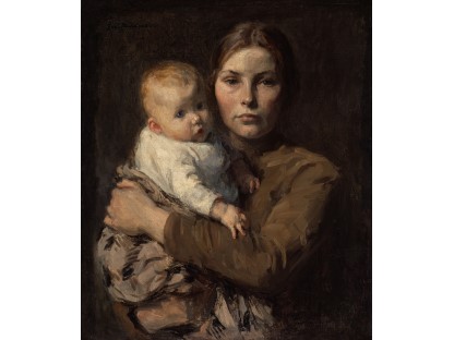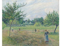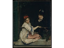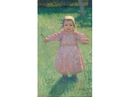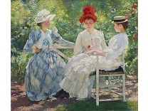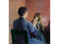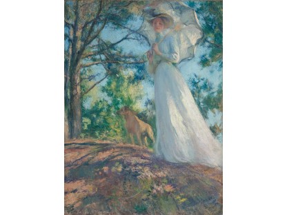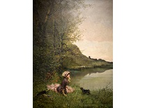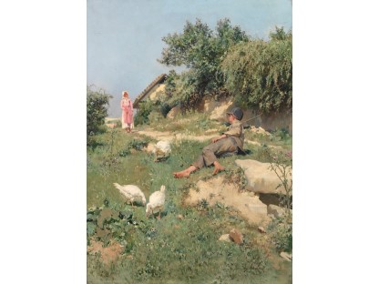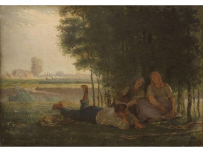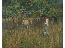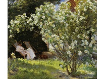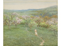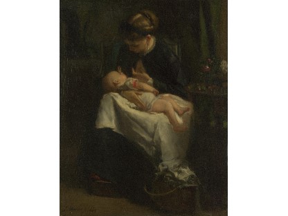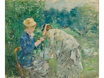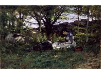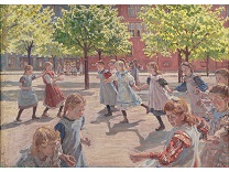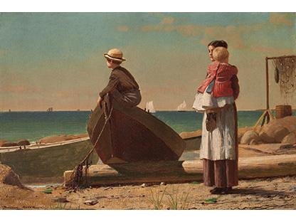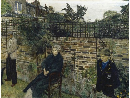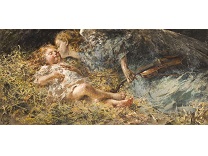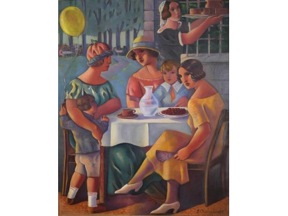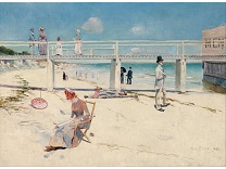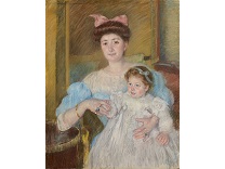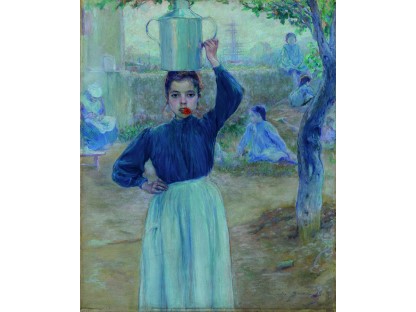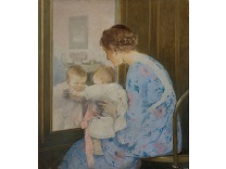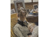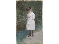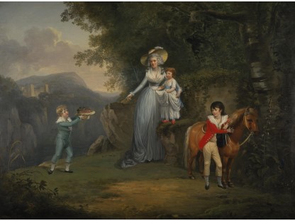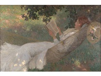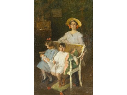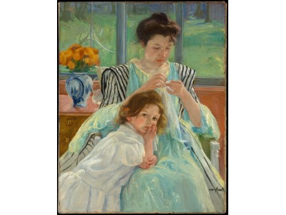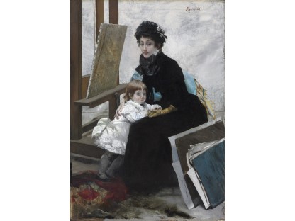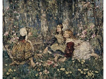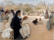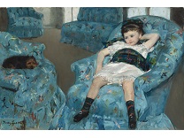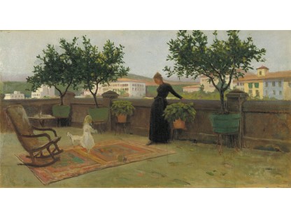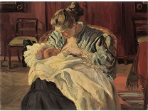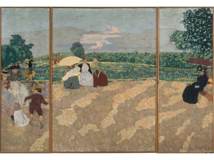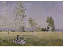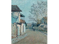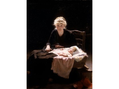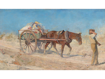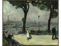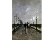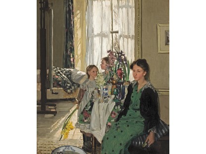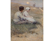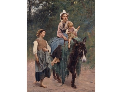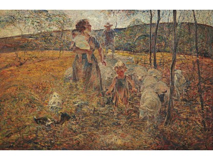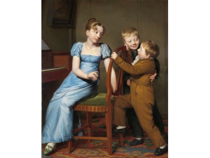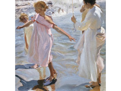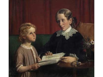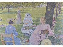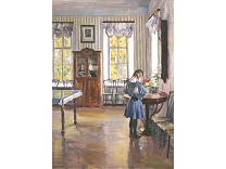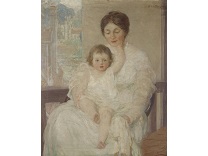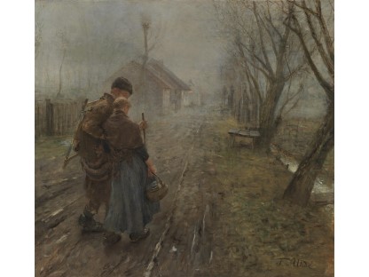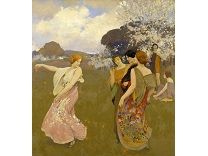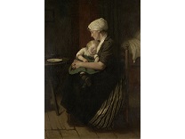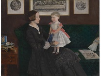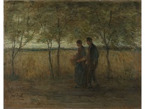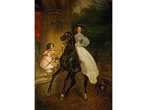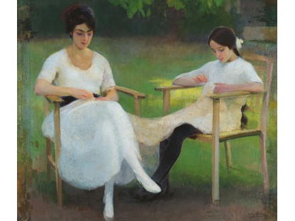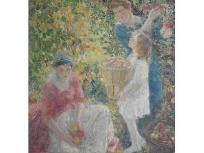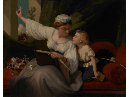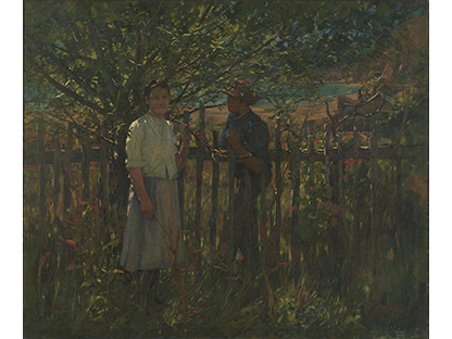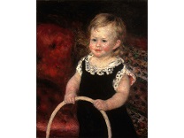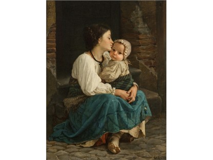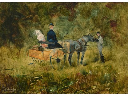 此画描绘了一个阳光明媚的清晨,母亲和孩子散步场景,充分表现了人物的惬意心情以及其中的微风、蓝天的那种恬静美好。