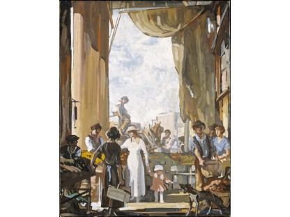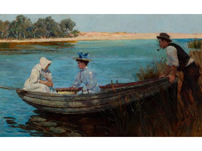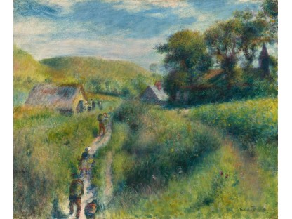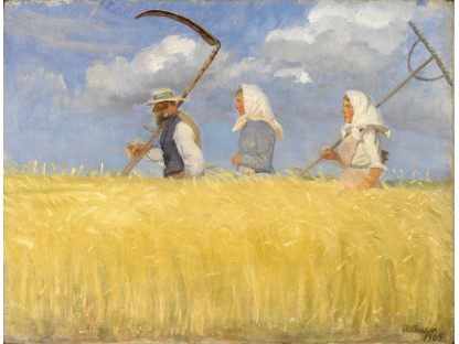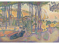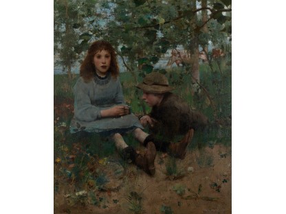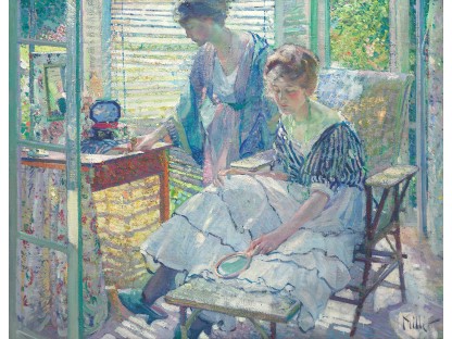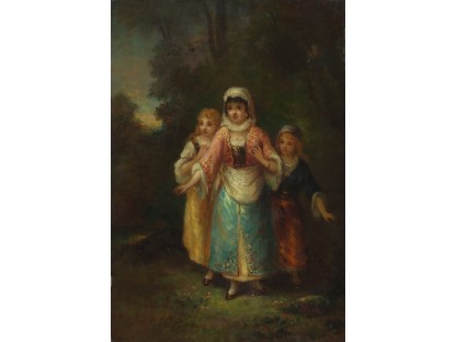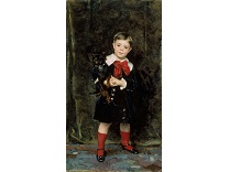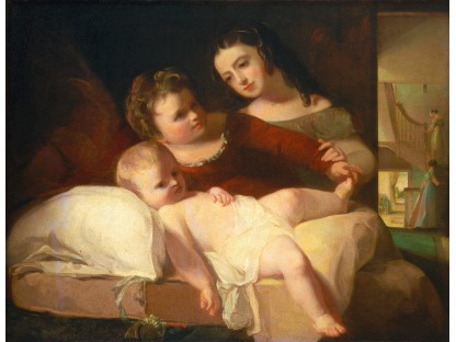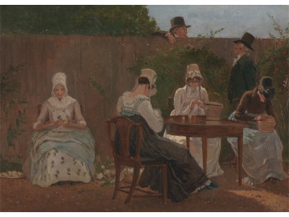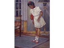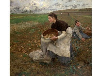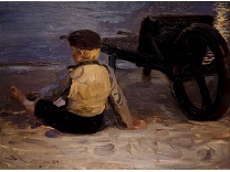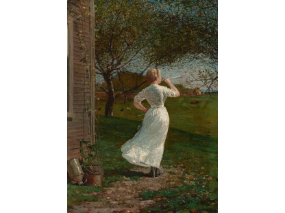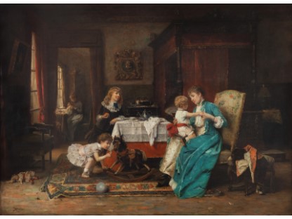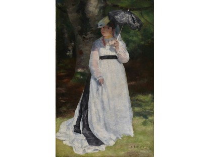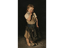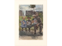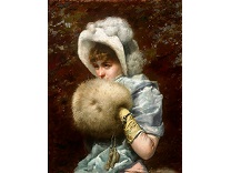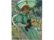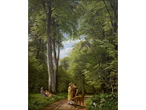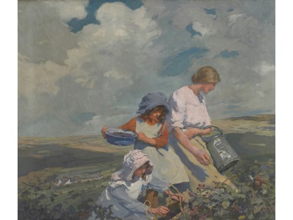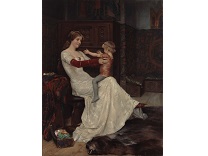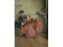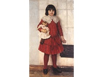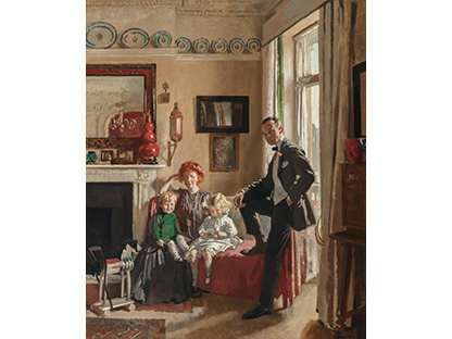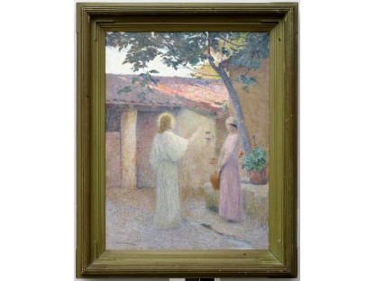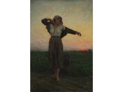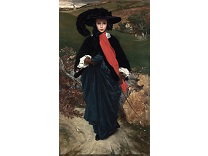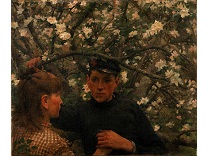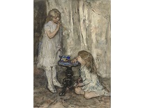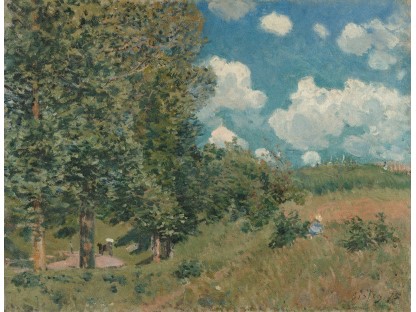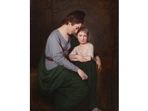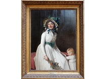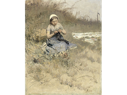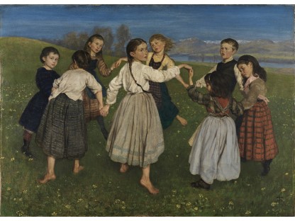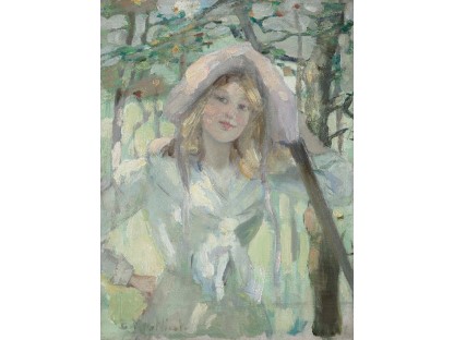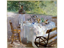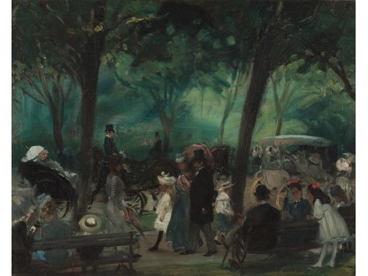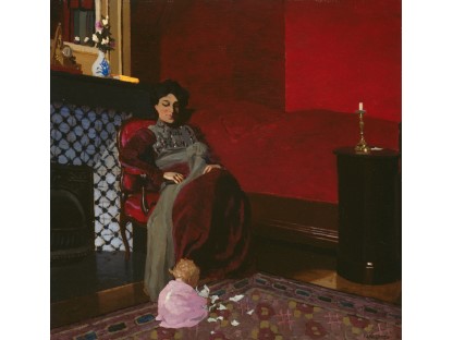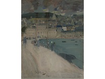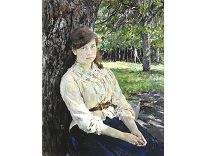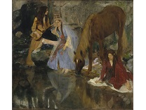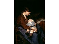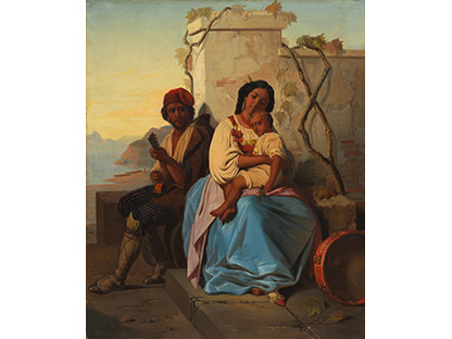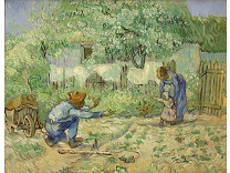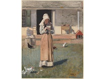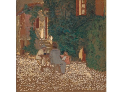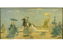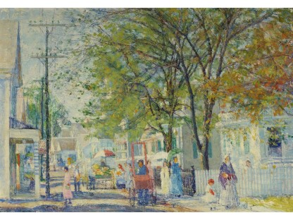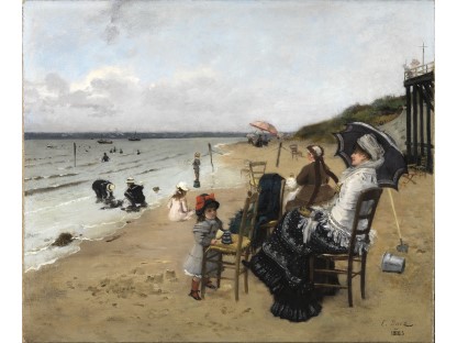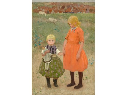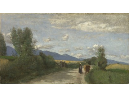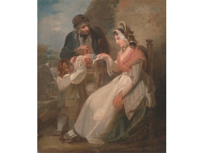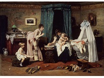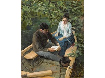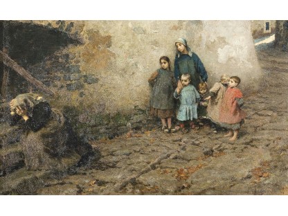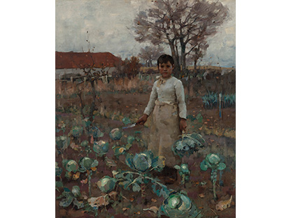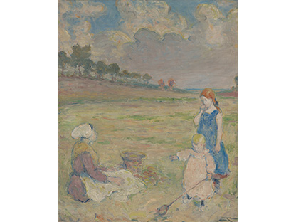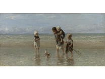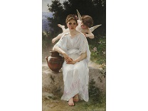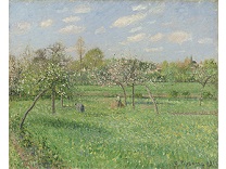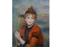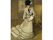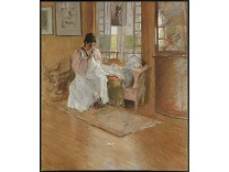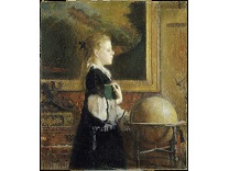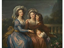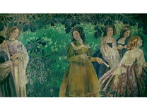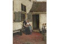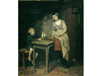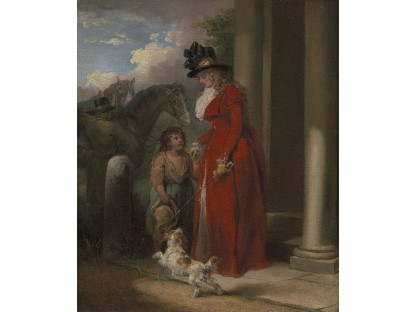 此画描绘了一个阳光明媚的清晨,母亲和孩子散步场景,充分表现了人物的惬意心情以及其中的微风、蓝天的那种恬静美好。
