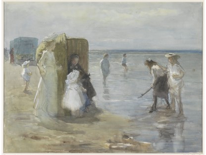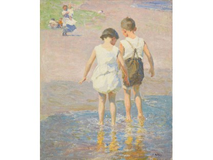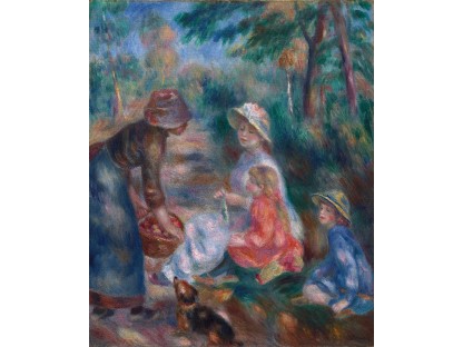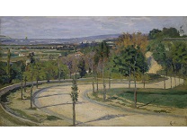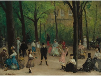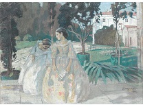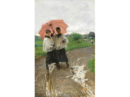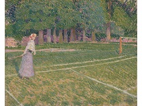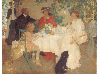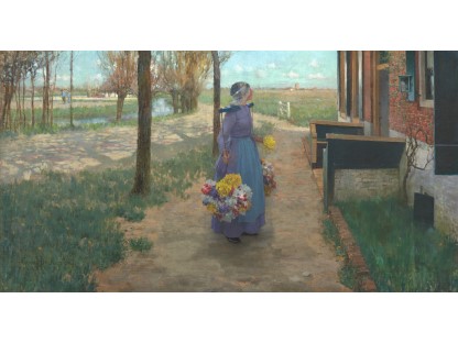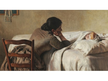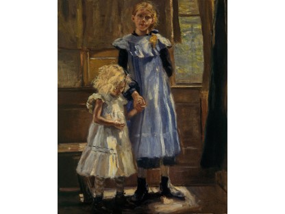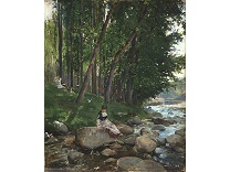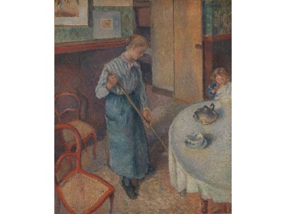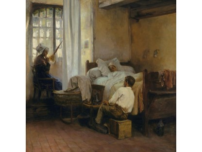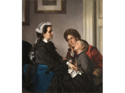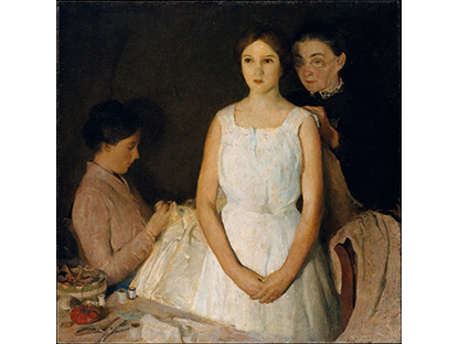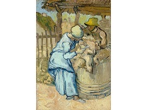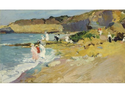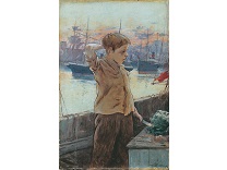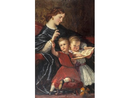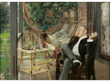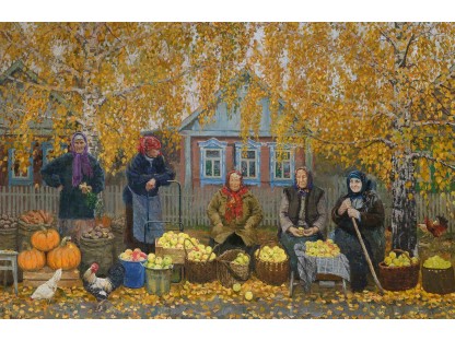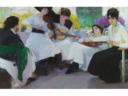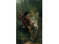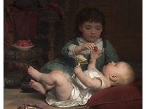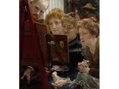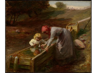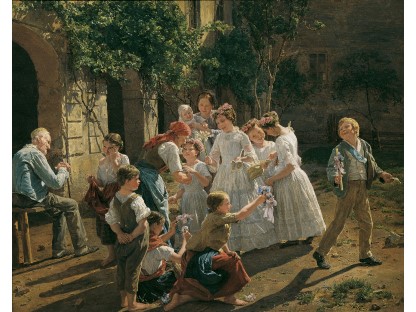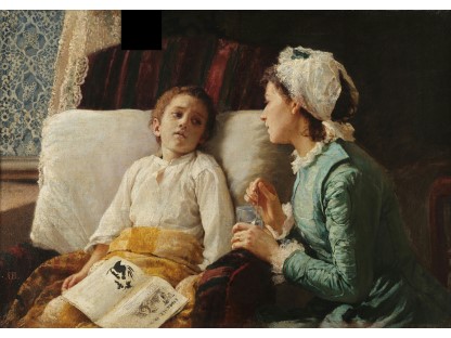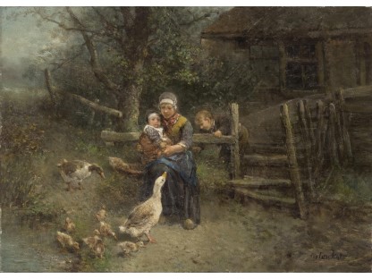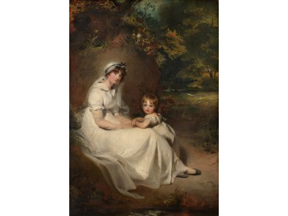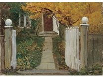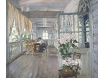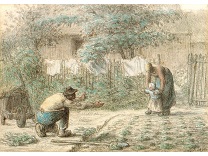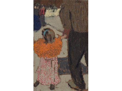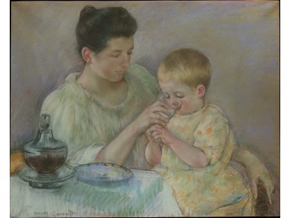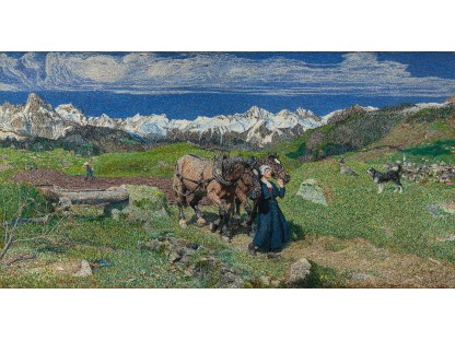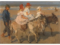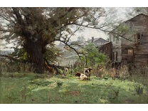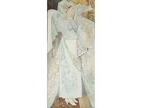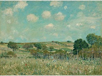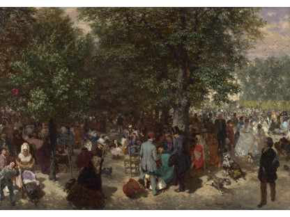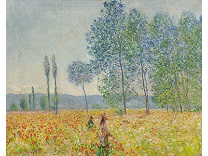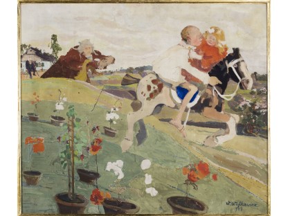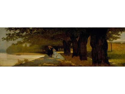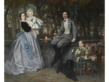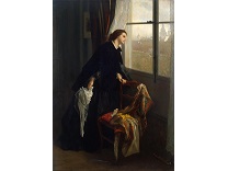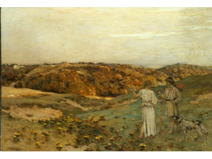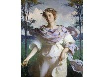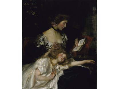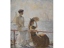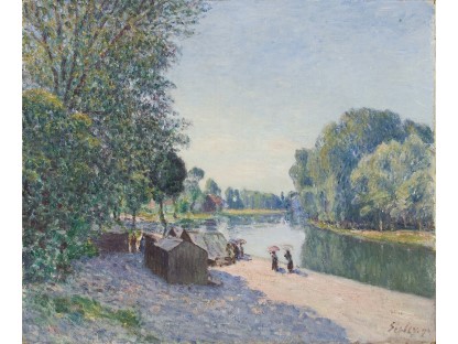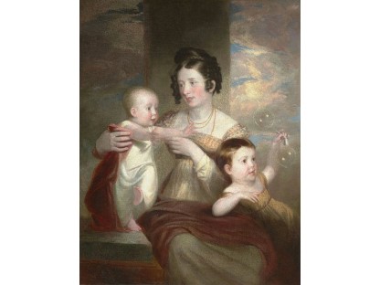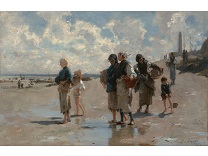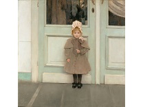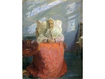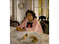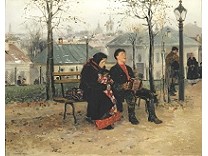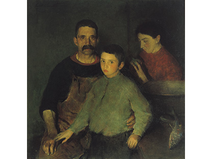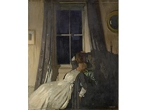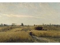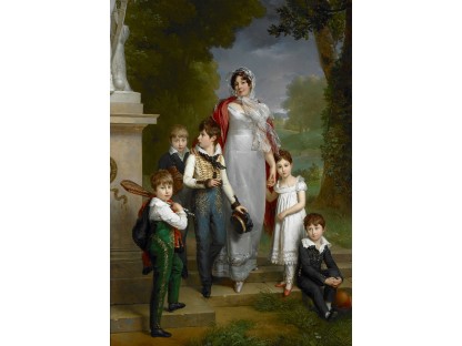 此画描绘了一个阳光明媚的清晨,母亲和孩子散步场景,充分表现了人物的惬意心情以及其中的微风、蓝天的那种恬静美好。