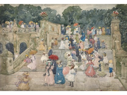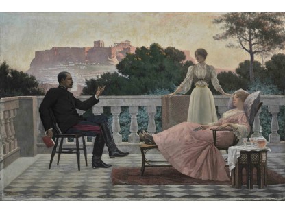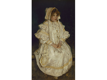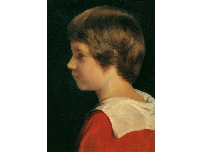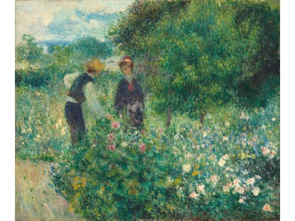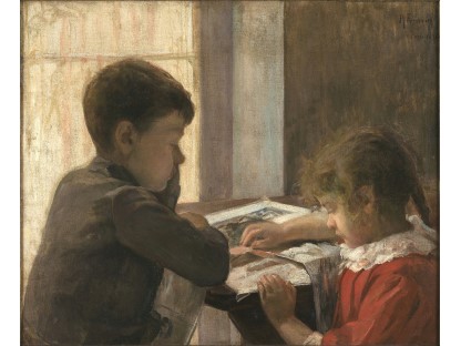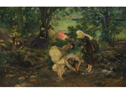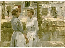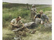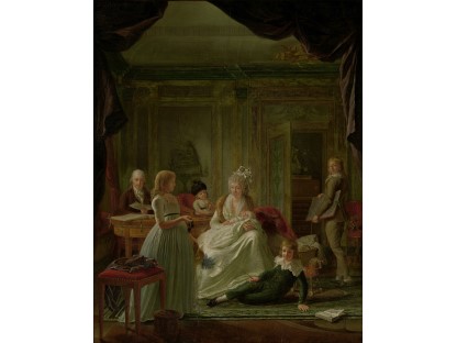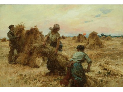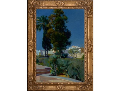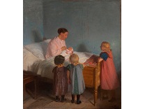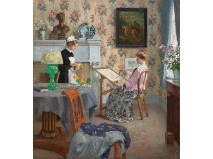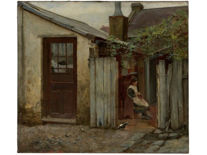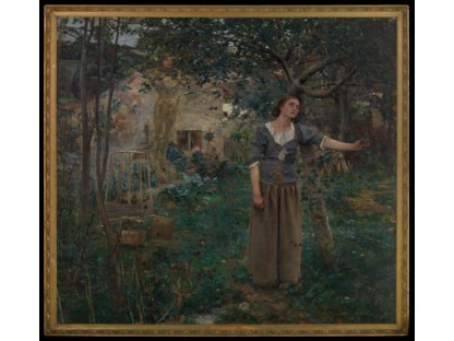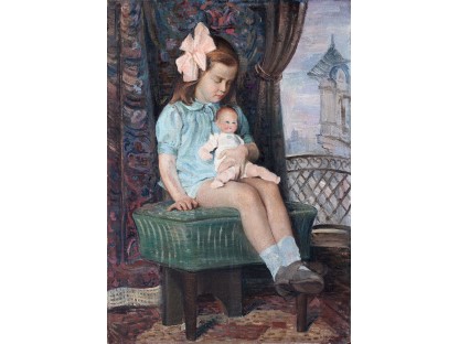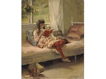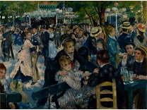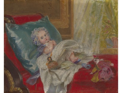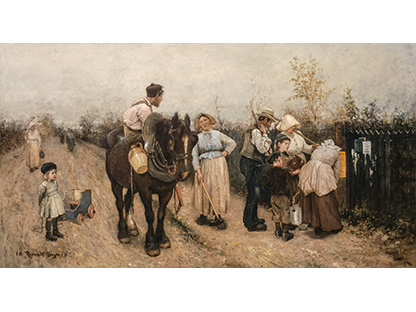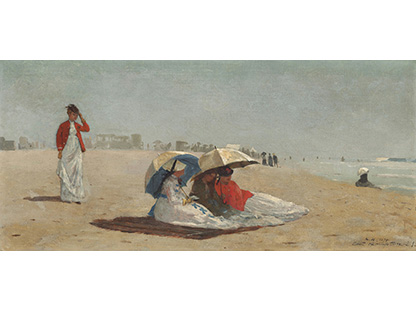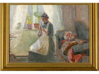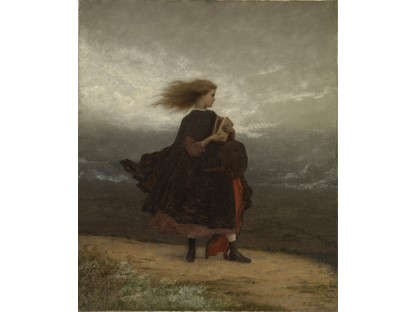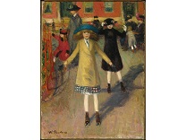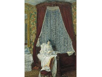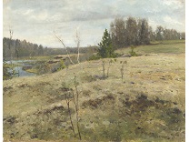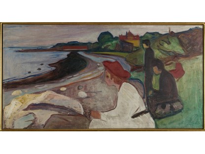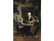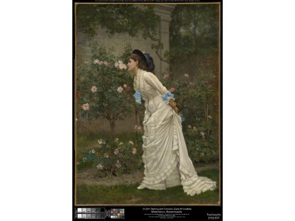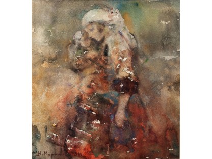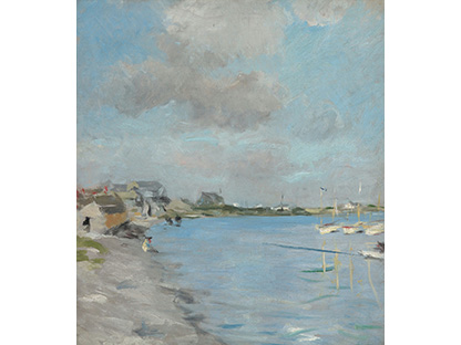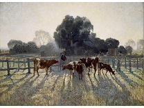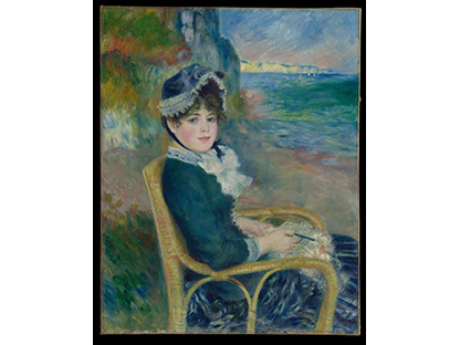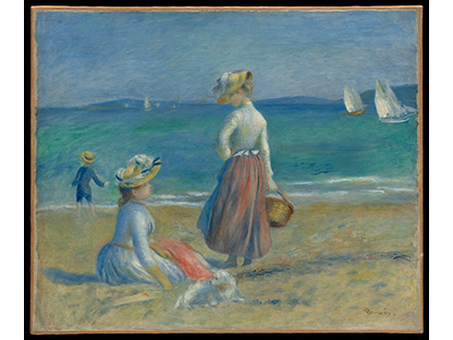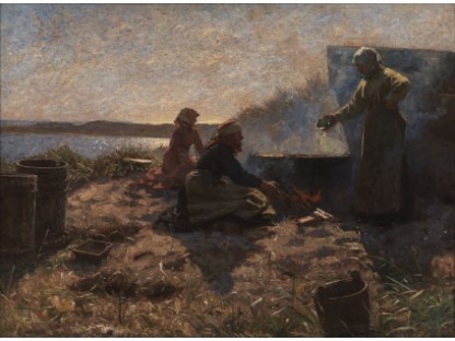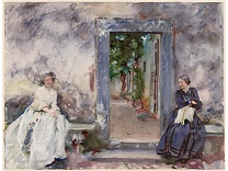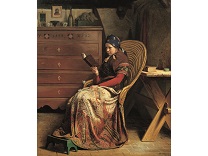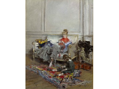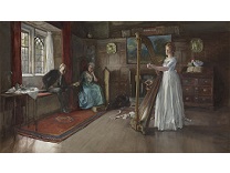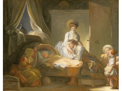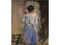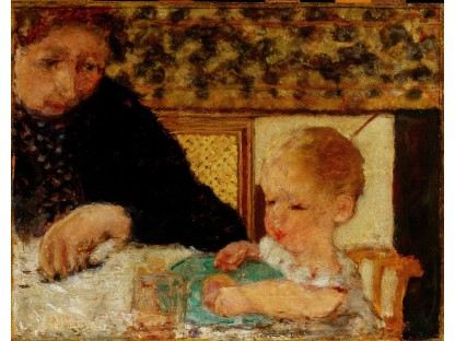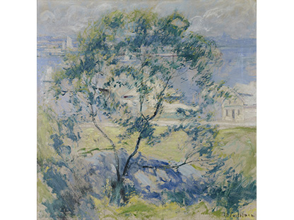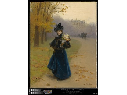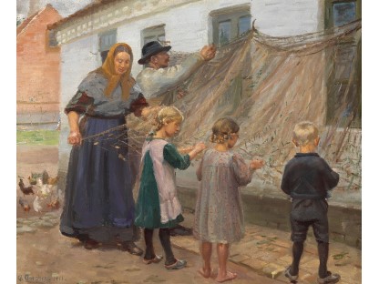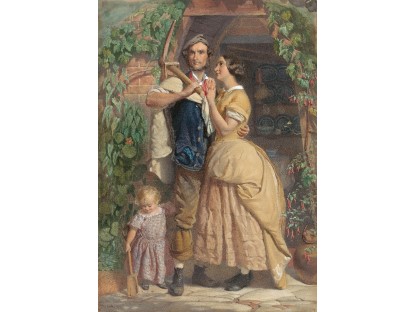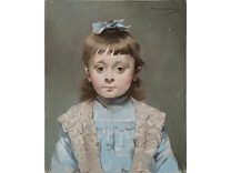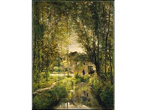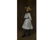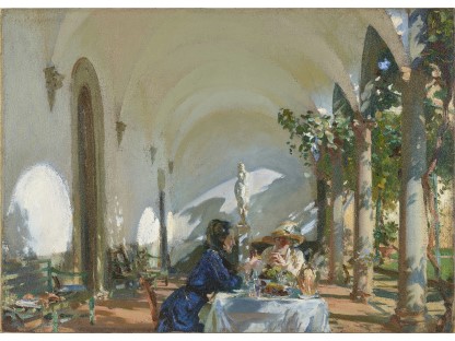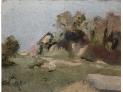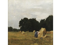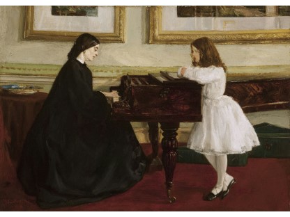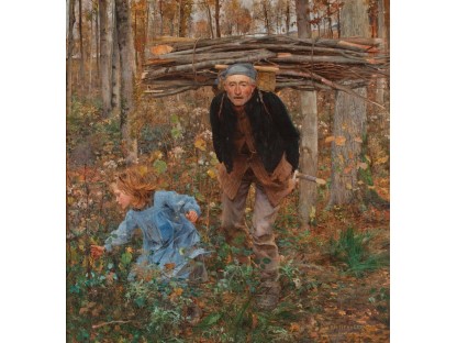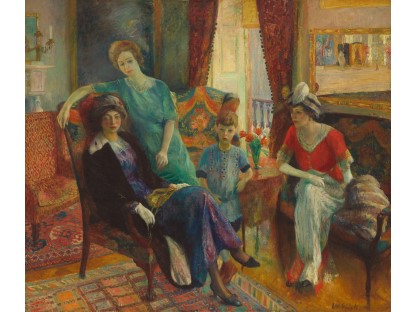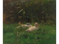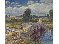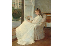 此画描绘了一个阳光明媚的清晨,母亲和孩子散步场景,充分表现了人物的惬意心情以及其中的微风、蓝天的那种恬静美好。