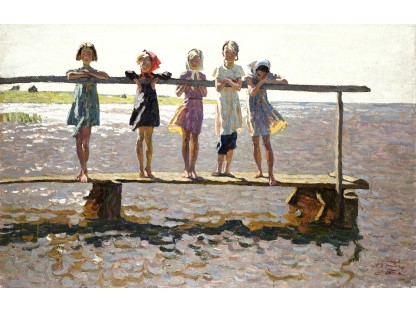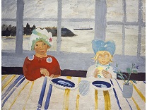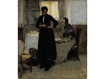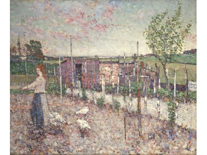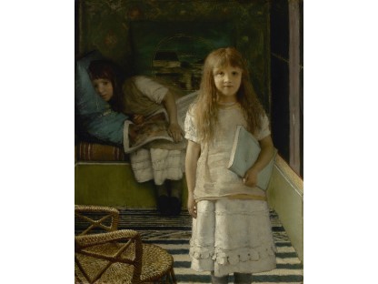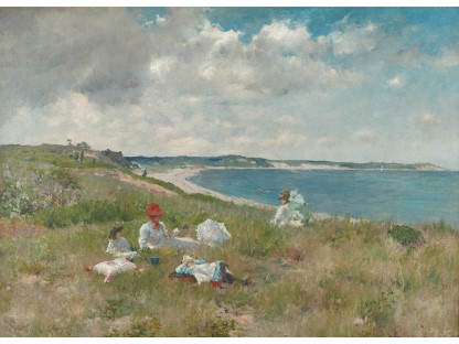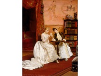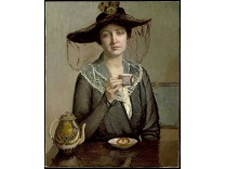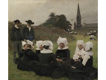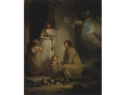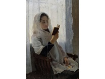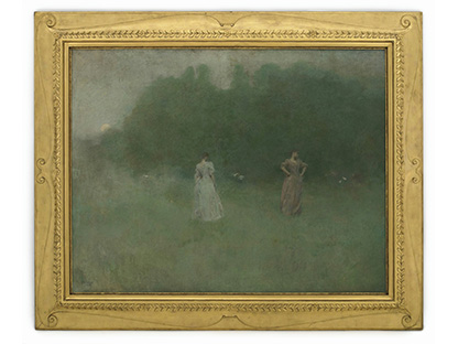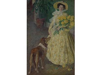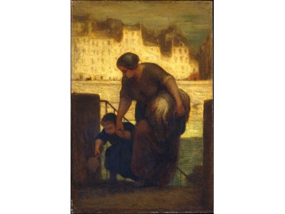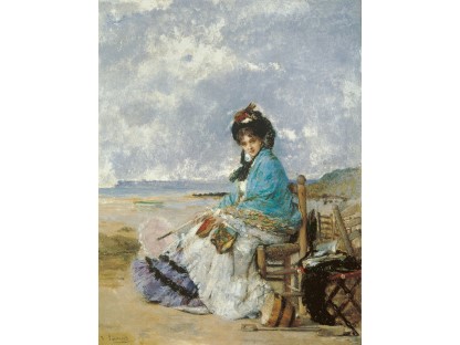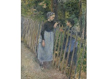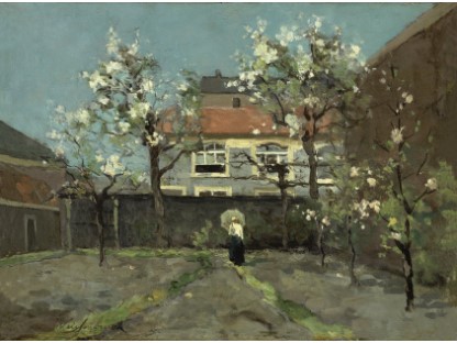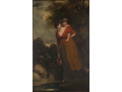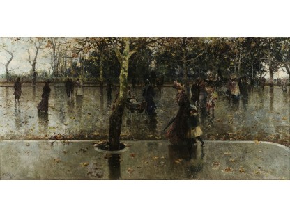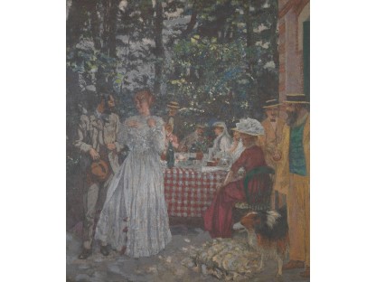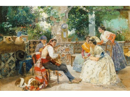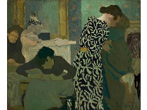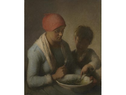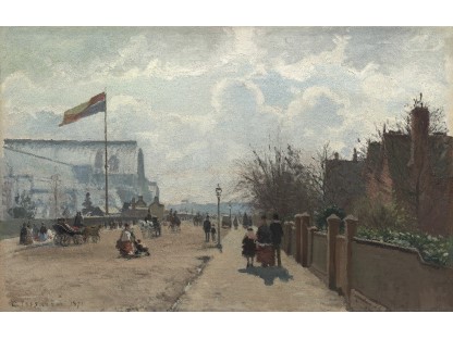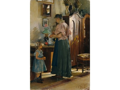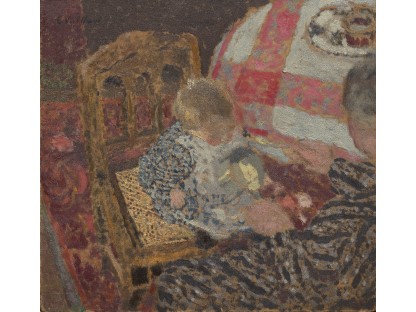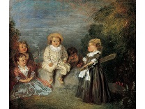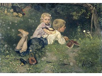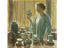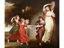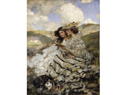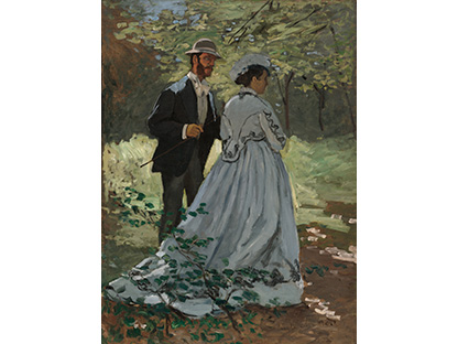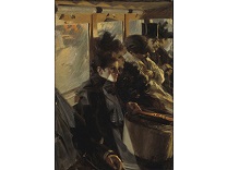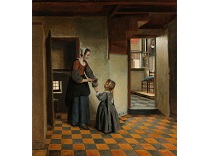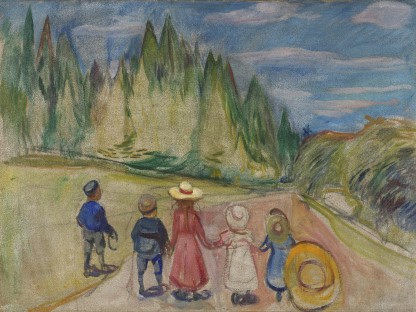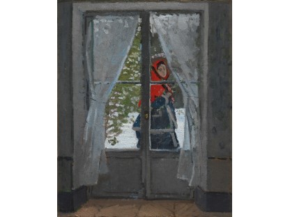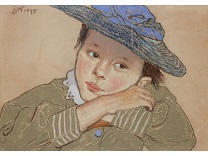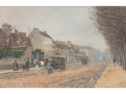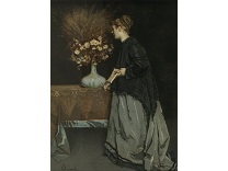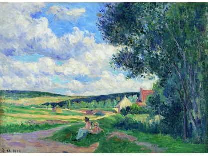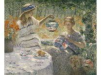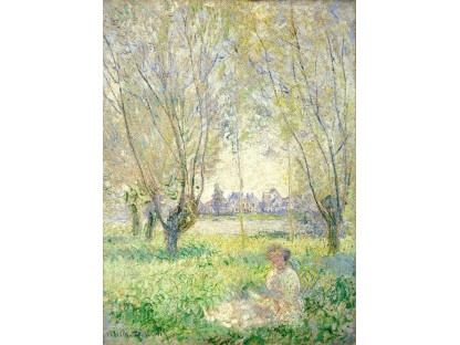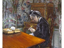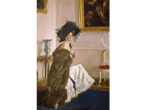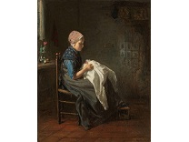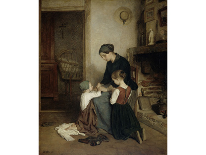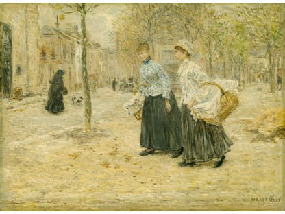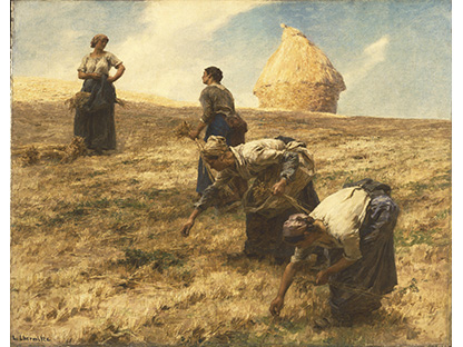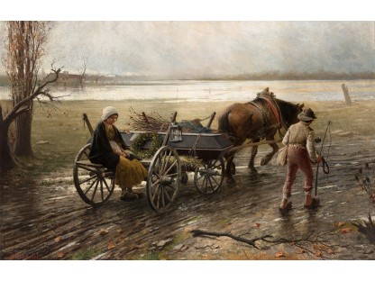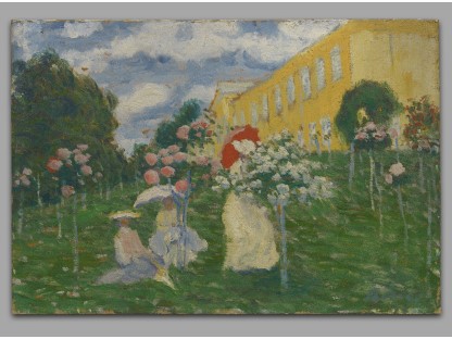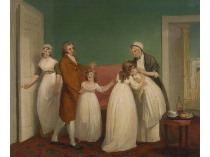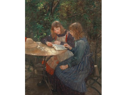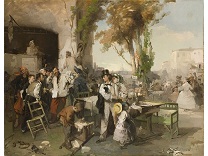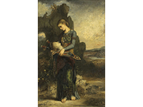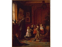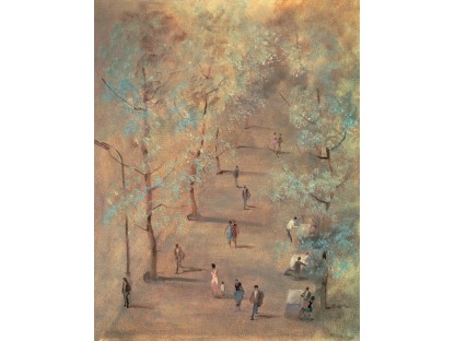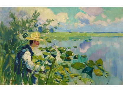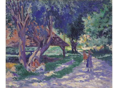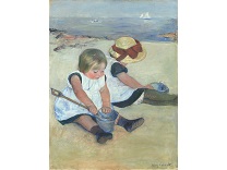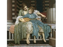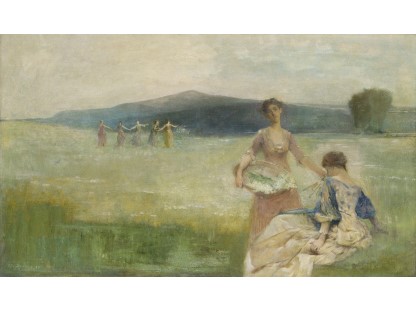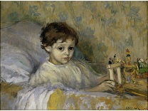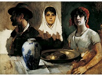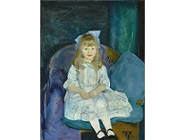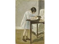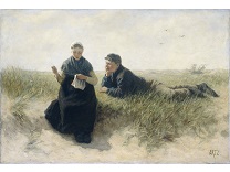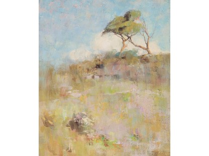 此画描绘了一个阳光明媚的清晨,母亲和孩子散步场景,充分表现了人物的惬意心情以及其中的微风、蓝天的那种恬静美好。