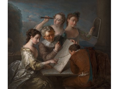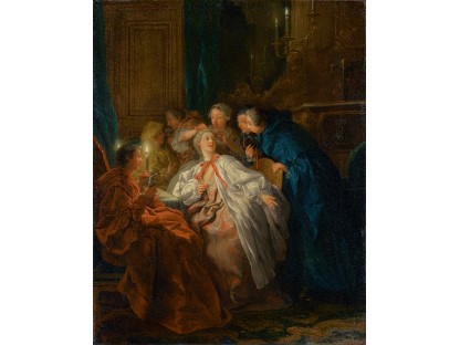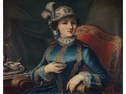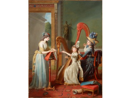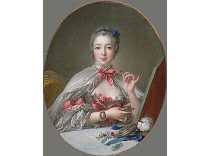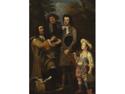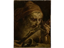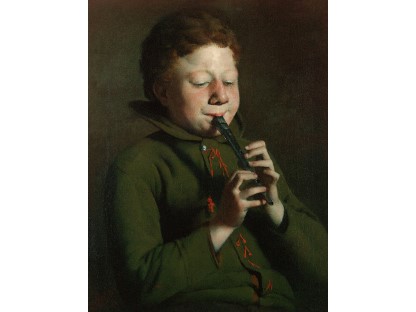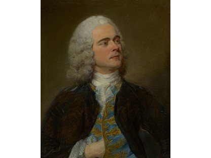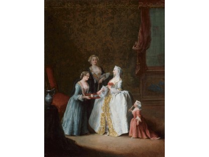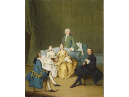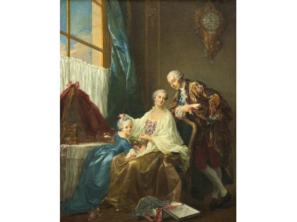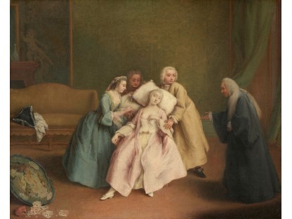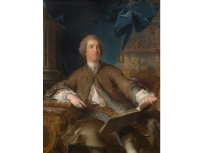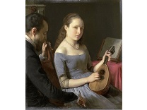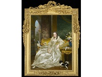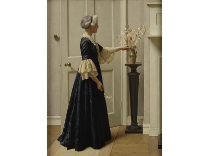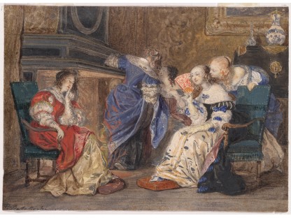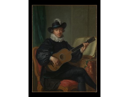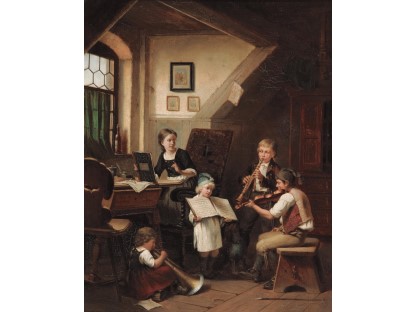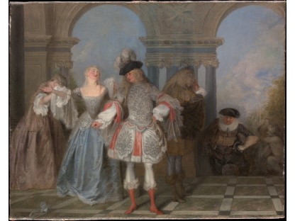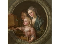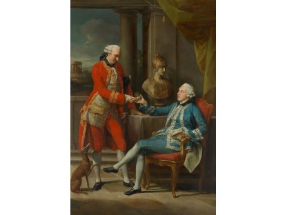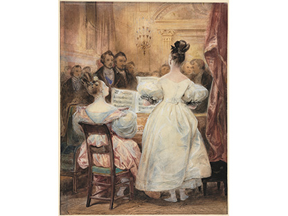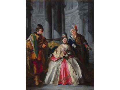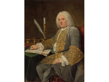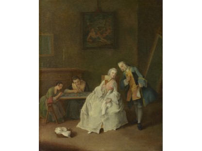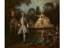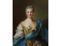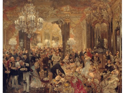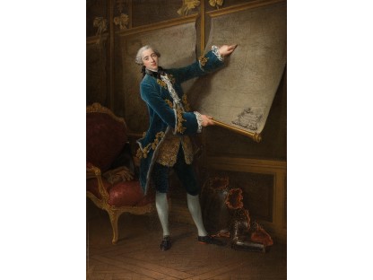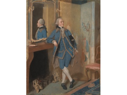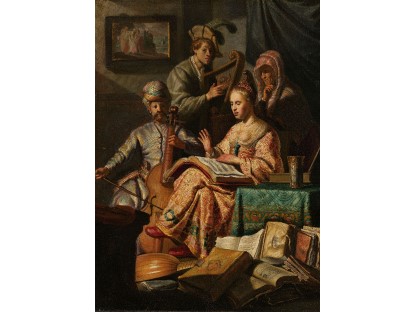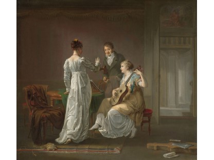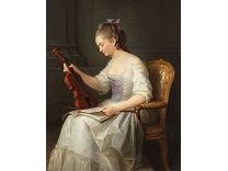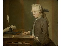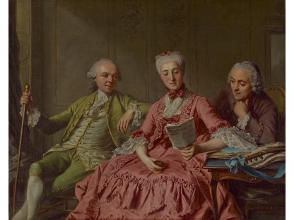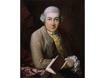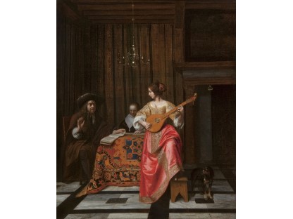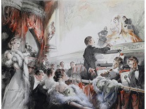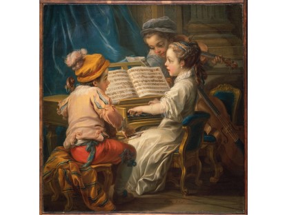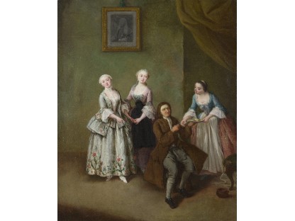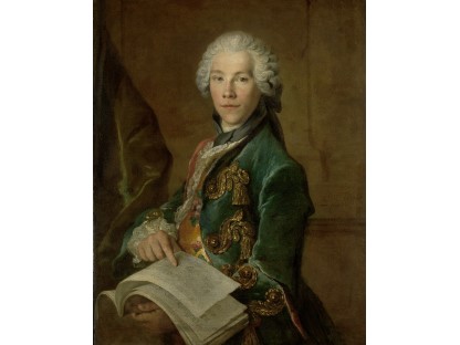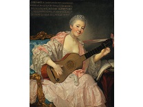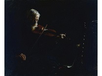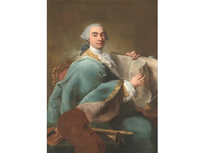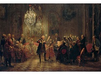 在极尽奢华,灯火通明的房间中,一位衣着考究,手握横笛的男子居中而立,目光直视乐谱正在专注地吹奏着。聚集在他身前是一个带有小提琴、大提琴和羽管键琴编制的小型乐队…