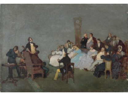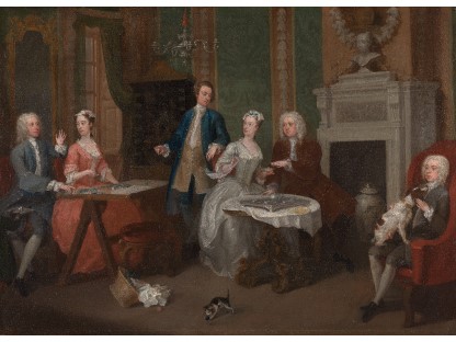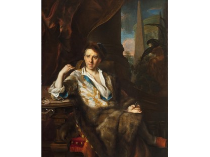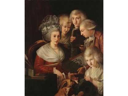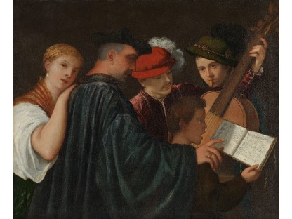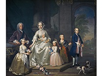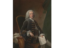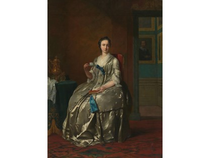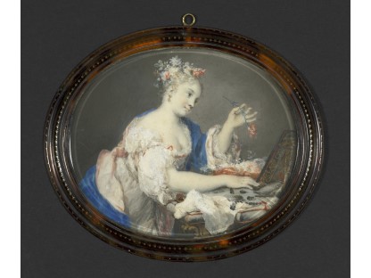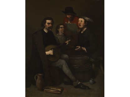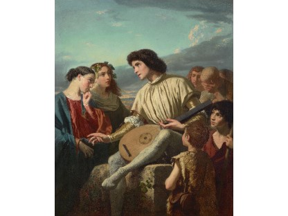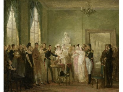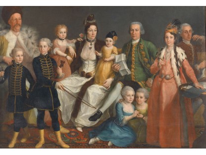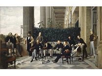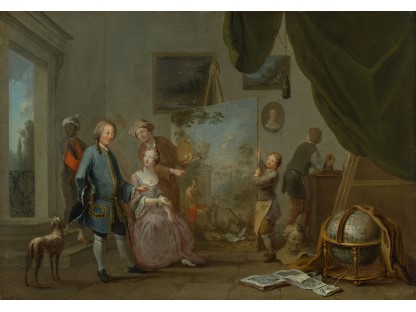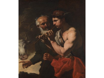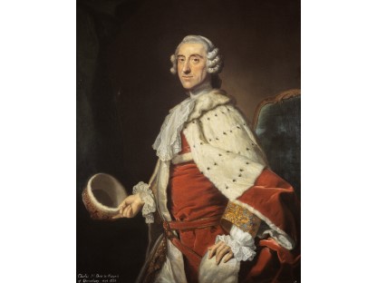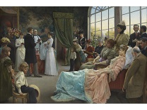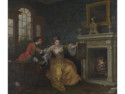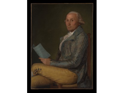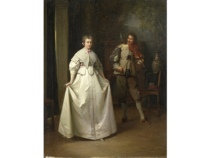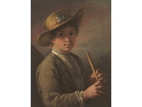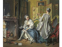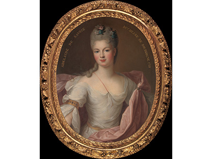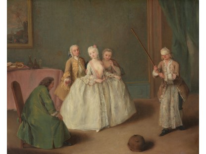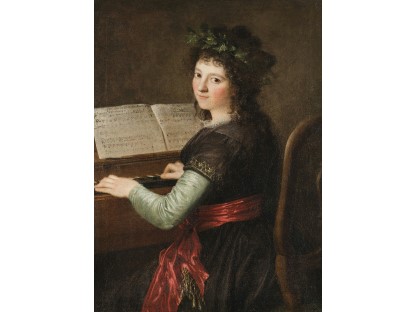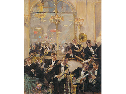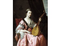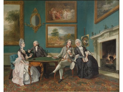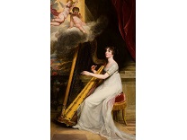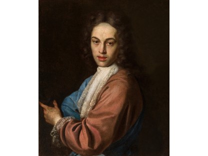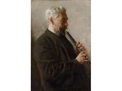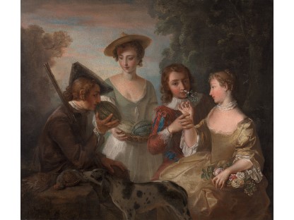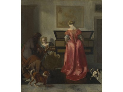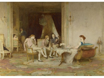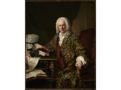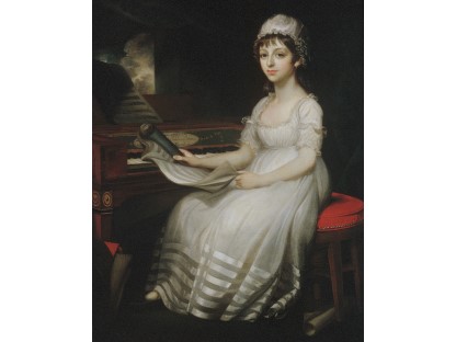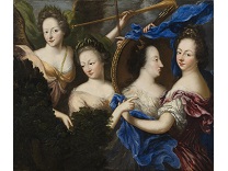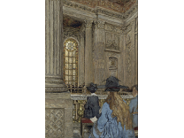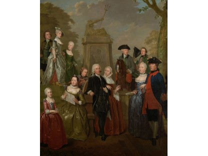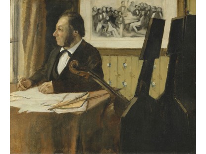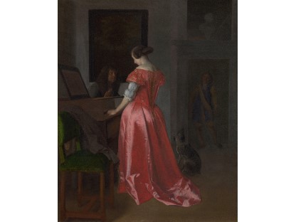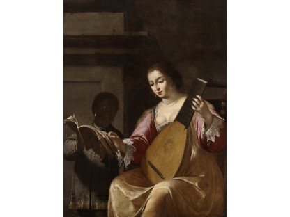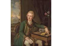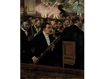 在极尽奢华,灯火通明的房间中,一位衣着考究,手握横笛的男子居中而立,目光直视乐谱正在专注地吹奏着。聚集在他身前是一个带有小提琴、大提琴和羽管键琴编制的小型乐队…