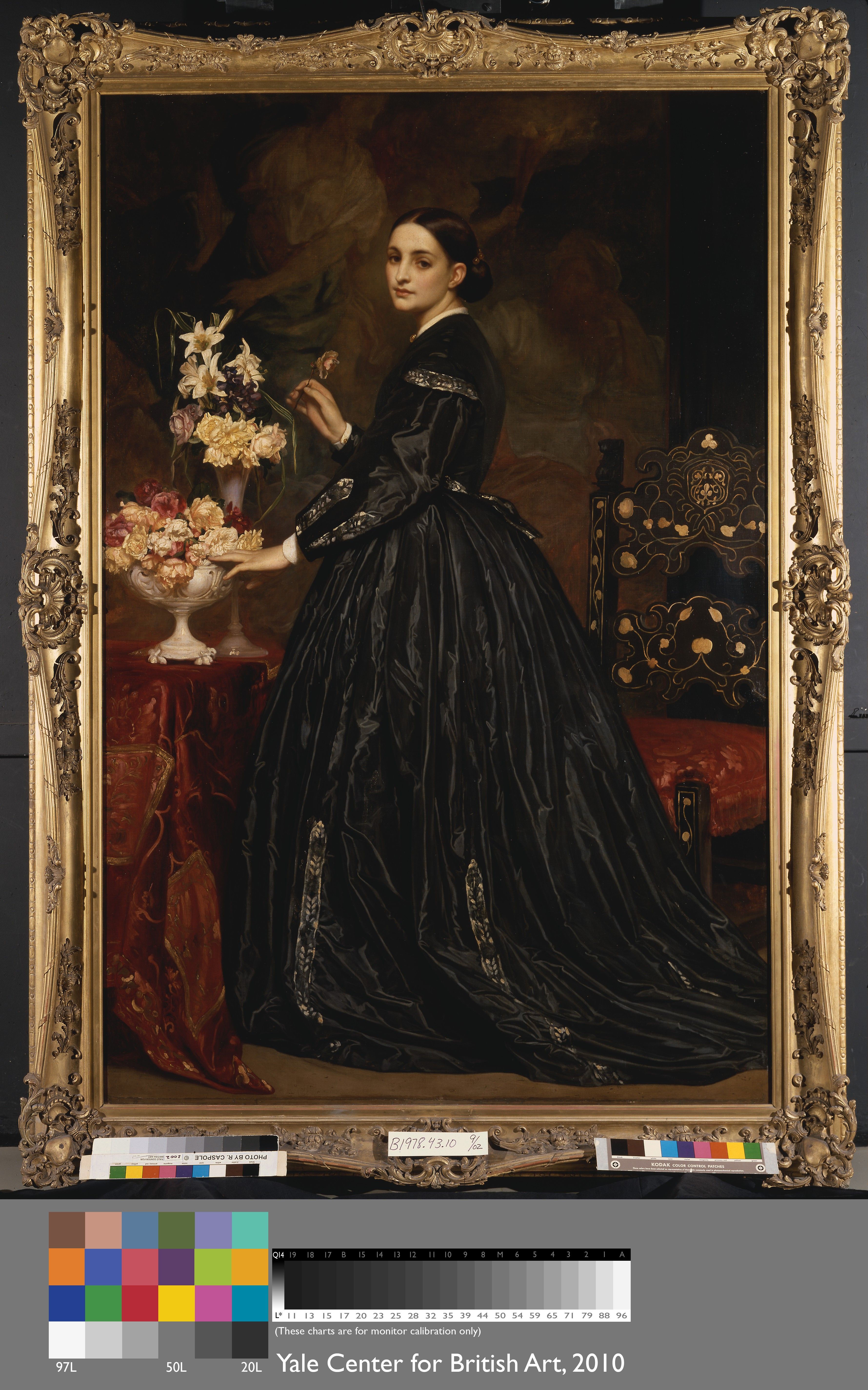 Frederic Leighton trained in Frankfurt, Paris, and Rome, only settling in London in 1859, where he helped introduce Continental ideas about aestheticism and "art for art’s sake." He became president of the Royal Academy in 1878. Leighton was selective about painting portraits but was sympathetic to Ellinor Guthrie (1838–1911), the daughter of James Stirling, the first governor of Western Australia. Born in Perth but raised partly in England, Ellinor married the Scottish merchant banker James Alexander Guthrie in 1856. The Guthries lived in the fashionable and affluent Portland Place in London, and, between 1857 and 1868, they had nine children. Sittings for this portrait took place after Ellinor had recovered from the birth of her fifth daughter in October 1864. In April 1865 she went into mourning when her father died, which may explain her somber, though luxurious, black dress.