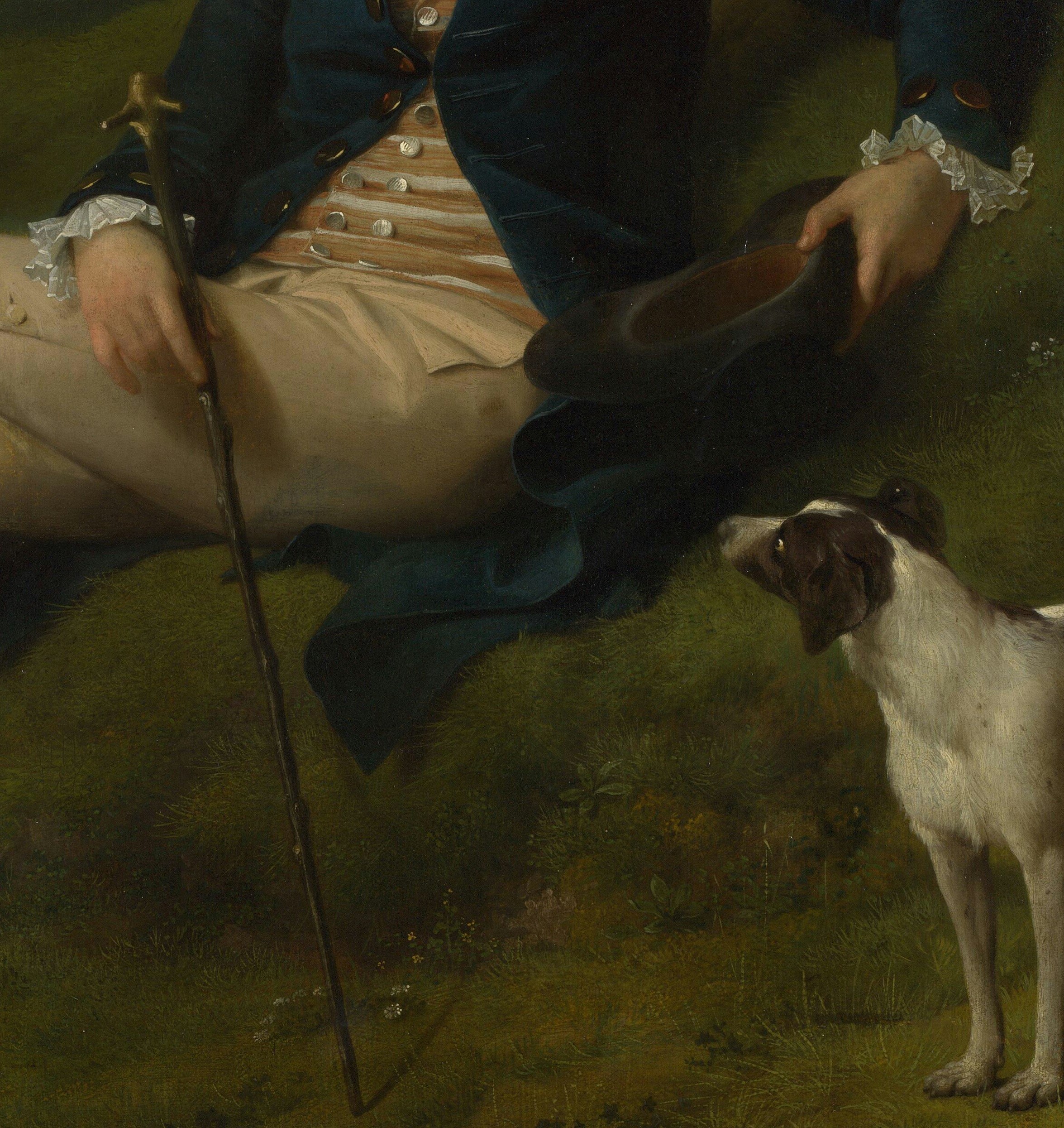 Greenway’s pose and the rural setting have echoes of Thomas Gainsborough’s John Plampin, which may in turn derive from Watteau’s portrait of Antoine de Laroque, painted around 1719. Laroque’s right leg had been amputated above the knee, having been smashed by a cannonball, and in the portrait he is reclining with his damaged leg stretched out before him. Although now lost, the portrait was widely known through an engraving made in 1734. Juel may also have known of Johann Heinrich Wilhelm Tischbein’s Goethe in the Roman Campagna (Städel Museum, Frankfurt), which shows the famous writer reclining in a landscape and was painted just a year before the Greenway portrait.