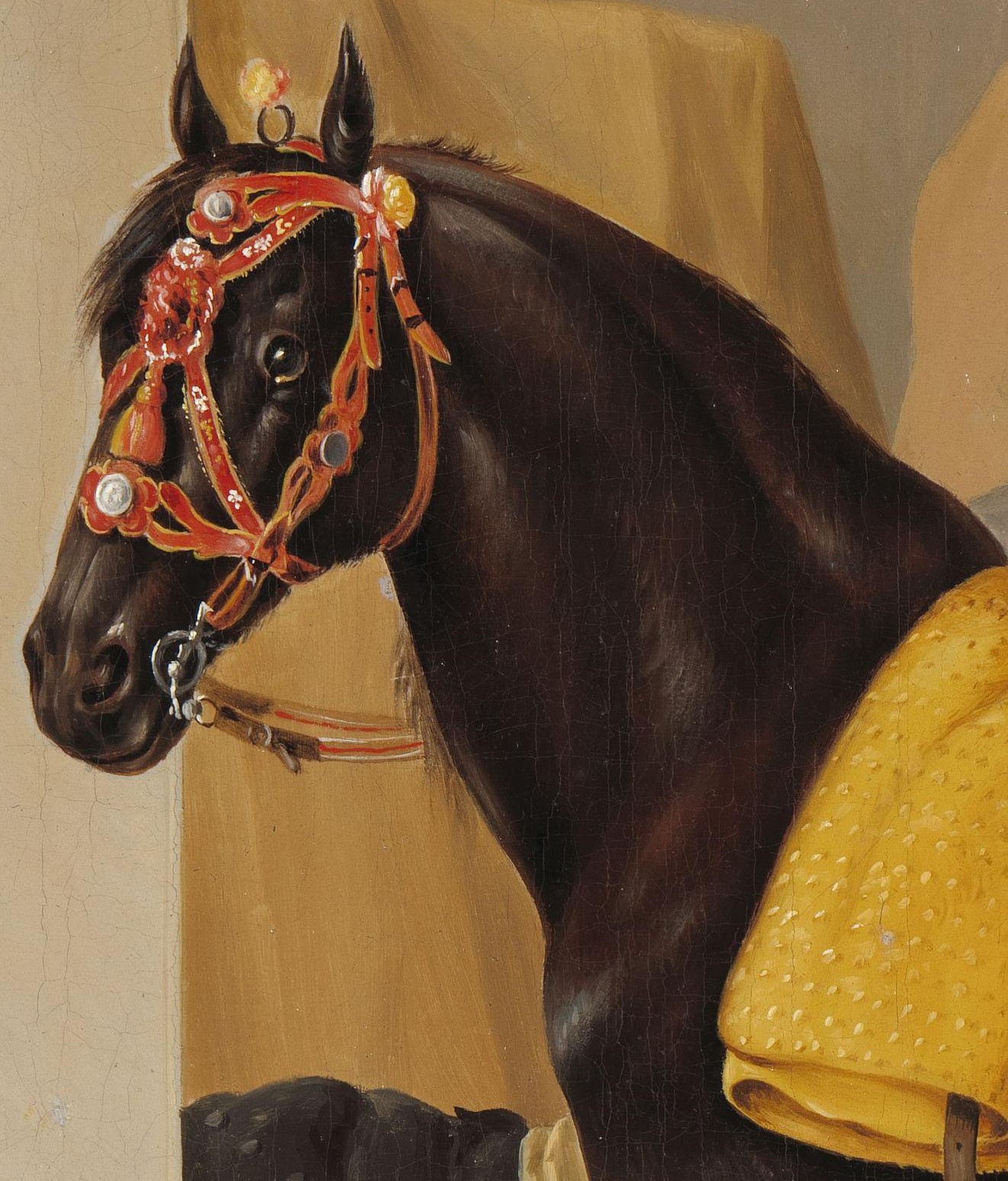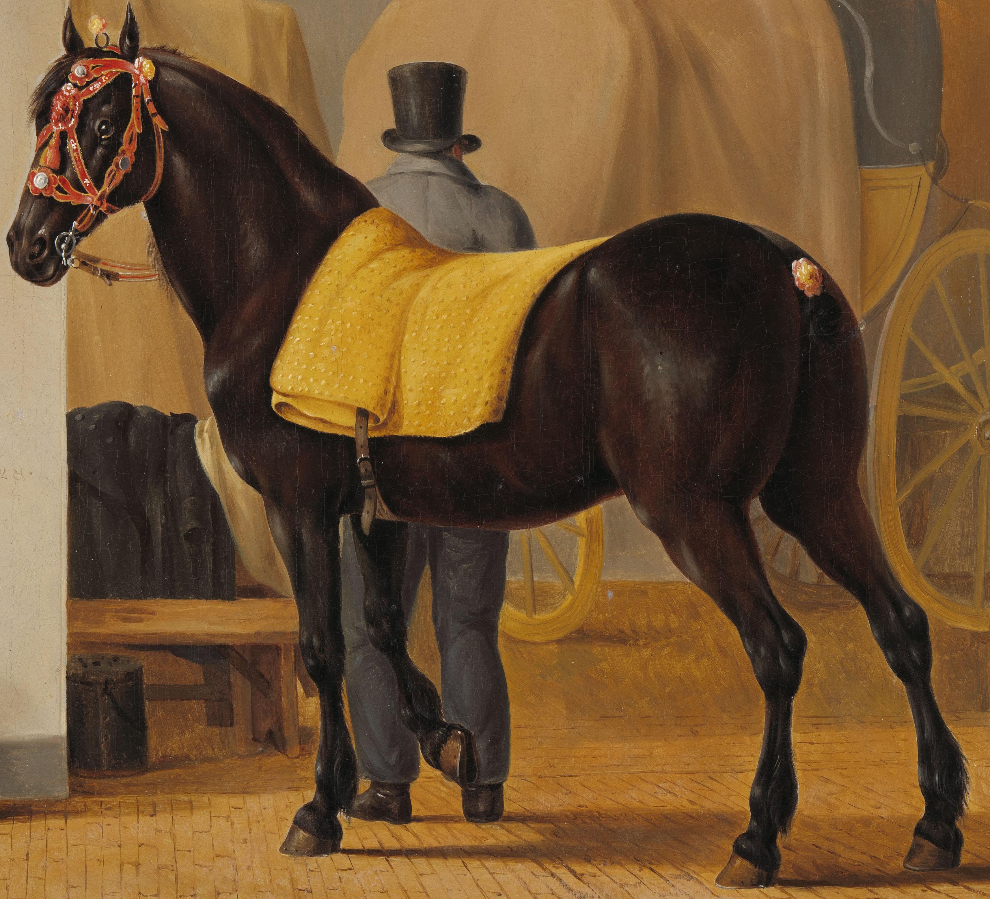 Het prijswinnende paard De Rot heeft een versierd hoofdstel en de staart is volgens de laatste mode à l’anglaise (op zijn Engels) opgebonden en versierd met een rozet. Het doorkijkje in het koetshuis laat maar liefst twee rijtuigen zien, waarvan één in modieus geel, net als het rugkleed over het paard. De initialen van eigenaar Van der Hoop staan op de groene emmer.