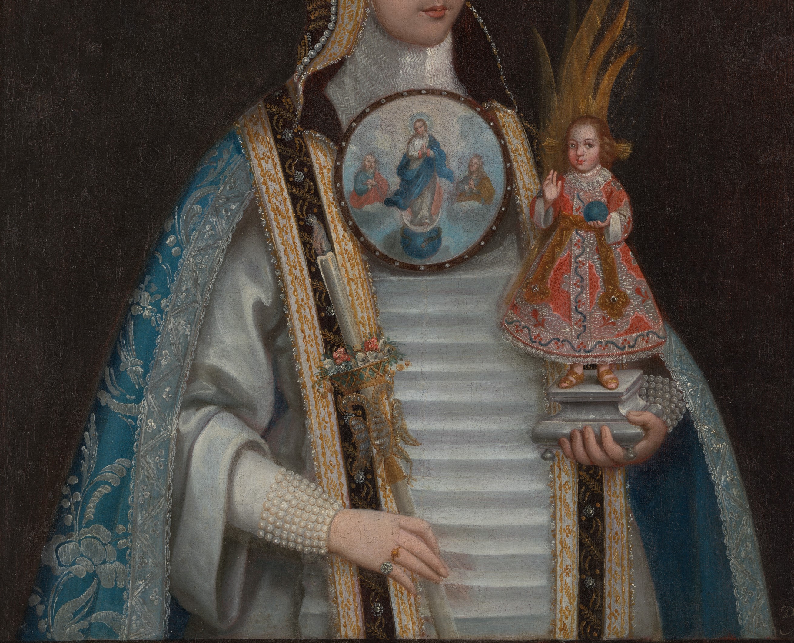 This painting exemplifies an unusual type of portraiture that is unique to colonial Mexico. It commemorates the ceremony during which a sixteen-year-old girl professed the vows of a Conceptionist nun and entered the Mexico City convent of Regina Coeli. She wears the profession regalia of the Order of the Immaculate Conception, including the characteristic nuptial crown and rings that identify her as a "bride of Christ." She is dressed in the distinctive habit of the order, popularly known as "blue nuns," after the color of their robes. Over her heart, she wears a large pictorial badge that depicts the Virgin Mary flanked by her parents, Saint Joachim and Saint Anne. The wearing of such badges was a practice unique to Conceptionist and Jeronymite nuns. She carries a small, dressed sculpture of the Christ Child who raises his right hand in blessing and, in the other hand, holds a blue globe that symbolizes his dominion over the world. The use of such images as devotional aids was widespread, especially among women, who often received them as gifts from their mothers or other female relatives. Sometimes called "crowned nuns," portraits like this one not only record the appearance of a young woman at the time of her religious profession, but they also portray the taking of a new name and identity. Sor Juana de Nuestra Señora de Guadalupe, formerly Juana Valdés, has assumed a religious identity as well as a patriotic one, whose new name references the patroness of New Spain. The portrait would have been displayed in the home of her parents, where it not only recalled the presence of an absent child but also served as a visible marker of the family’s piety, wealth, and social prestige.