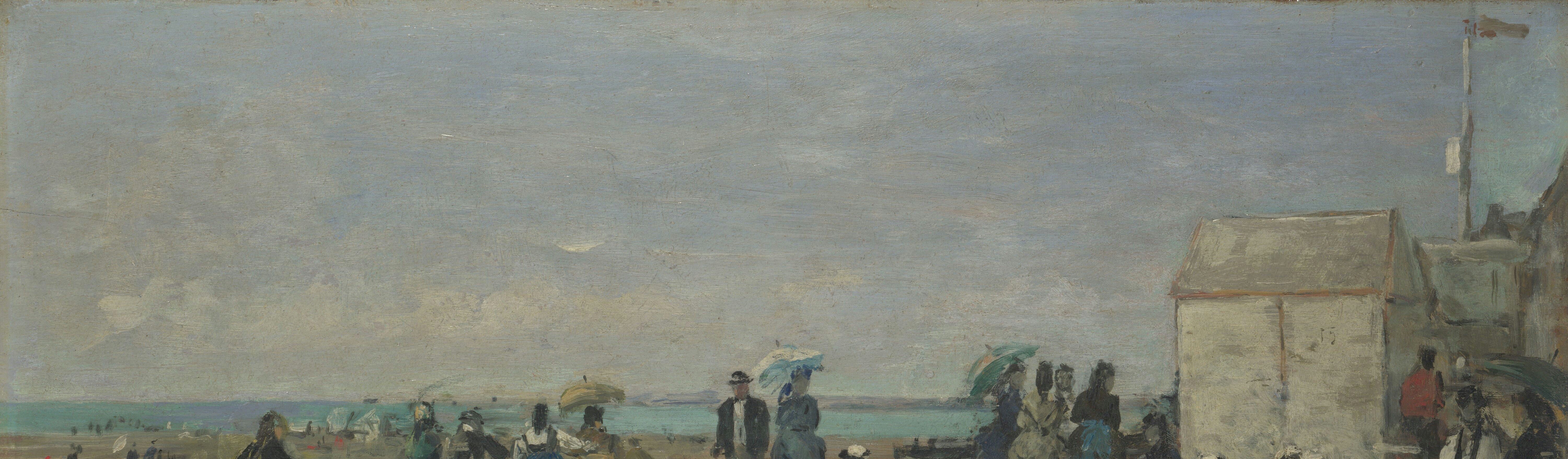 This painting, together with Boudin’s Beach Scene, Trouville, was owned by Monet, who also grew up on the Normandy coast and described Boudin as his master, claiming that he had opened his eyes to the beauty of nature. The fashions suggest that the paintings were probably not conceived as a pair, but were painted at different times. Monet was working alongside Boudin during the summer of 1870 and it has been proposed that one of the women in his The Beach at Trouville is Boudin’s wife. Unlike that picture, however, which features Monet’s family in close-up, the people on Boudin’s beach are anonymous strangers seen from some distance.