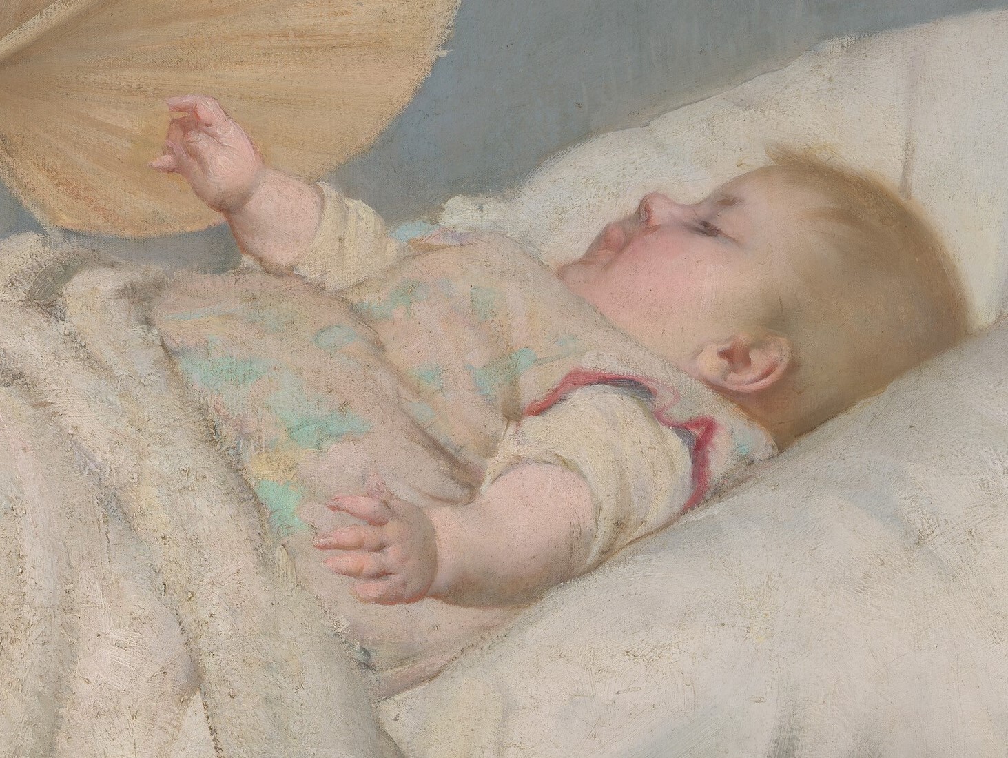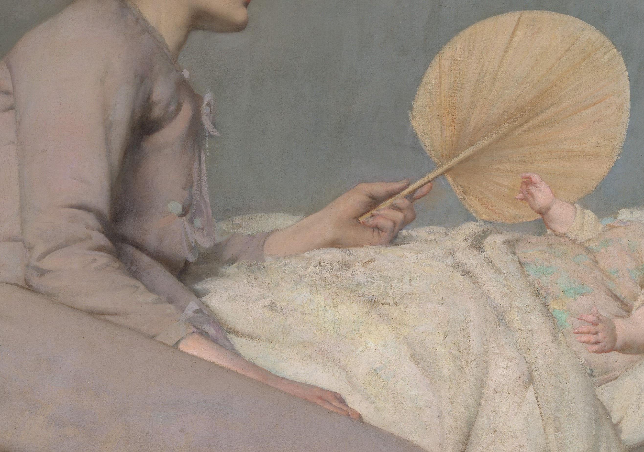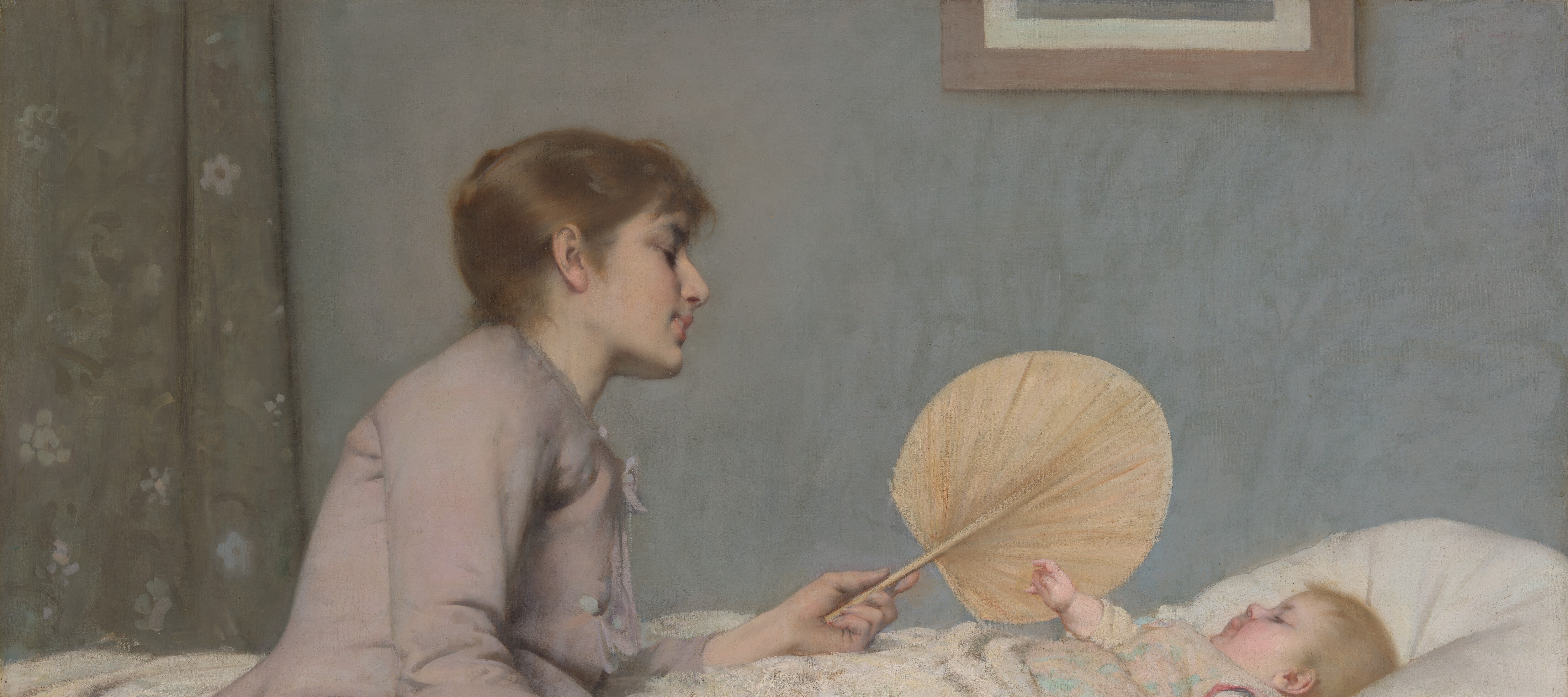 The young mother shows the artist’s wife, Topsy, and their first child, Ralph, who had been born in 1890. Pale and slim after a long winter spent in their one-room apartment that was divided by a curtain into sleeping and eating quarters, Topsy gently waves a palm fan over the outstretched arms of her baby son. The subject of mother and child, which had its origins in the depiction of the Madonna and Child, continued to be a popular subject for nineteenth-century artists, who attempted to record their personal and secular experiences with tenderness and conviction.