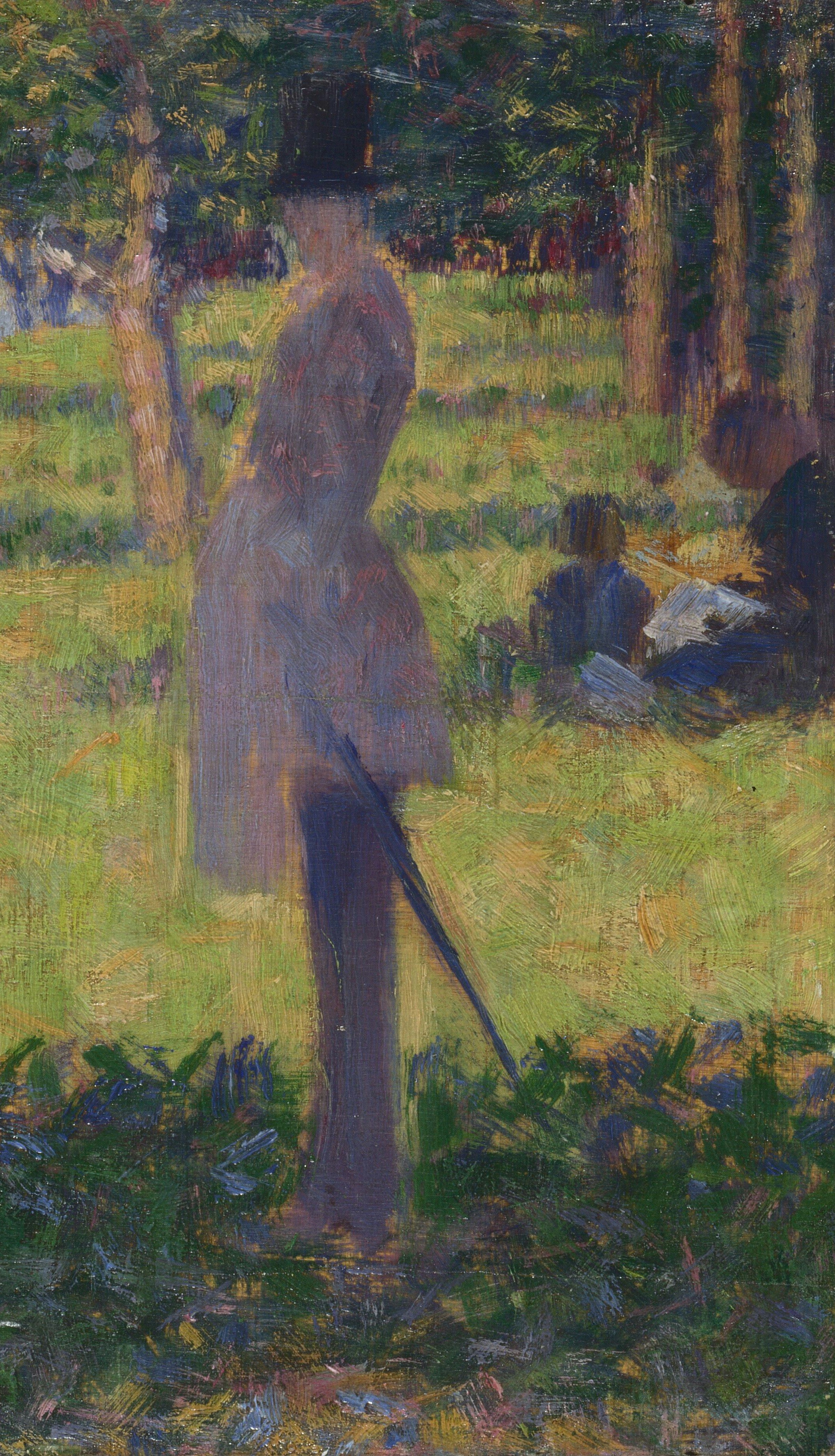 Here we see a man standing rigidly, reduced to his essential outline with no incidental detail. Seurat had already included him in an earlier oil sketch, and he appears in the final painting where he is accompanied by an elegantly dressed woman. Like most of the people in the Grande Jatte, he is shown in profile as he looks straight ahead at the river. He wears a black top hat, a long grey jacket or coat and dark trousers, which identify him as a member of the middle or upper classes and, perhaps, as a dandy. He also holds what might be a walking cane or a furled umbrella and what may be a folded blanket or groundsheet.