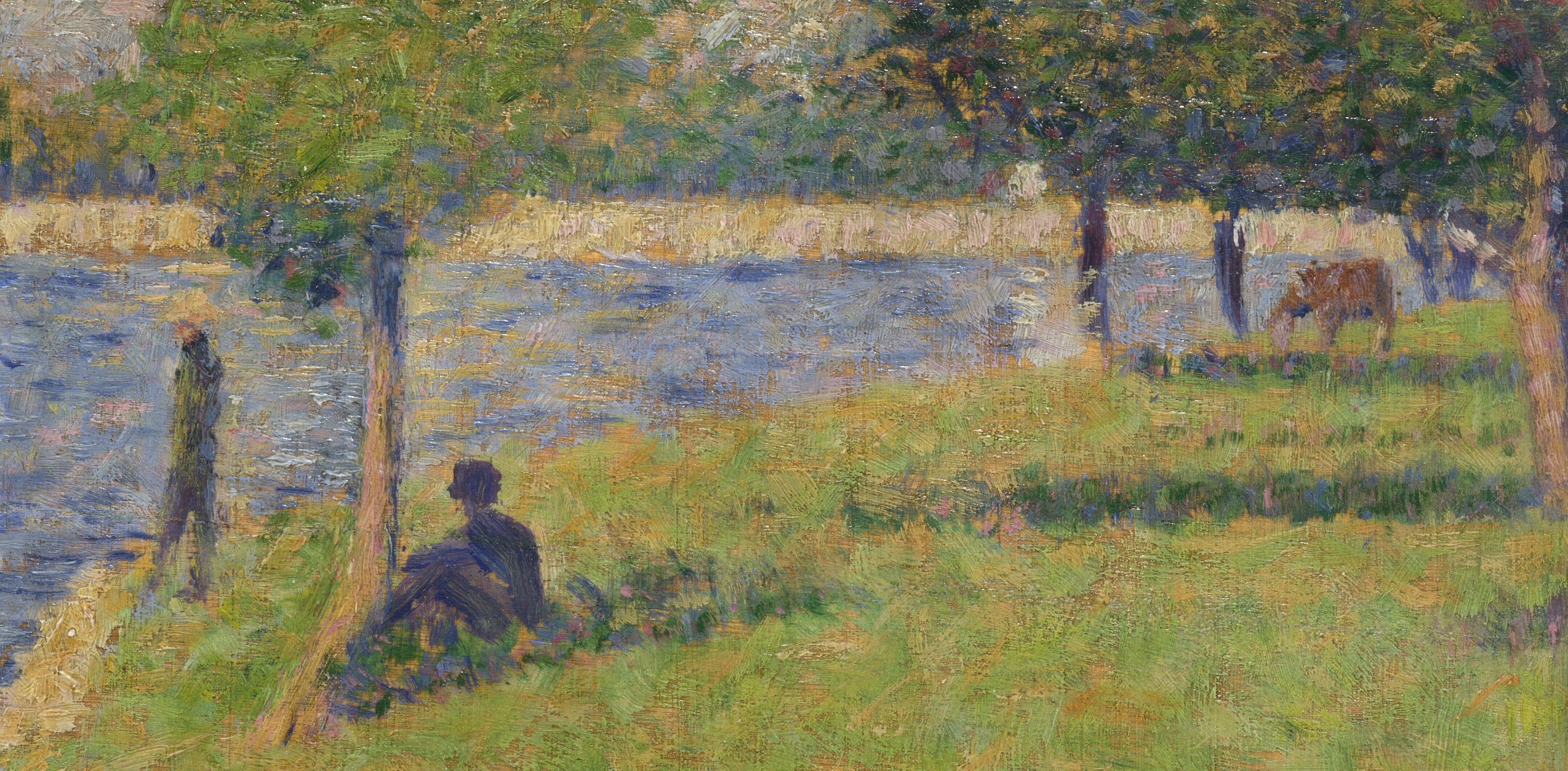 It is possible that Seurat painted this study in the studio rather than on location. As in many of the sketches and paintings he made along this area of the river Seine, he attends to the interplay between the horizontal and vertical lines offered by the location, which provided a ready-made architecture or grid within which he could arrange individual elements. Here the man’s rigid upright pose, which gives him the look of a tailor’s mannequin, forms a strong vertical that visually rhymes with the trees.