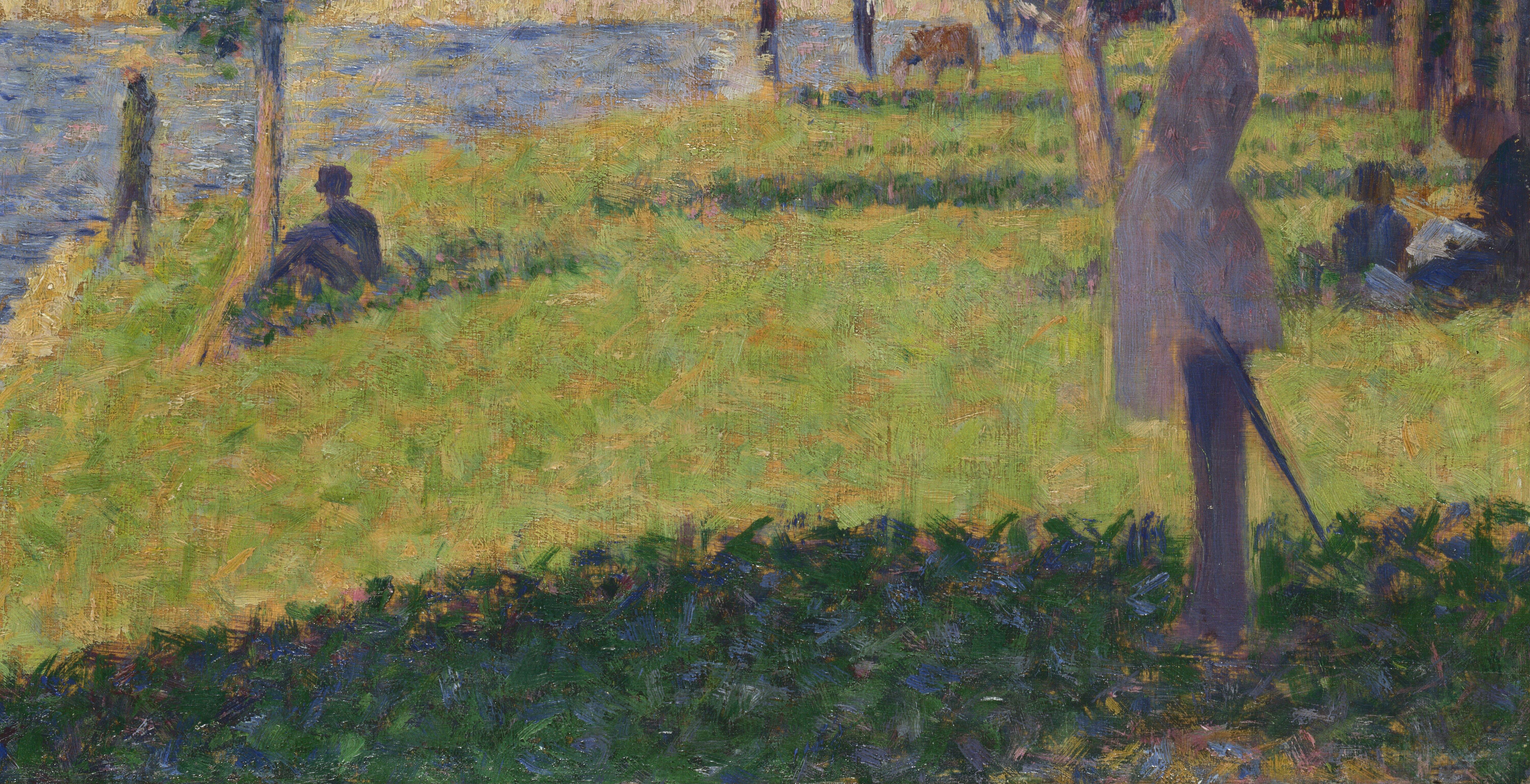 As in the Grande Jatte, the large grassy area fills most of the picture. Seurat has divided this between a shaded foreground (with a preponderance of blue alongside a dark green) and a sunlit middle area (where a golden-yellow is combined with a light green). Compared to the other Study for ‘La Grande Jatte’ in the National Gallery’s collection, there is a reduced range of colours. As Seurat had not yet fully developed the pointillist technique he used in the painitng itself, the sketch may date to 1884–5.