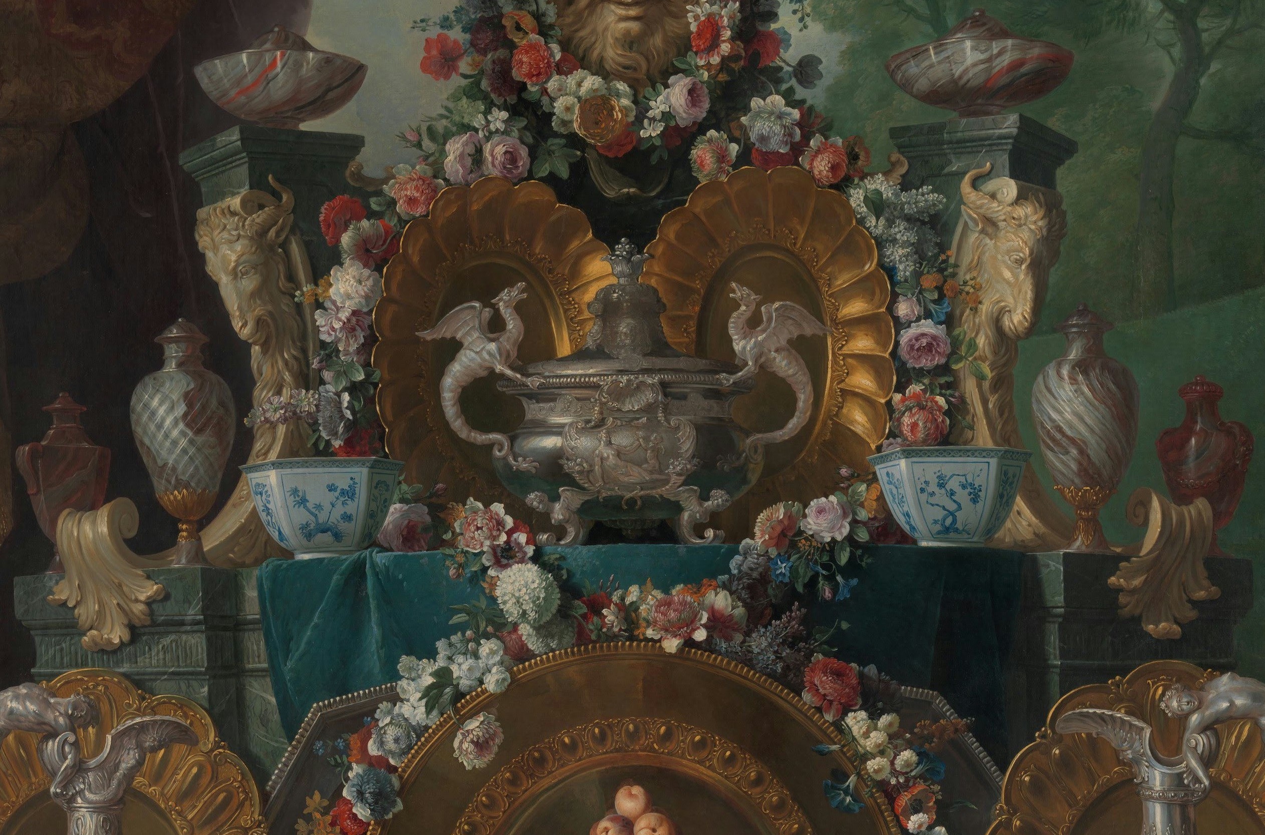 Our canvas typifies the evolution of eighteenth-century still-life painting away from the intimate format of the Low Countries toward a distinctively French idiom rich in pomp and spectacle. Here gold and silver vessels are displayed on a tiered console table laden with fruit and flowers. The composition is monumental in scale. Although the canvas is not dated, the dragon-handled tureen and vermeil salvers are in the Régence style (ca. 1715–23).