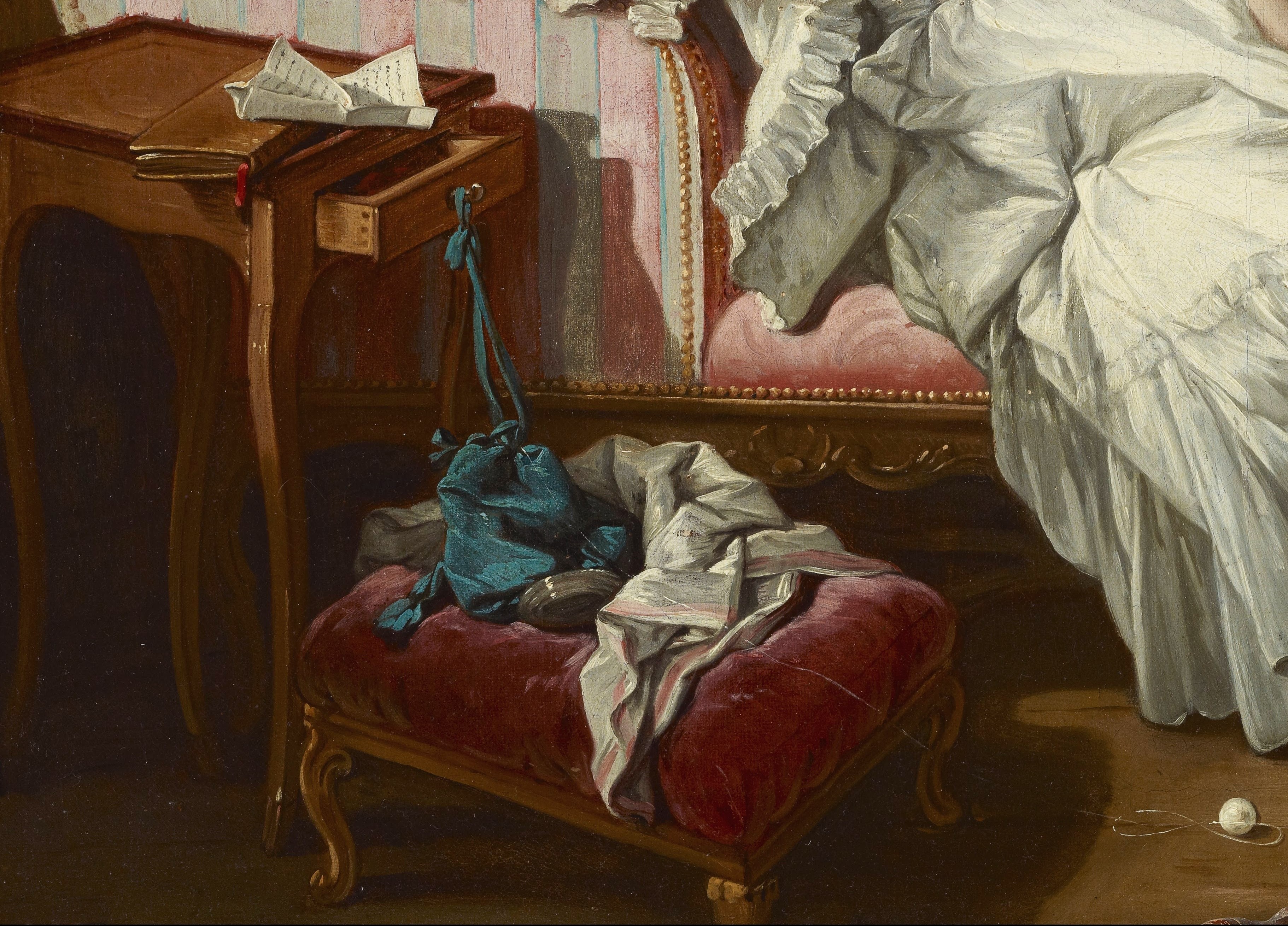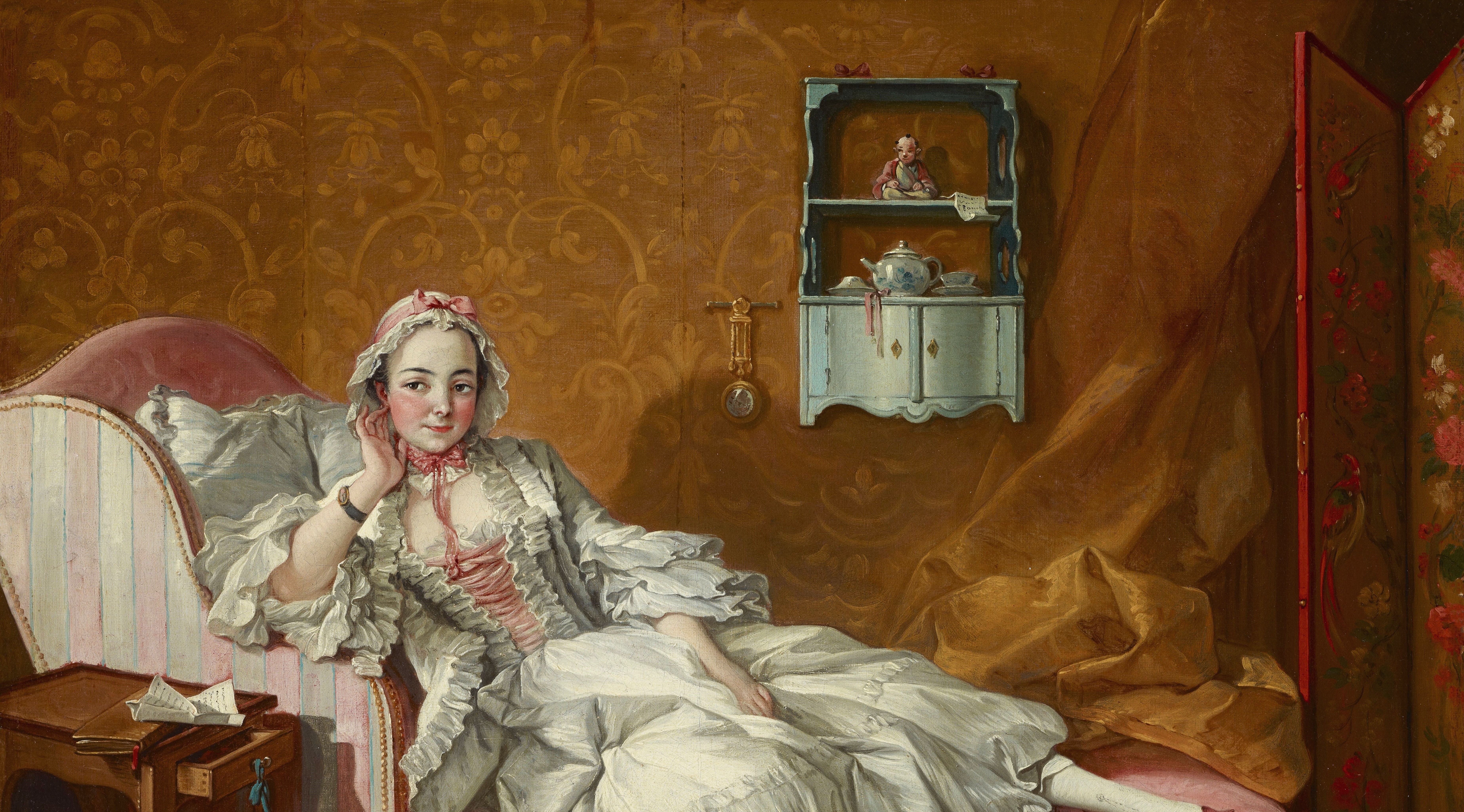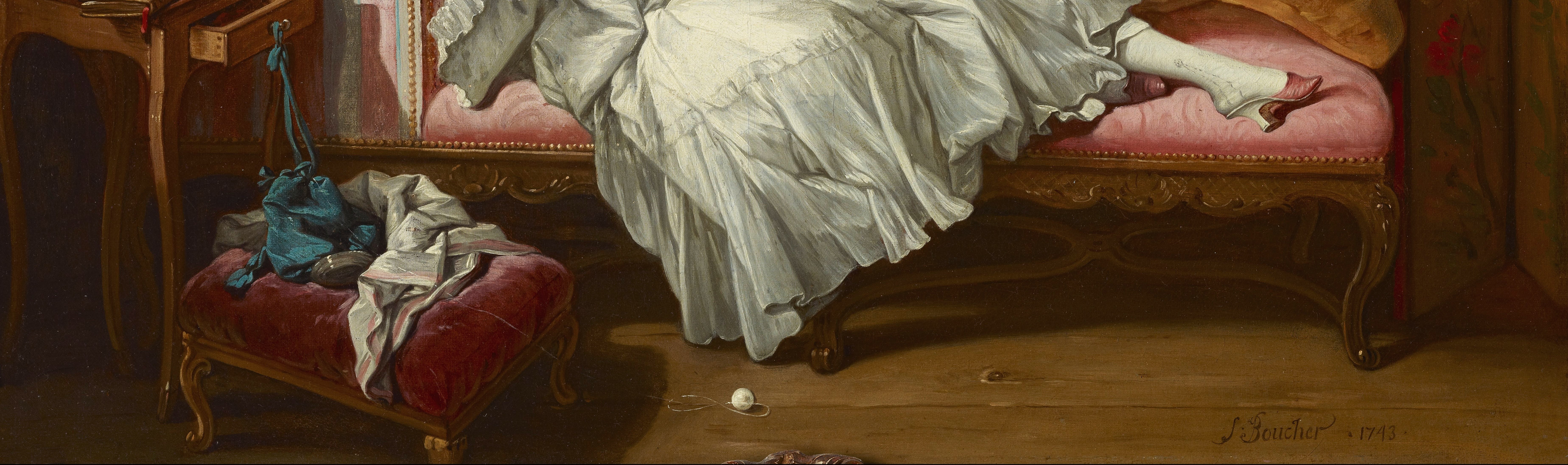 Boucher was among the most prolific and influential artists in France during the reign of Louis XV. Once thought to be a portrait of the artist's wife, Marie-Jeanne Buzeau--a painter who made miniatures after her husband's compositions--this painting is instead part of a series of genre scenes Boucher created with erotic overtones, a type produced for the delectation of male patrons and collectors. The sensuously reclining fashionable woman is surrounded with furnishings and objects of luxury, including the day bed, an eighteenth-century invention that developed alongside trends in Parisian society for socializing in private homes. With its half-open drawer, unfolded letter left on top of a closed book, and a jumble of items strewn on the stool beneath her, the domestic setting prompts intrigue. Hanging from the wall-mounted cabinet that carries a porcelain statuette, teapot, and cups and saucers is another letter that bears the artist's signature.