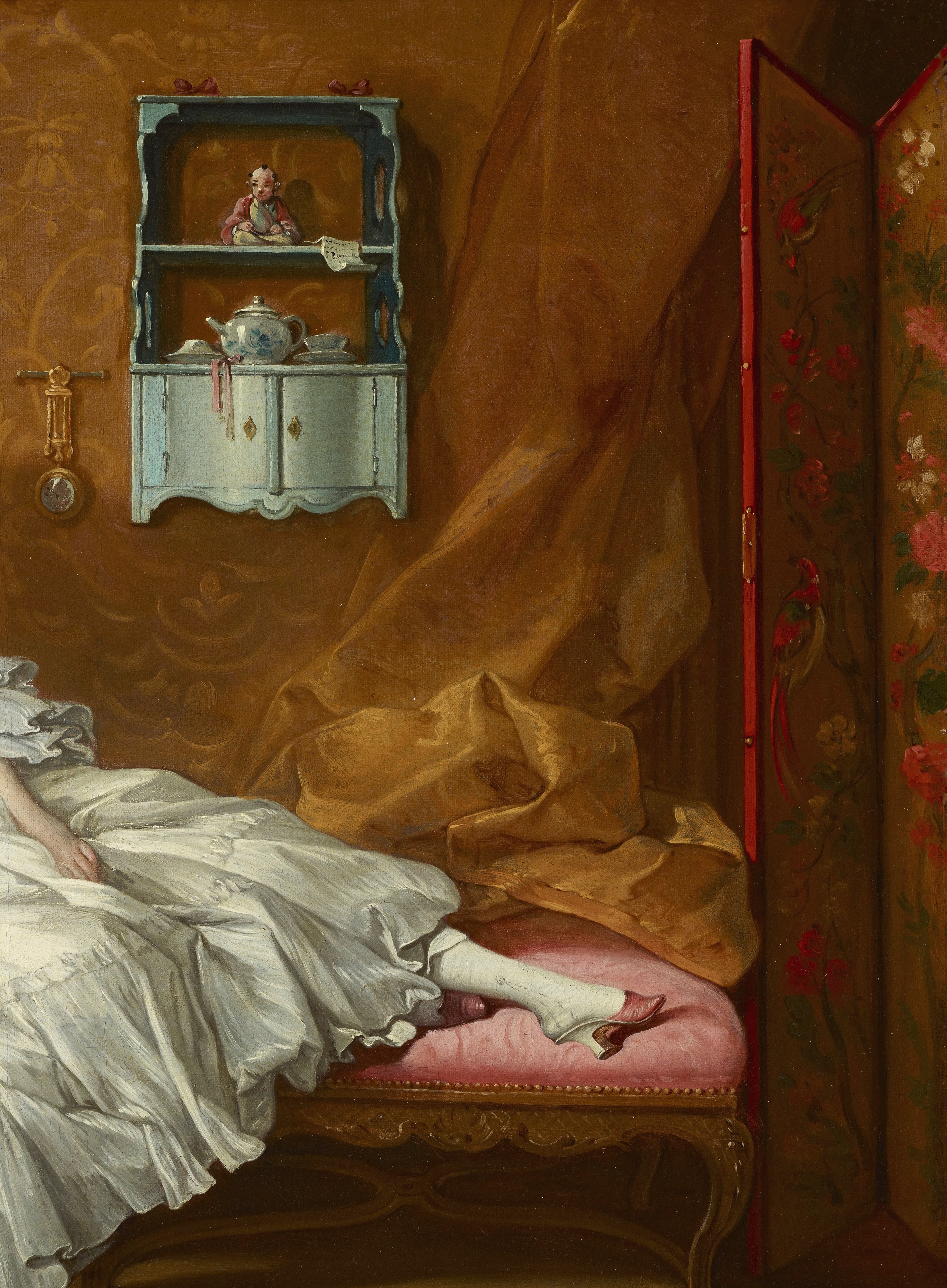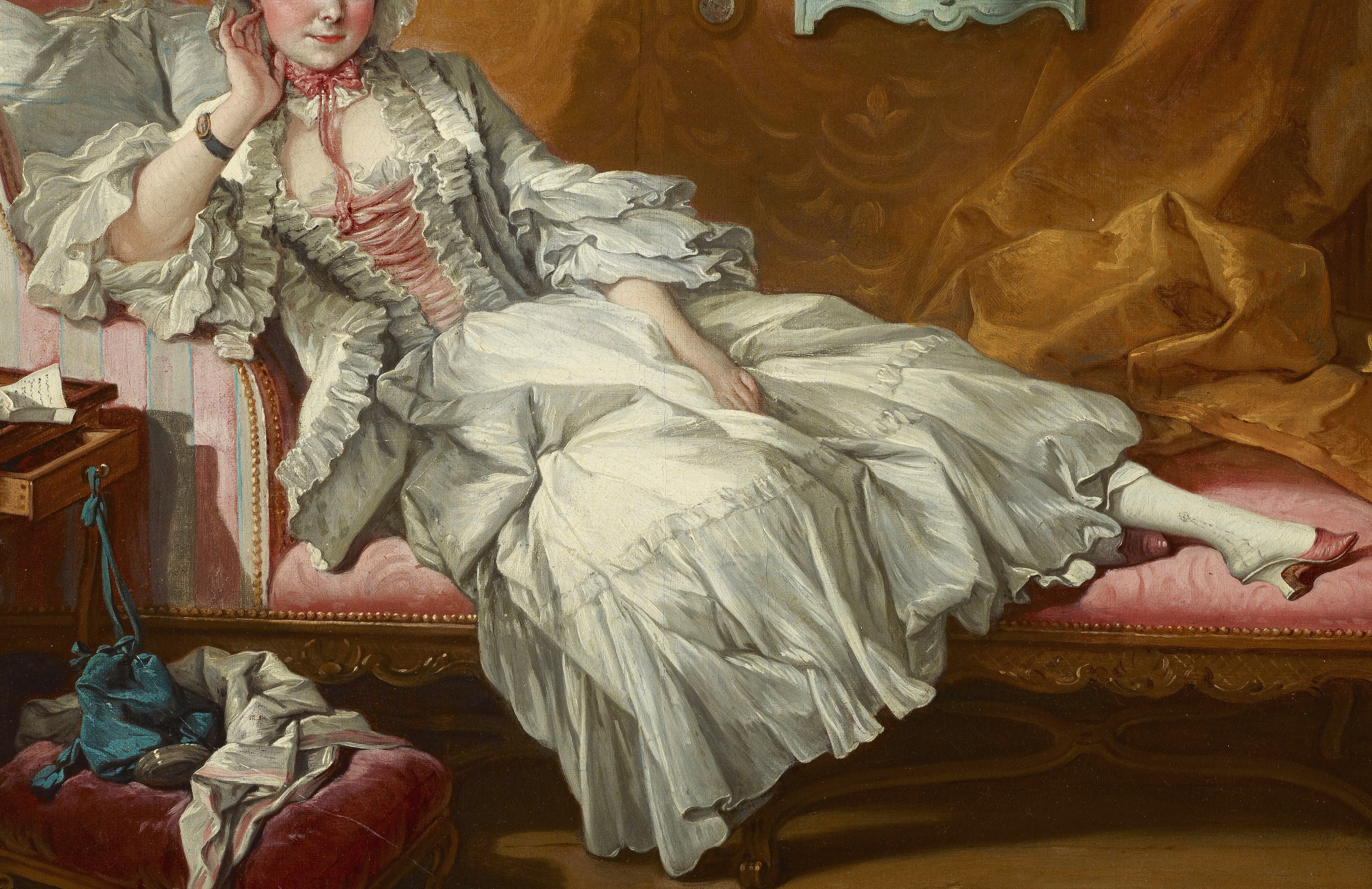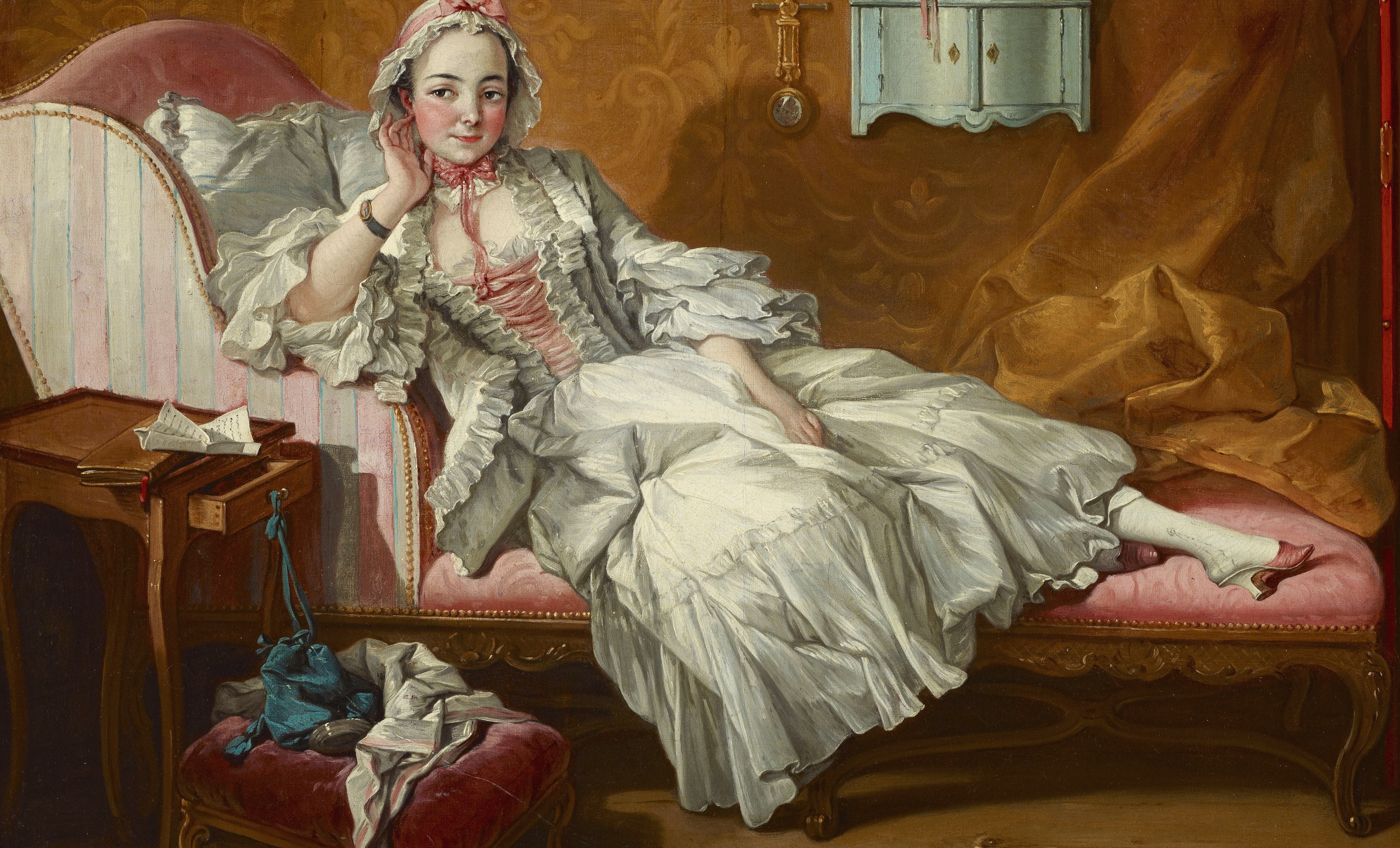 Boucher was among the most prolific and influential artists in France during the reign of Louis XV. Once thought to be a portrait of the artist's wife, Marie-Jeanne Buzeau--a painter who made miniatures after her husband's compositions--this painting is instead part of a series of genre scenes Boucher created with erotic overtones, a type produced for the delectation of male patrons and collectors. The sensuously reclining fashionable woman is surrounded with furnishings and objects of luxury, including the day bed, an eighteenth-century invention that developed alongside trends in Parisian society for socializing in private homes. With its half-open drawer, unfolded letter left on top of a closed book, and a jumble of items strewn on the stool beneath her, the domestic setting prompts intrigue. Hanging from the wall-mounted cabinet that carries a porcelain statuette, teapot, and cups and saucers is another letter that bears the artist's signature.