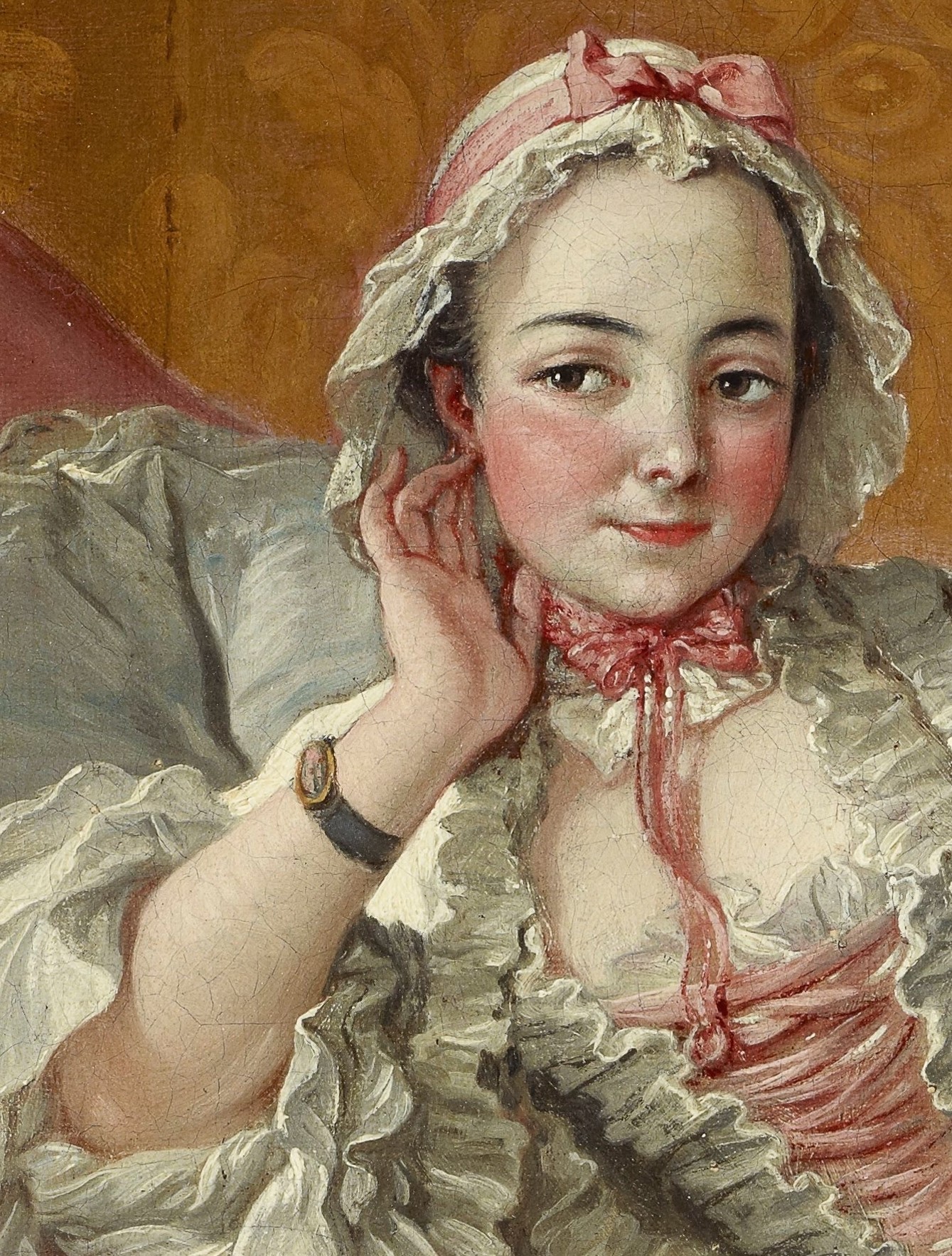 When Marie-Jeanne Buzeau (1716–after 1786) posed so pertly for this informal portrait ten years after her marriage to Boucher, she was twenty-seven and the mother of three children. She frequently served as model for her husband, and in later life she painted miniature reproductions of his more popular pictures and made engravings after his drawings. Besides offering such a candid image of the artist’s wife, the portrait provides a fascinating glimpse of a room in the apartment to which Boucher had moved the year before he signed this canvas on the rue de Grenelle-Saint-Honoré. The porcelain figurine and tea service on the hanging étagère reflect Boucher’s taste for the Oriental bric-a-brac so fashionable throughout the eighteenth century. In its composition the portrait is a witty parody of the classical Renaissance depictions of Venus by Giorgione and Titian, and as such the picture has acquired the sobriquet “Boucher's Untidy Venus.”