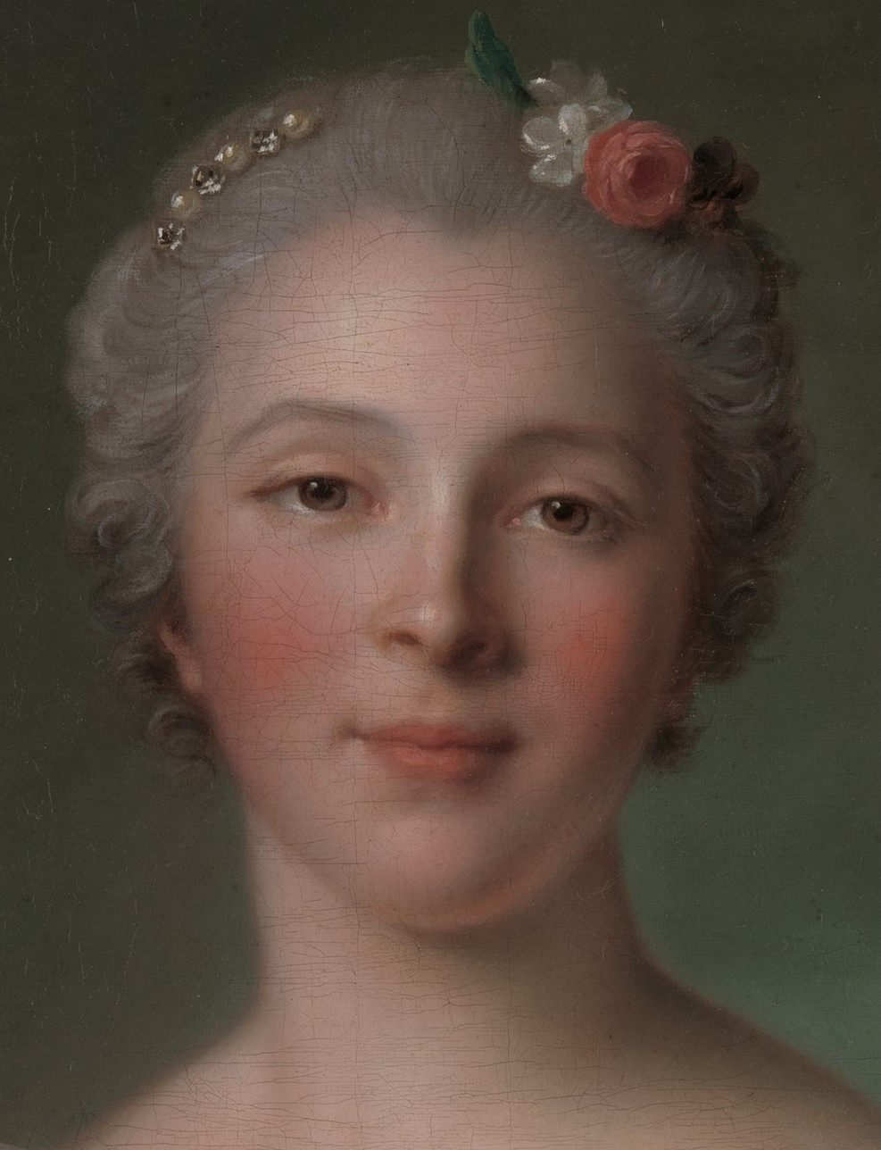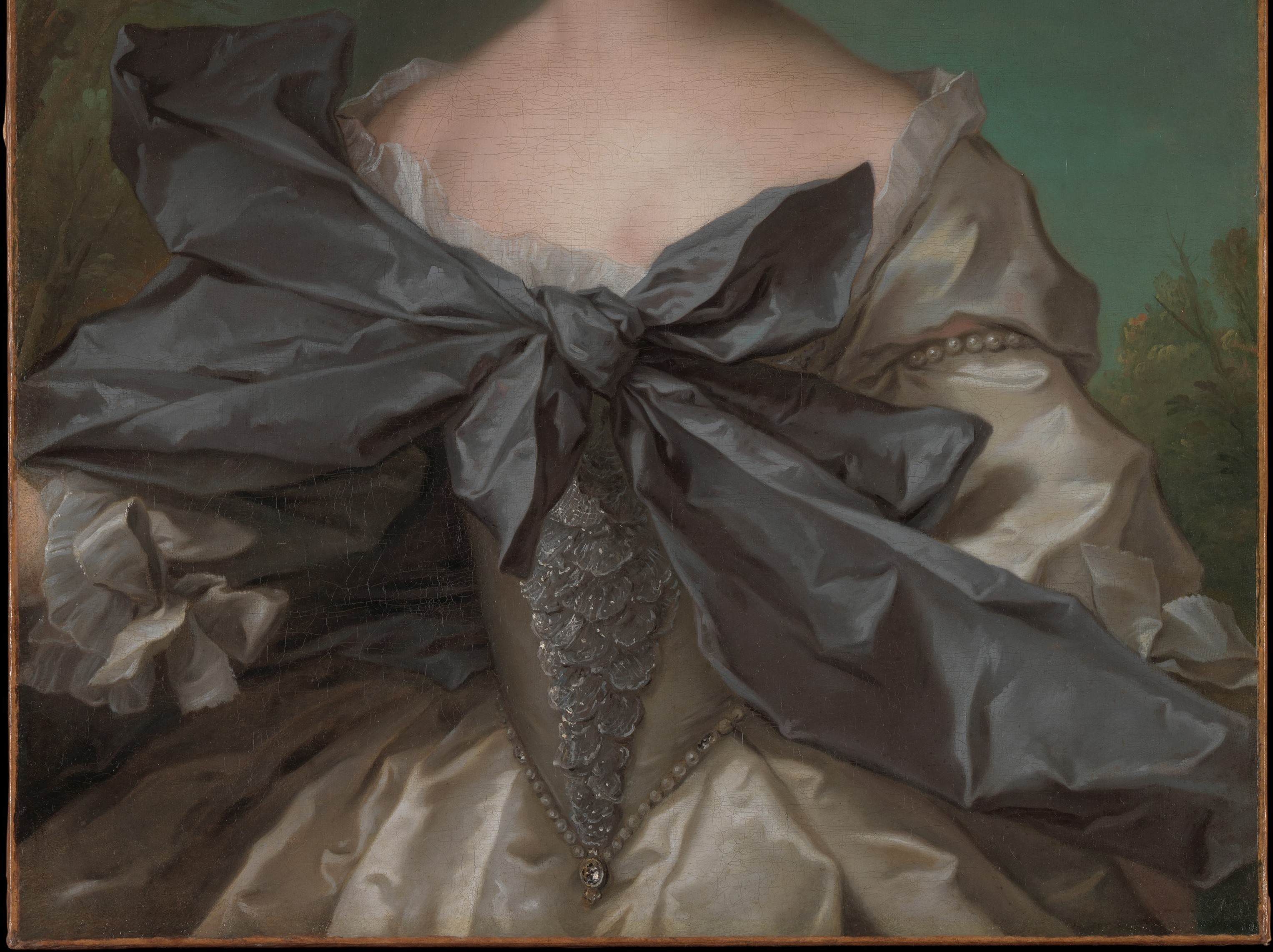 This straightforward half-length shows the young marquise in a ruffled chemise under a white dress with a pale gray pointed bodice trimmed with lace and pearls. An extravagant length of taffeta-like fabric is knotted at her breast. The trees, some with leafless branches, are unusual for a portrait in this format.