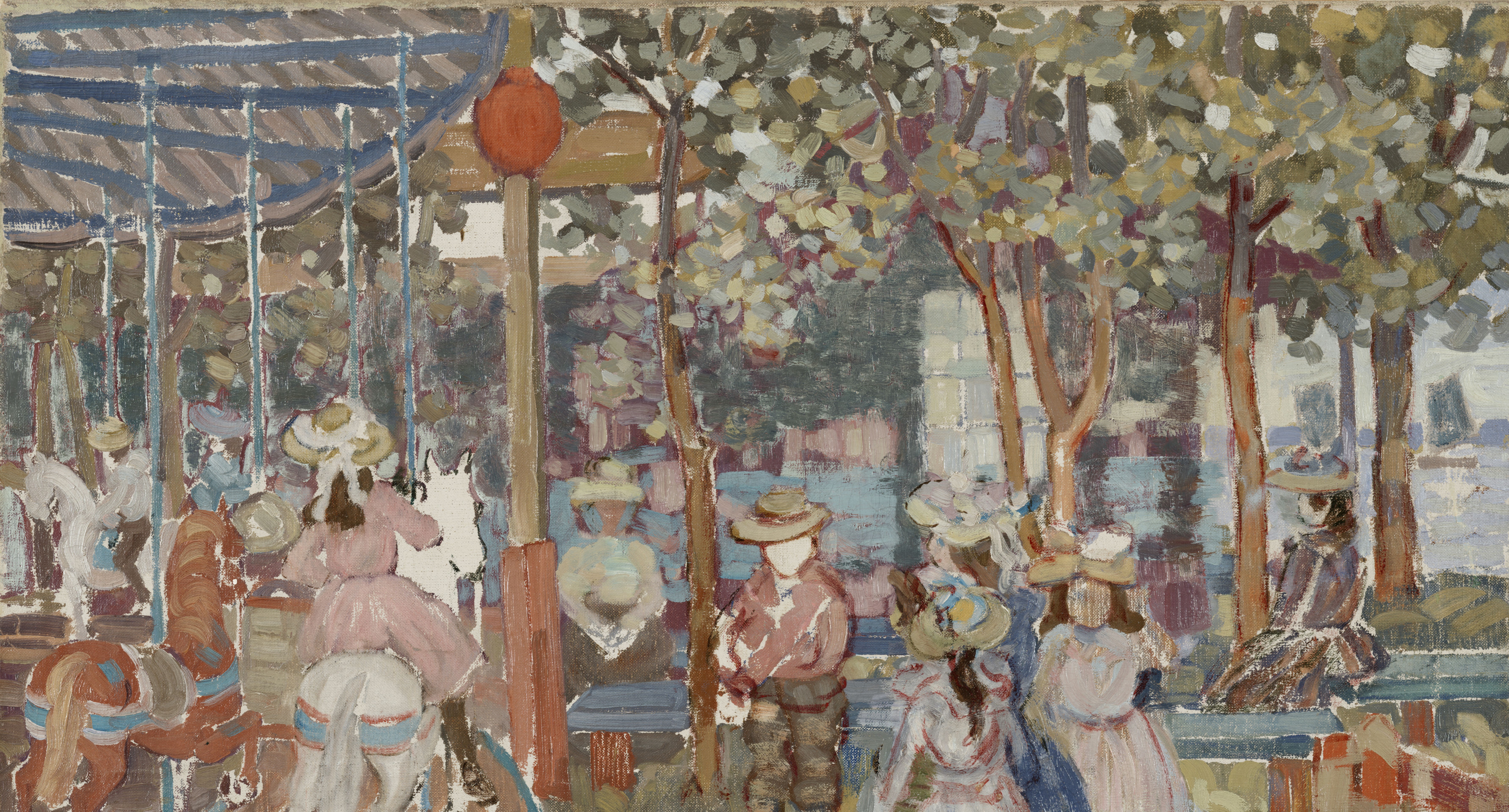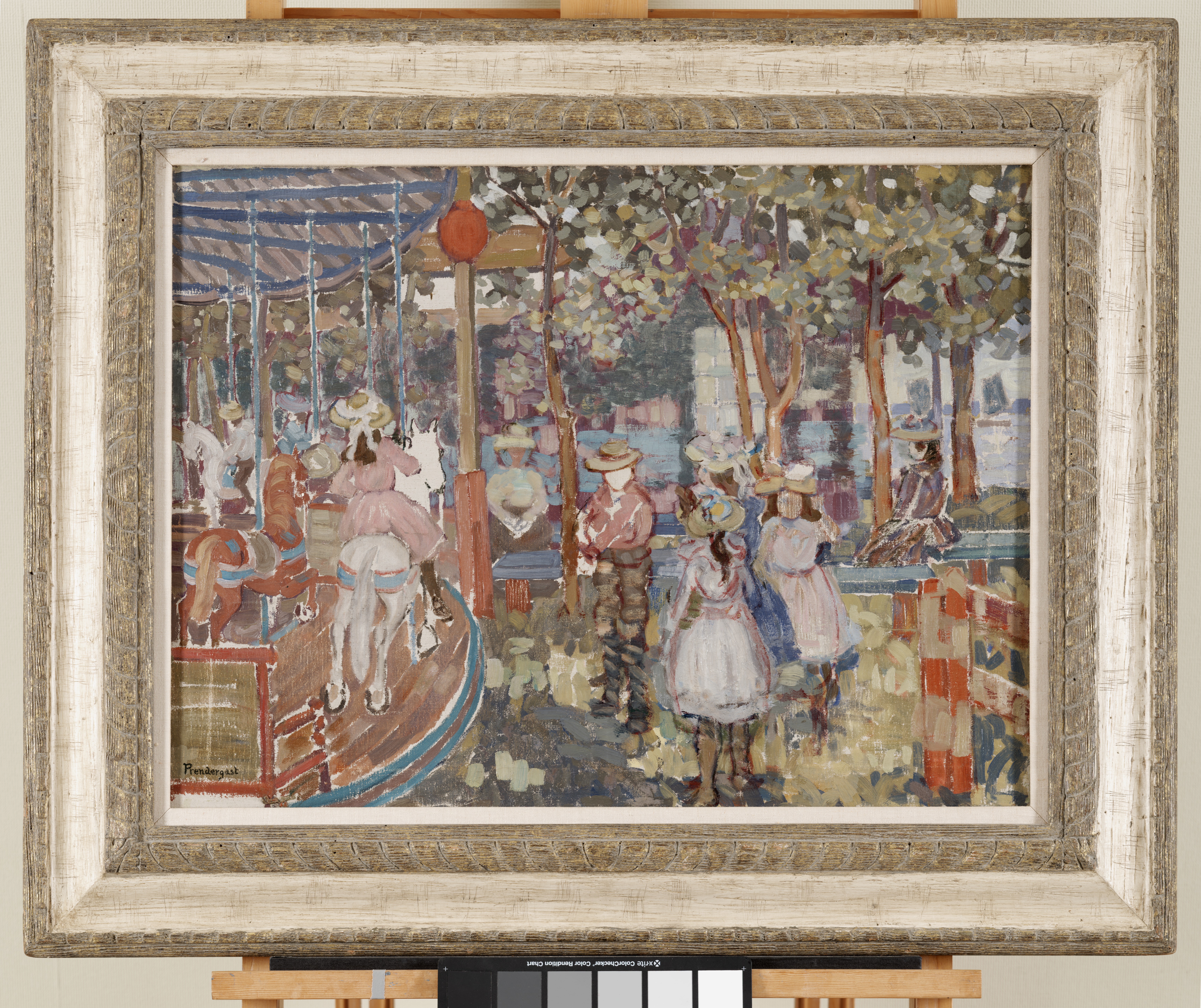 This bright and joyful scene of children playing on a carousel is one of only four paintings that the American artist Maurice Prendergast dedicated to this theme. With its compartmentalized areas of muted color and line, Merry-Go-Round is a cross between naturalist representation and decorative abstraction. Prendergast developed this unique style in the 1890s during two extensive trips to Europe. While there, he took inspiration from the flat, ornamental aesthetic of the Nabis in France, in addition to the colorful designs of Italian stained-glass windows. In spite of these international influences, Prendergast’s subjects were drawn from New York and Boston, where he lived most of life. This scene may in fact represent a carousel that was located along Paul Revere Beach Boulevard (originally Railroad Avenue) just north of Boston. This painting’s handsome frame is thought to have been made by the artist’s brother, Charles Prendergast, a painter and renowned designer of modern American frames.