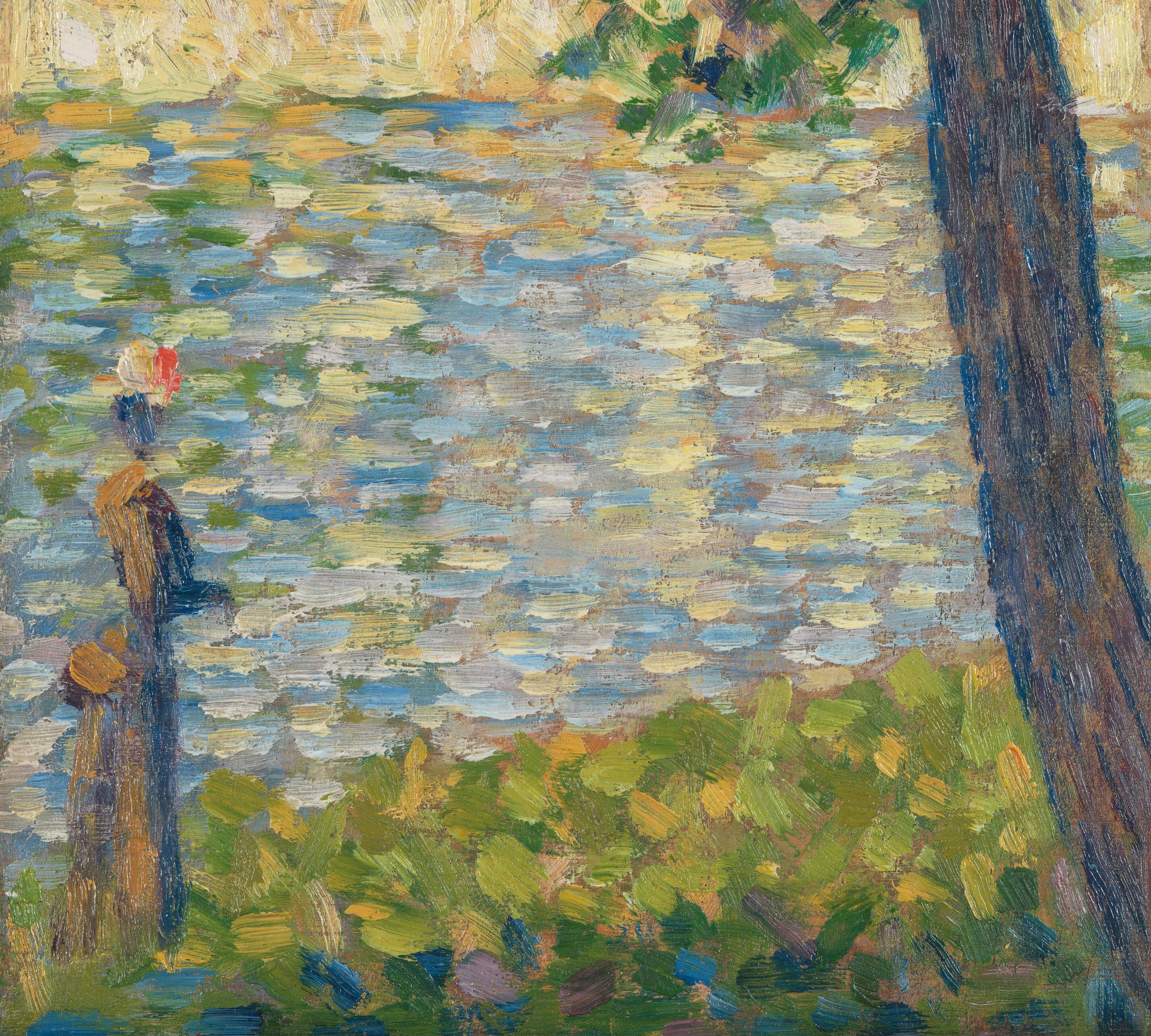 A focus on the underlying structure of the scene is a feature of Seurat’s art, but his application of the paint softens the geometry of the composition. Although Seurat had developed his pointillist technique by 1885, his debt to Impressionism is still evident here, and the freshness of his brushwork especially recalls the earlier work of Monet and Pissarro. Seurat worked rapidly, leaving traces of the bare wood of the panel visible between the brushstrokes. Unlike in some of his sketches, he has not built up the brushwork in layers, although some areas are more densely worked (for example, the roof tops where the colours have mixed together while still wet). The individual strokes themselves are relatively large and fluid, unlike the tighter, more uniform brushwork of pointillism, and are laid down as clean, unmixed colours. Seurat has also modified them according to the object or surface they describe. For example, he has used horizontal lozenge-like strokes for the shimmering water (which recall Monet’s brushwork in Bathers at La Grenouillère), shorter, choppier strokes for the grass and foliage, and longer, sinuous strokes for the tree trunk. The pale yellows and whites used throughout much of the painting create an effect of warm sunlight and contrast with the dark border formed by the tree and the touches of dark green at the very bottom of the picture.