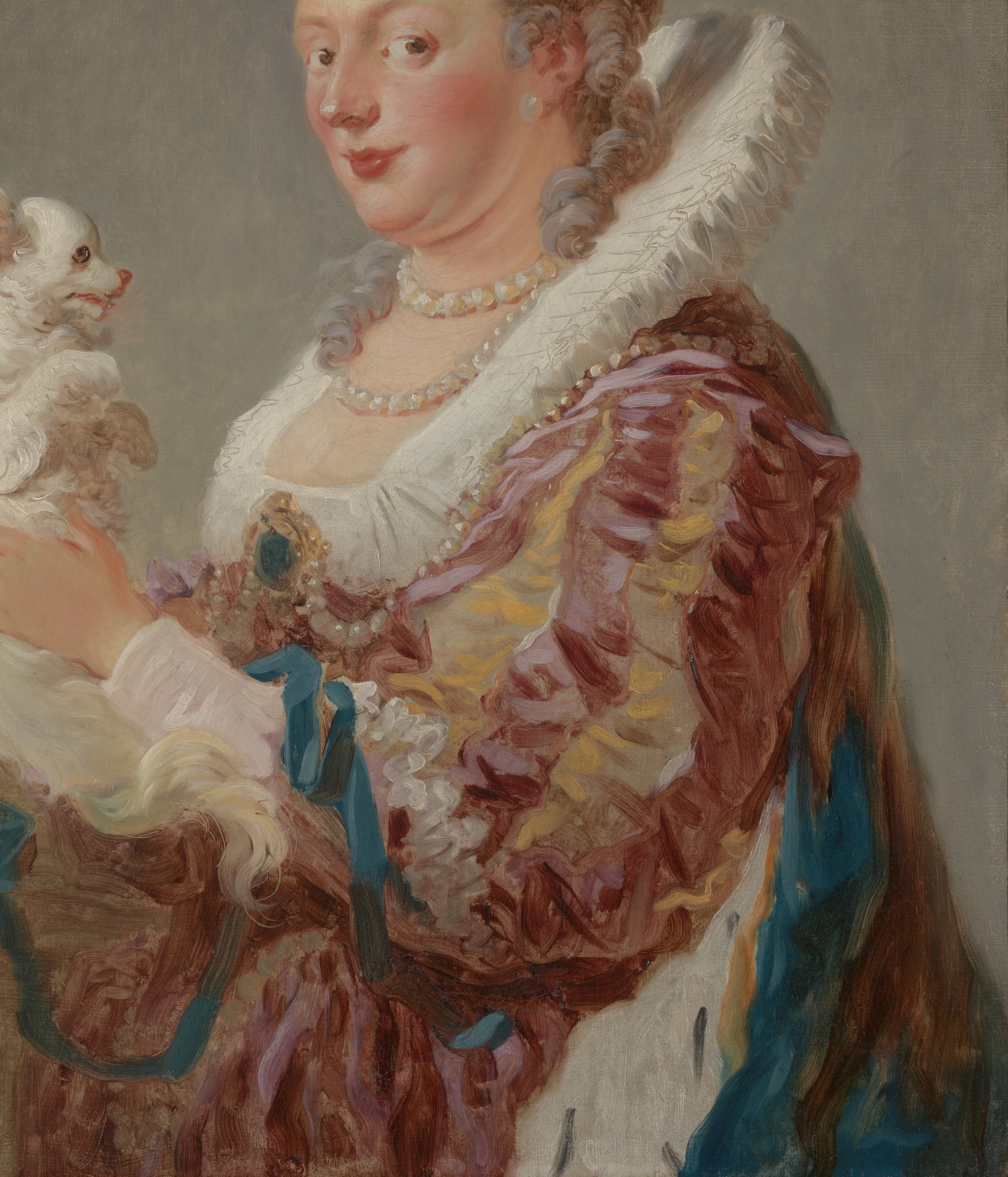 Fragonard’s so-called fantasy portraits are electric performances: brushed with virtuosity, panache, and speed, he reworked the surface while the paint remained wet, including by incising lines into the large white ruff. The theatrical costume recalls Queen Maria de’ Medici’s court dress from over a century earlier, as depicted in a series of paintings by Peter Paul Rubens that Fragonard saw in the French royal collections. A recently discovered drawing makes it possible to identify this woman as the aristocratic salon hostess Marie Emilie Coignet de Courson. Fragonard’s painterly performance arguably outshines her, however, making this a kind of artist’s self-portrait.