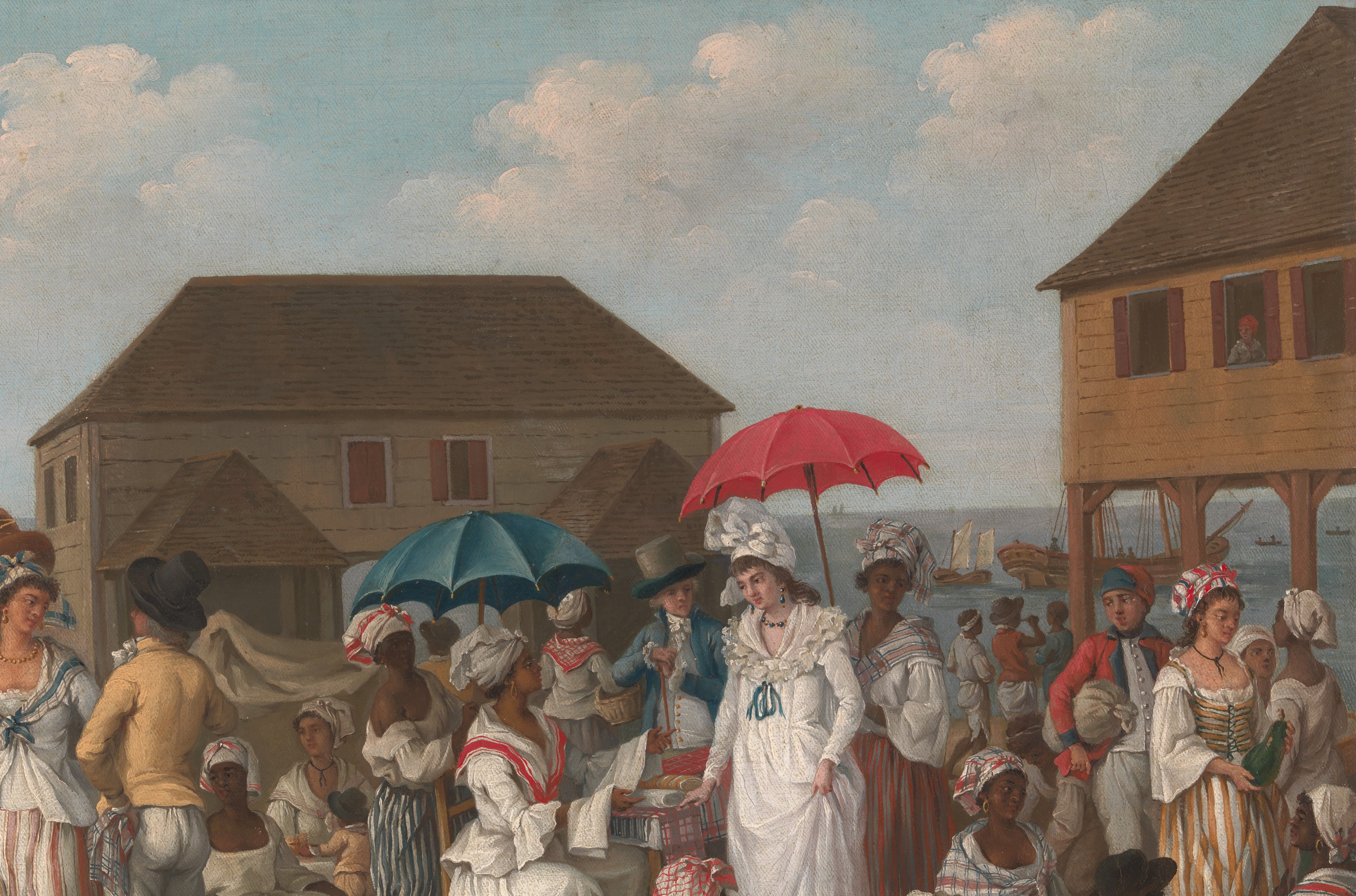 Underneath a bright red parasol held by an attendant, an elegantly dressed woman in white examines textiles for sale. In this bustling linen and vegetable market, enslaved people, free people of color, and white people visit with one another and buy and sell their wares. In this scene, Brunias pays careful attention to textiles, both the linen for sale and the striped and checked cotton worn by women in the market. The ships in the background hint at the global trade networks involved in importing these textiles. Brunias drew on ethnographic images in his work, and here the gazes of the figures reinforce the acts of looking and comparing — heightened by the presence of a woman who surveils the scene from a window. By representing this polite commercial space, Brunias obscures the larger market that drove this economy: the sale of human beings.
