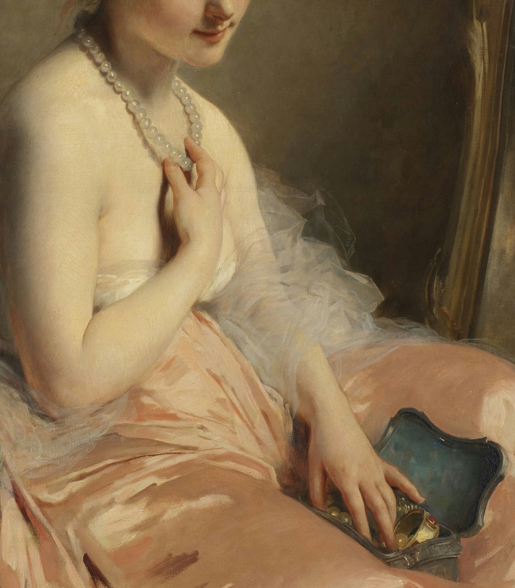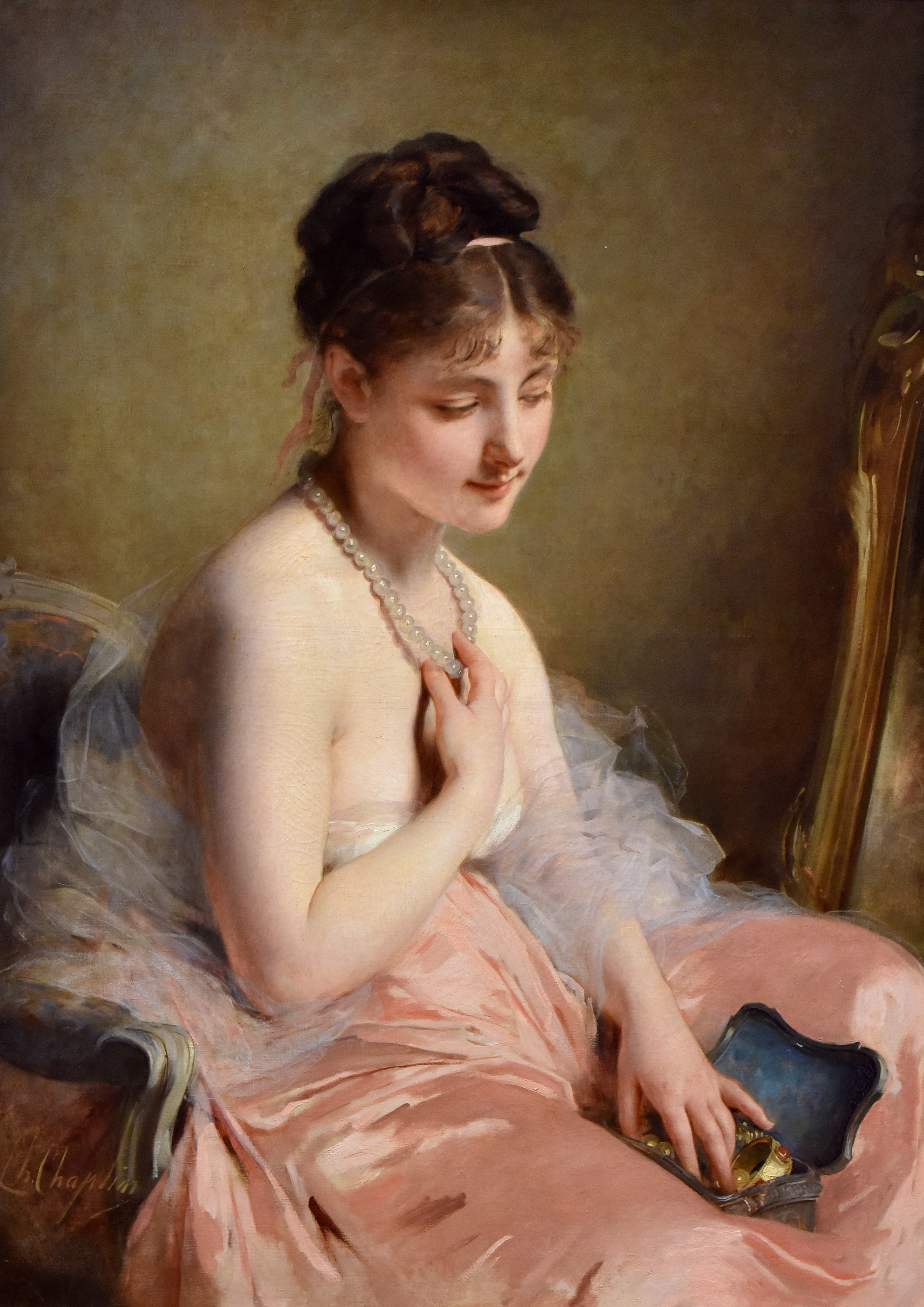 Den halvnakna kvinnan sitter framför en spegel och provar tvekande ett pärlhalsband. Den plastiskt modellerade figuren och det minutiösa stoffmåleriet, var typiska för tidens akademiska tradition. Chaplin var berömd för sina erotiska och objektifierande kvinnoporträtt som köptes av dåtidens aristokrati och finanselit. Han var som många salongkonstnärer påverkad av det sena 1700-talets porträtt och genremåleri.