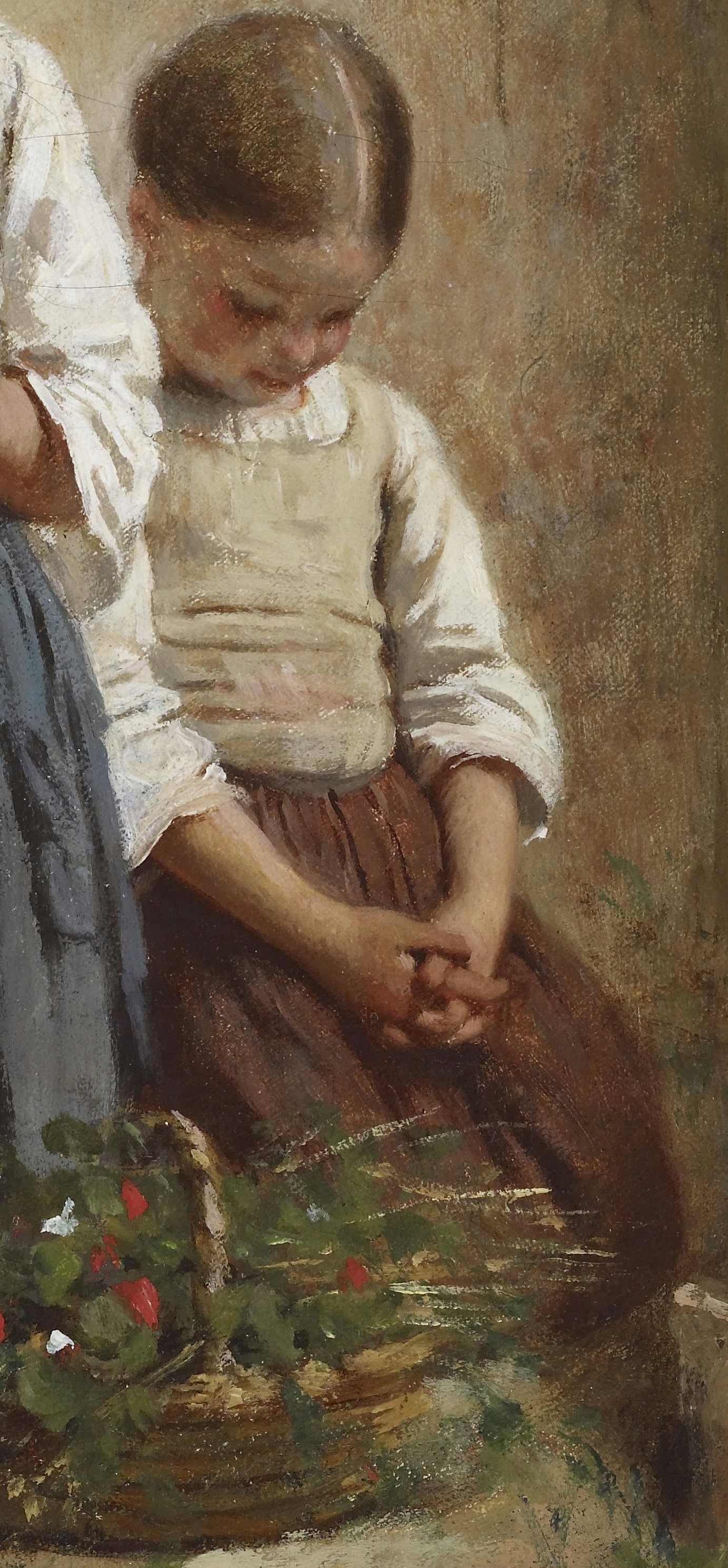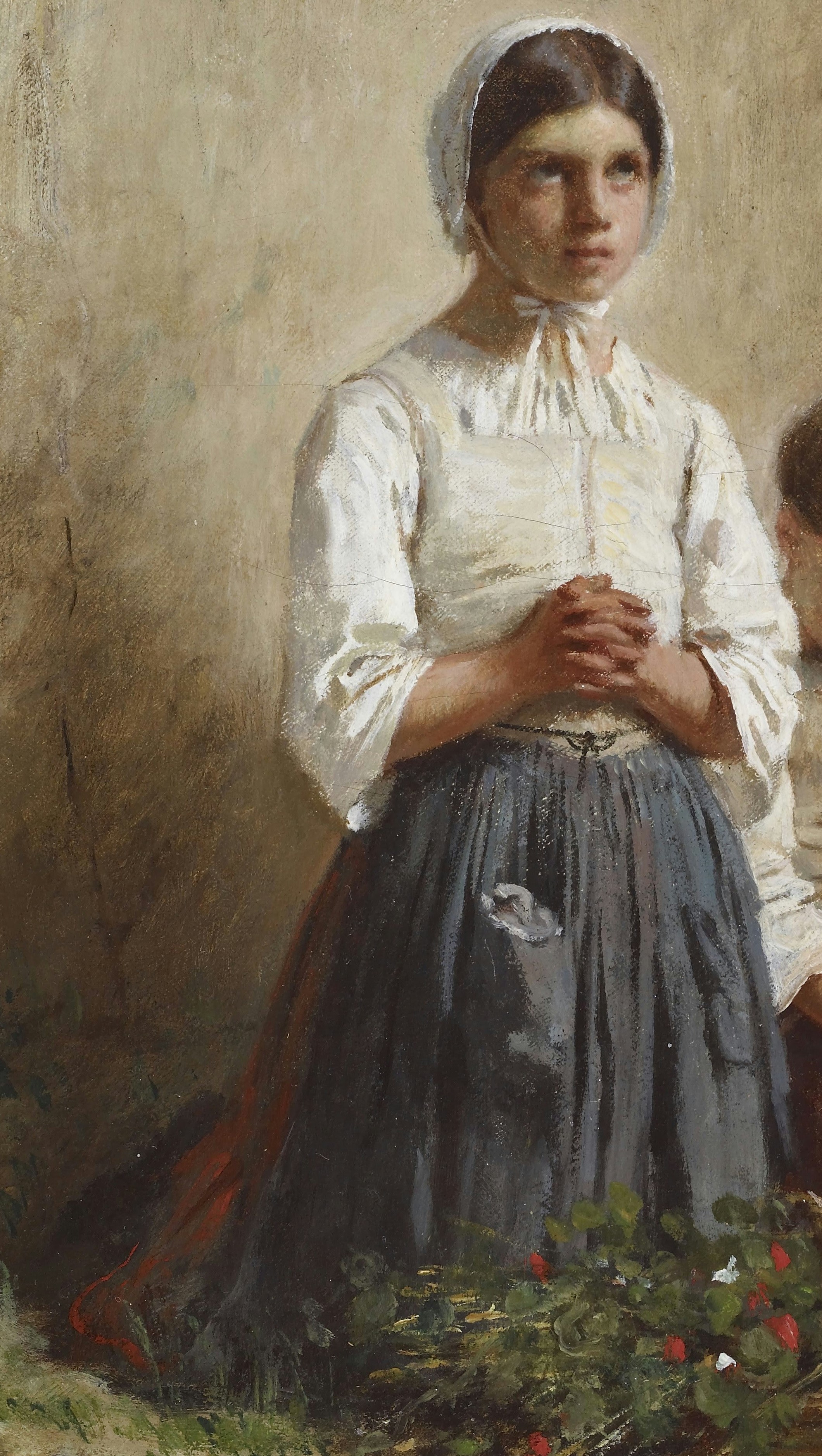 Two peasant girls are kneeling in prayer. In front of them is a basket of flowers and a sickle.
