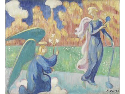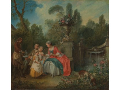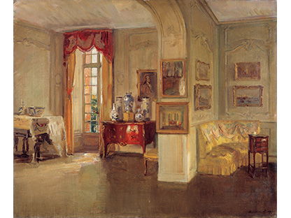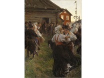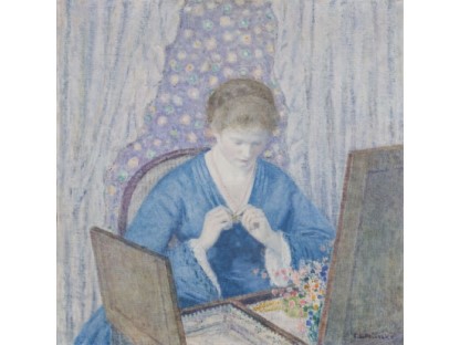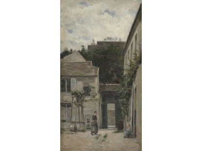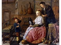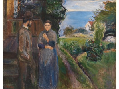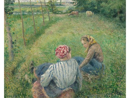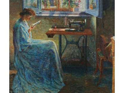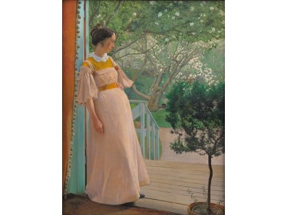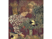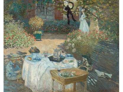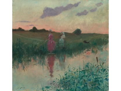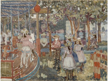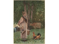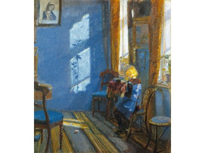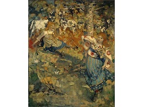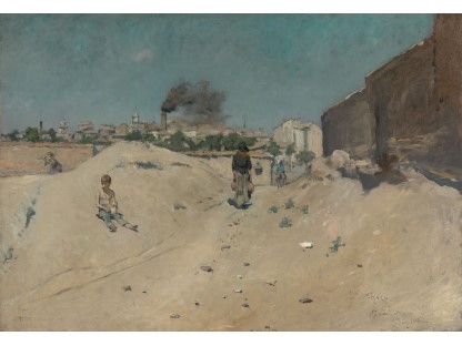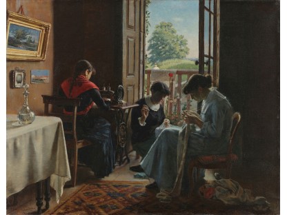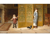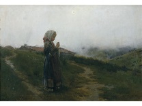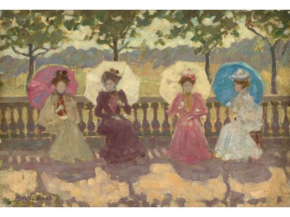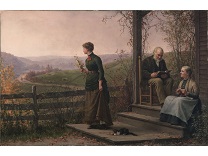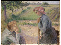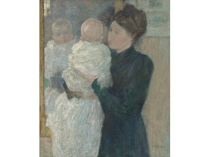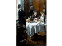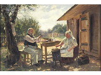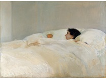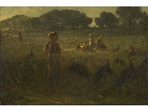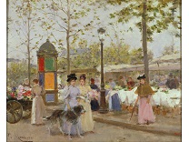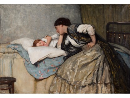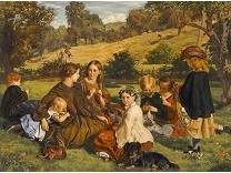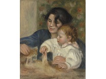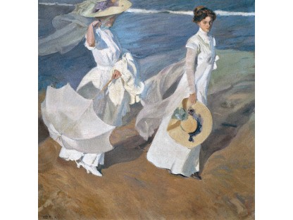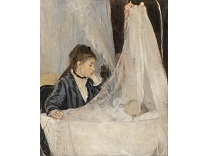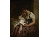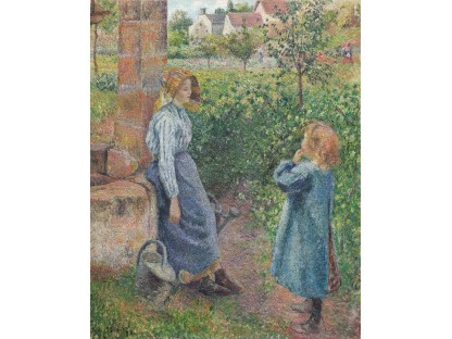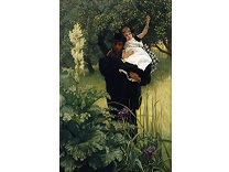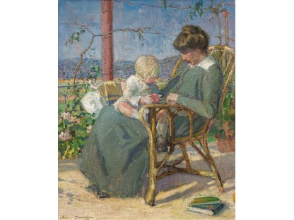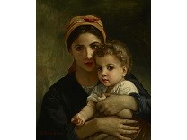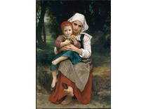 此画描绘了一个阳光明媚的清晨,母亲和孩子散步场景,充分表现了人物的惬意心情以及其中的微风、蓝天的那种恬静美好。