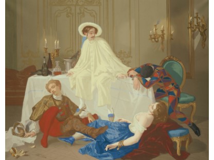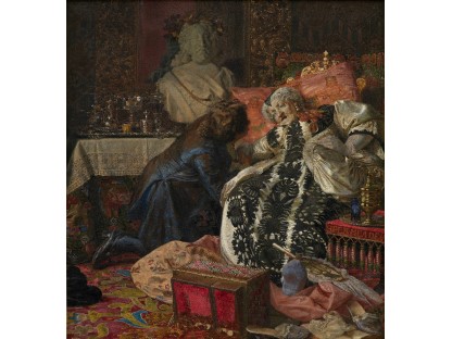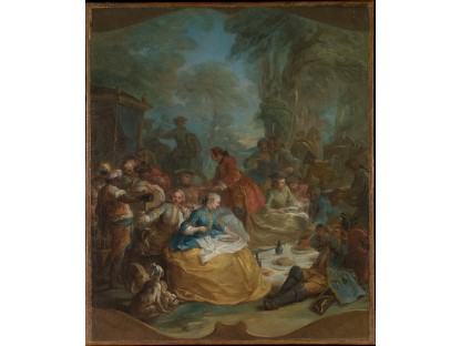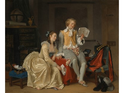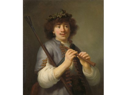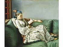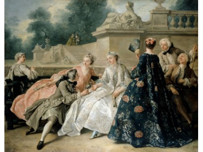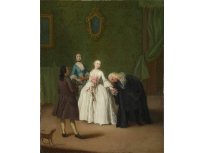 在极尽奢华,灯火通明的房间中,一位衣着考究,手握横笛的男子居中而立,目光直视乐谱正在专注地吹奏着。聚集在他身前是一个带有小提琴、大提琴和羽管键琴编制的小型乐队…