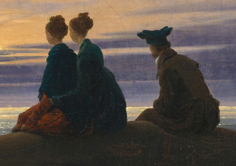Like its companion piece, the evening picture of the diptych was painted in 1822. In Moonrise on the Seashore Friedrich took up one of his favorite themes. In the reflected light of the night sky, it is as though the surface of the water begins to glow all of its own accord, taking up the light of heaven, as it were. Clouds have come up and the round shape of the full moon is half hidden behind the banks of cloud at the horizon. This means that the moonlight does not fall evenly but seems to be breaking out of a gateway in the clouds, creating a magical play of light. Complementary colours, ranging from golden to whitish yellow, violet and blue, define the contrasts of light and shade. There is a sense of the magnitude and unity of the universe. Moved by this wonder of nature, three people sit on rounded rocks near the shore, and their dark silhouettes heighten the effect of the gleaming light of the sky and the sea. Two sailing ships pursue a ghostly course across the water. The sublime drama with the moon as the symbol of hope is imbued with a quality of unearthly beauty.