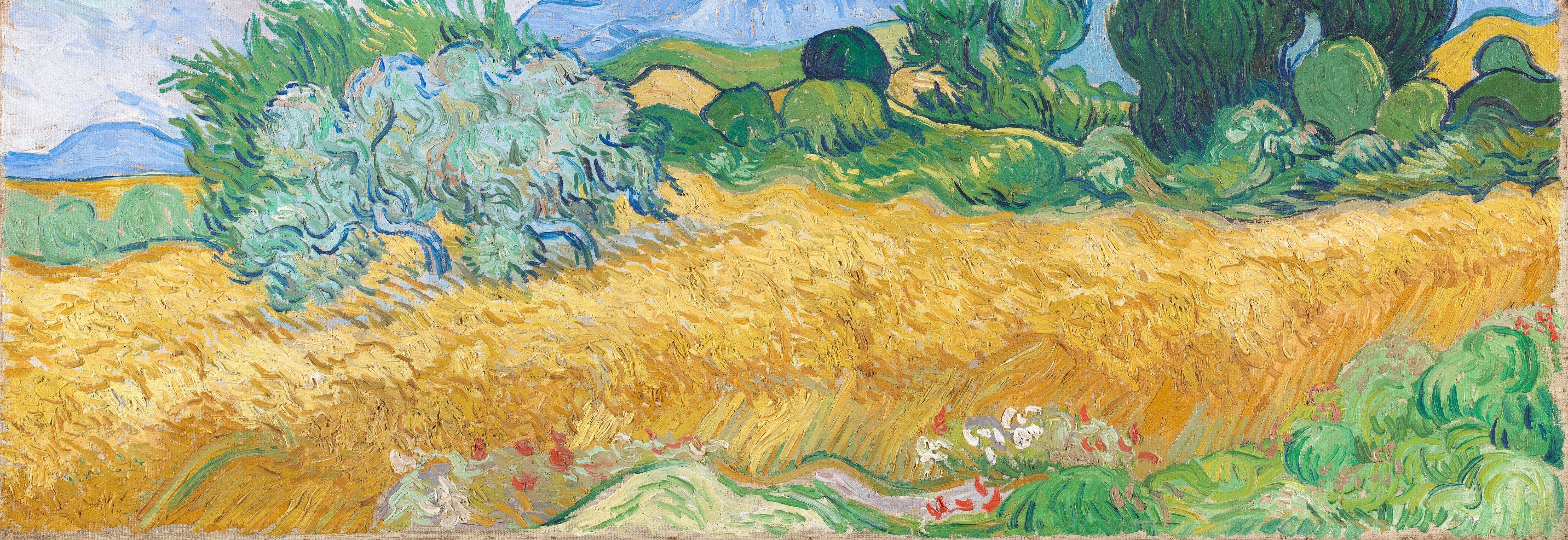 Devoid of visible human presence, this landscape includes typically Provençal motifs – a golden wheat field, tall evergreen cypresses, an olive bush and a backdrop of the blue Alpilles mountains. This landscape had a special, even symbolic, meaning for Van Gogh. In particular, the cycle from sowing to harvesting wheat – often represented by the figures of the sower and the reaper – was a metaphor, based on biblical parable, for life and death. Writing to his sister on 2 July regarding people’s responses to events we do not control or understand, he observed, ‘What else can one do … but gaze upon the wheatfields. Their story is ours, for we who live on bread, are we not ourselves wheat to a considerable extent, at least ought we not to submit to growing, powerless to move, like a plant, relative to what our imagination sometimes desires, and to be reaped when we are ripe, as it is?’
