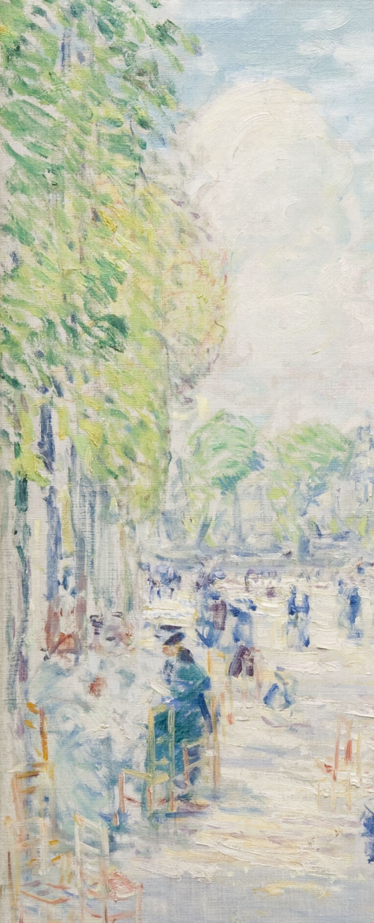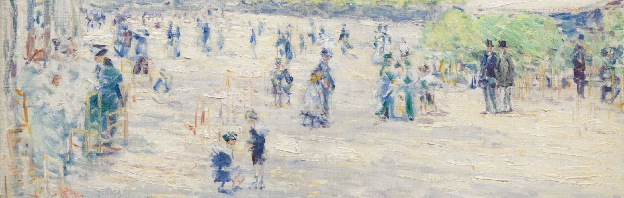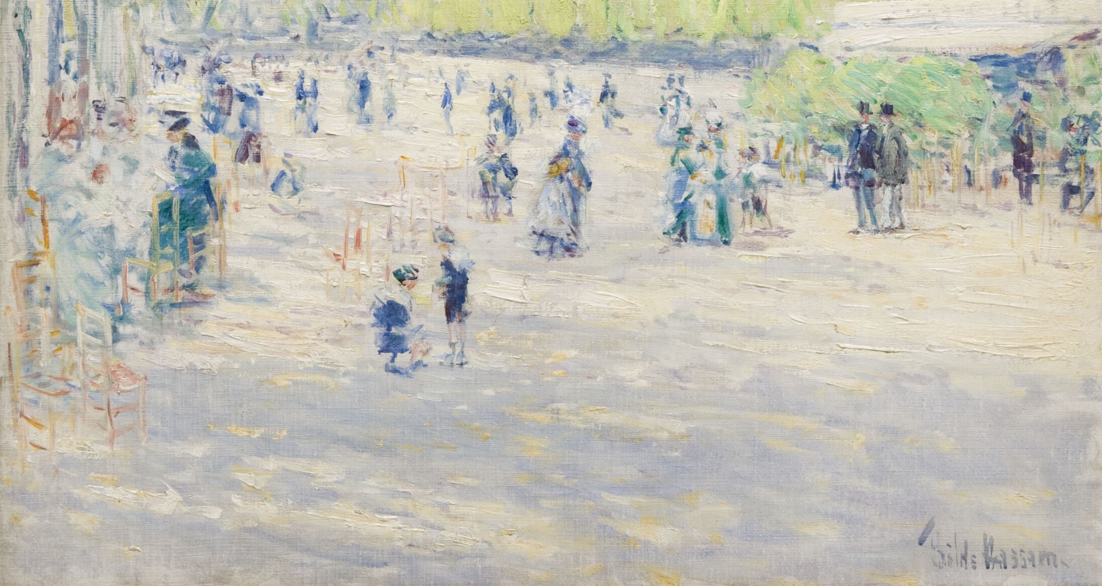 A product of his third trip to Europe, Tuileries Gardens is a spirited example of Childe Hassam’s interest in extending his command of the brighter Impressionist palette. This charming scene is a visual essay in chromatic harmonies—the light tones of ground, sky, and buildings are judiciously punctuated by clusters of parkgoers painted in deep, bold hues. Like the French Impressionists he admired, Hassam selected the quotidian subject of a Parisian public park and likely painted this scene en plein air, or directly on-site.