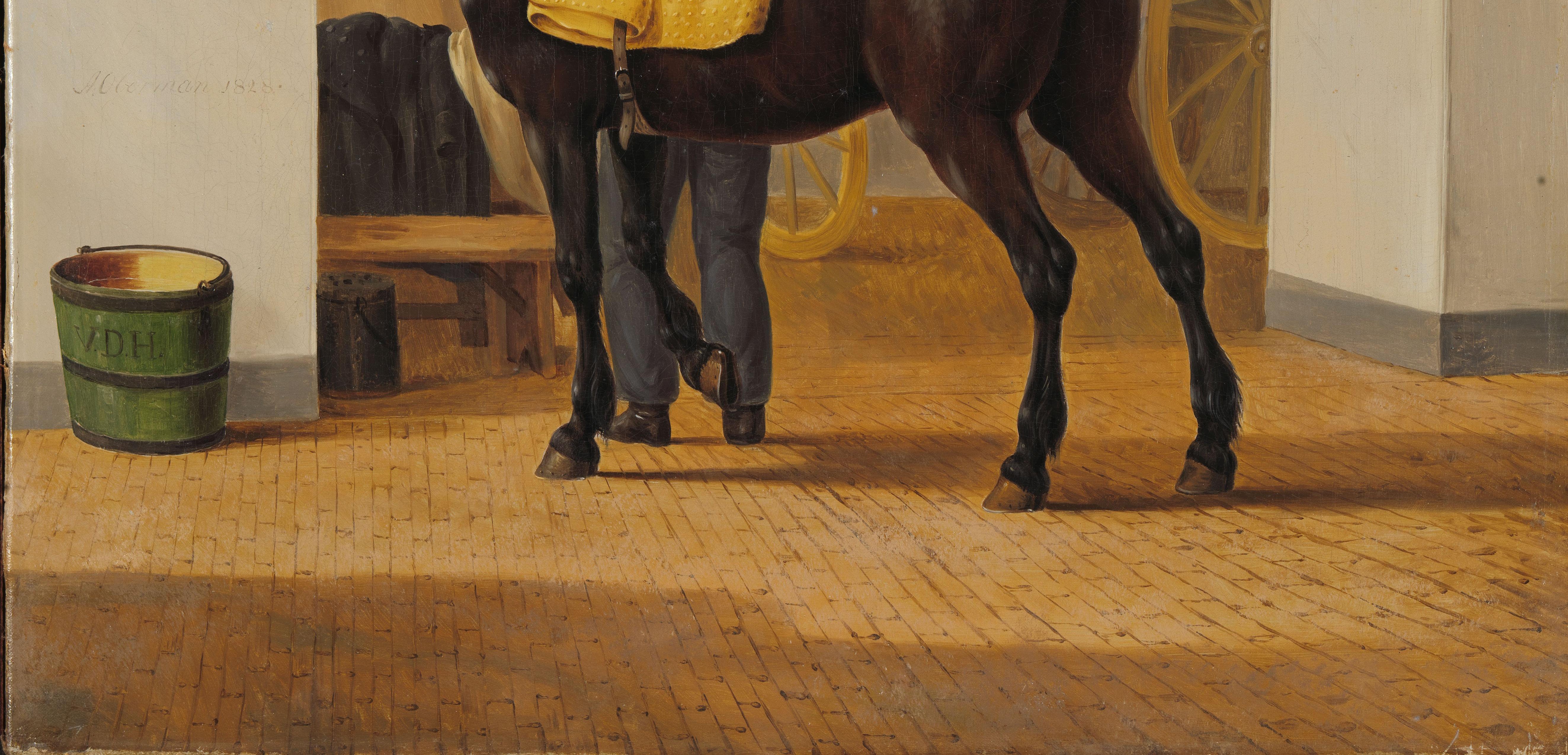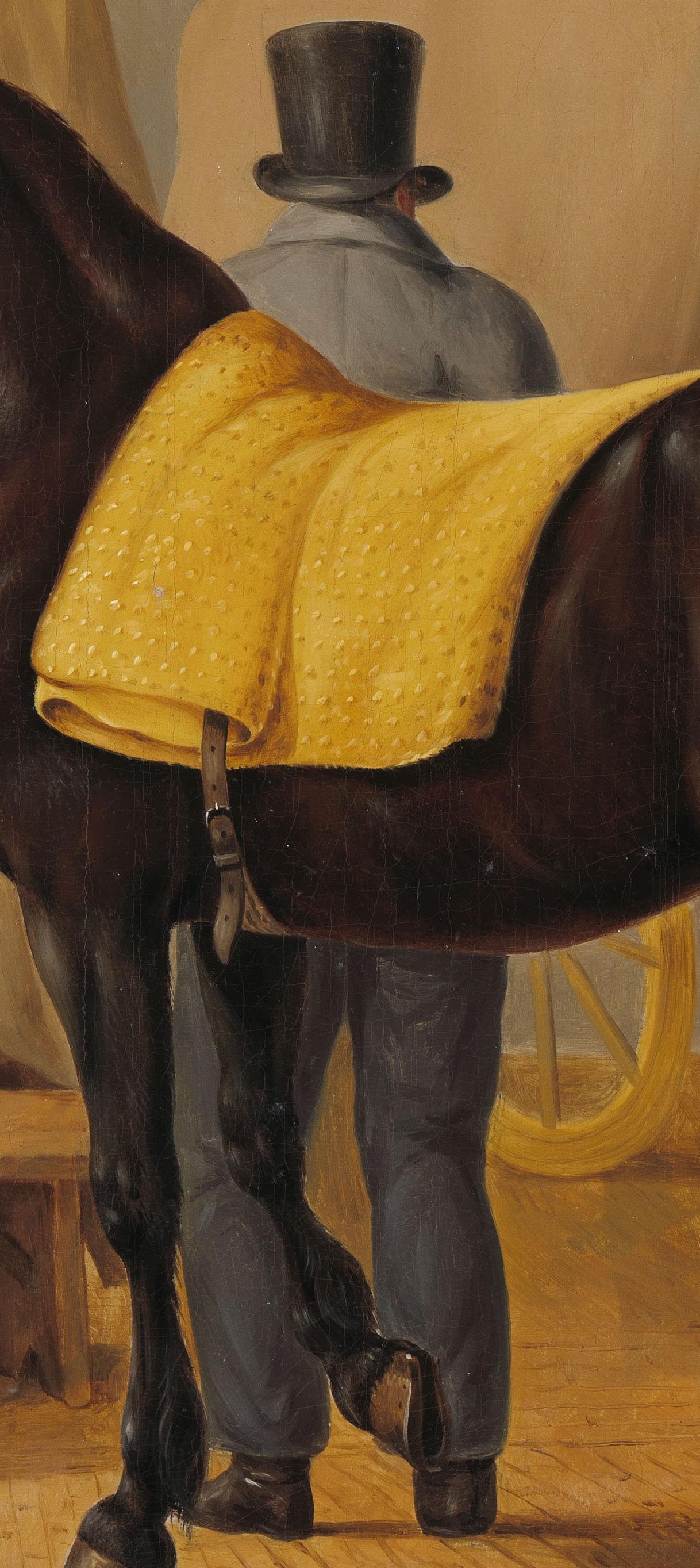 Het prijswinnende paard De Rot heeft een versierd hoofdstel en de staart is volgens de laatste mode à l’anglaise (op zijn Engels) opgebonden en versierd met een rozet. Het doorkijkje in het koetshuis laat maar liefst twee rijtuigen zien, waarvan één in modieus geel, net als het rugkleed over het paard. De initialen van eigenaar Van der Hoop staan op de groene emmer.