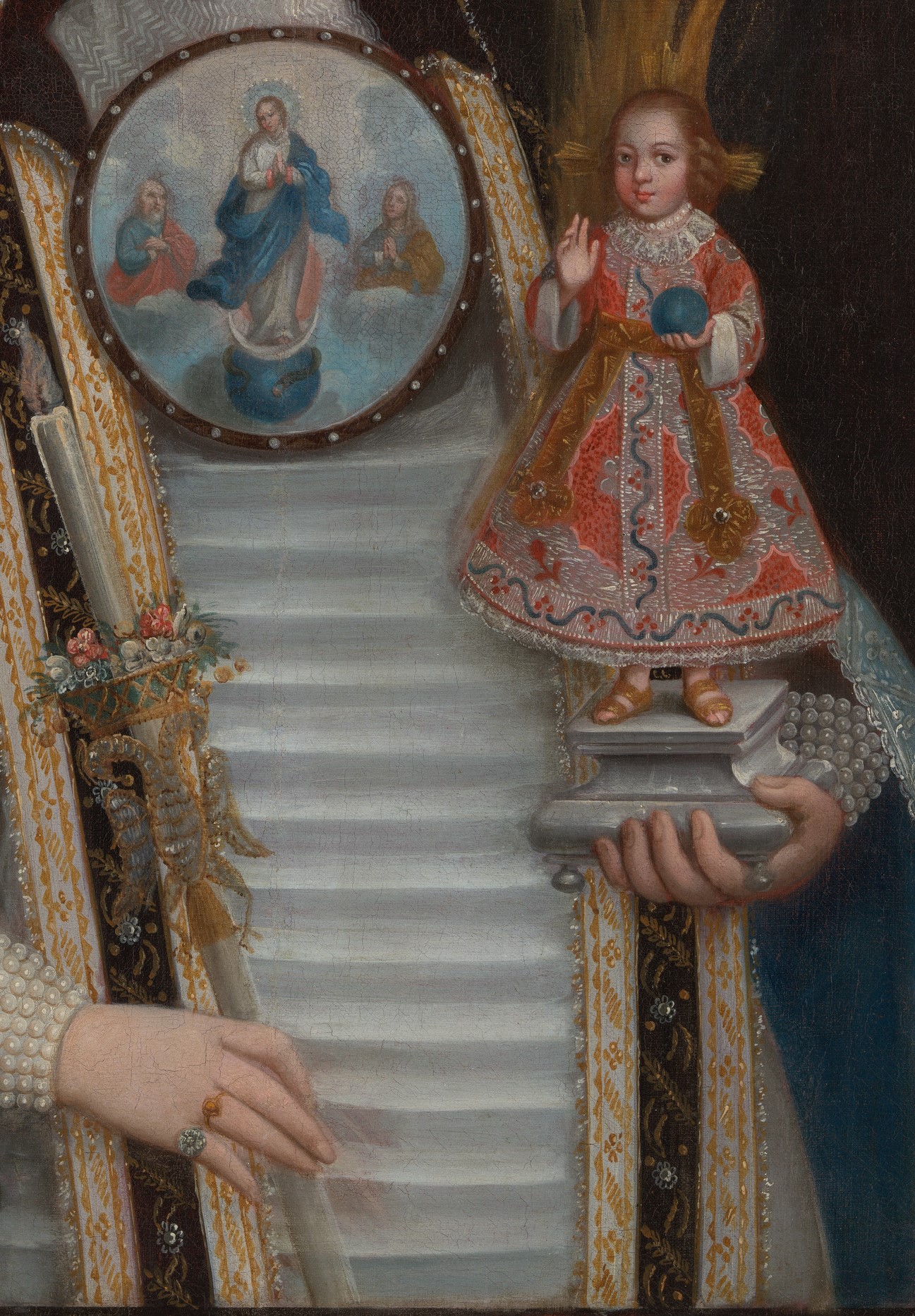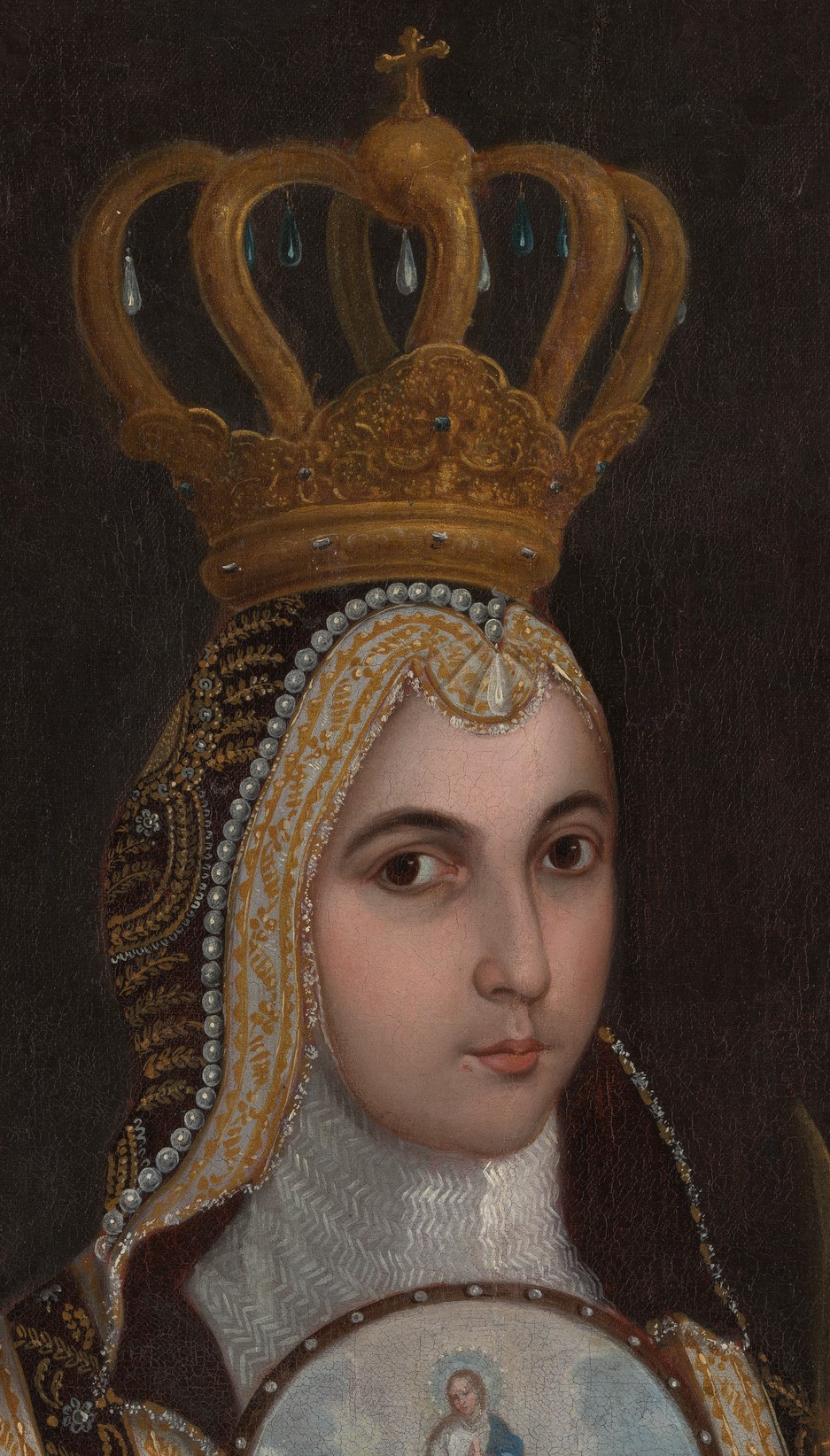 This painting exemplifies an unusual type of portraiture that is unique to colonial Mexico. It commemorates the ceremony during which a sixteen-year-old girl professed the vows of a Conceptionist nun and entered the Mexico City convent of Regina Coeli. She wears the profession regalia of the Order of the Immaculate Conception, including the characteristic nuptial crown and rings that identify her as a "bride of Christ." She is dressed in the distinctive habit of the order, popularly known as "blue nuns," after the color of their robes. Over her heart, she wears a large pictorial badge that depicts the Virgin Mary flanked by her parents, Saint Joachim and Saint Anne. The wearing of such badges was a practice unique to Conceptionist and Jeronymite nuns. She carries a small, dressed sculpture of the Christ Child who raises his right hand in blessing and, in the other hand, holds a blue globe that symbolizes his dominion over the world. The use of such images as devotional aids was widespread, especially among women, who often received them as gifts from their mothers or other female relatives. Sometimes called "crowned nuns," portraits like this one not only record the appearance of a young woman at the time of her religious profession, but they also portray the taking of a new name and identity. Sor Juana de Nuestra Señora de Guadalupe, formerly Juana Valdés, has assumed a religious identity as well as a patriotic one, whose new name references the patroness of New Spain. The portrait would have been displayed in the home of her parents, where it not only recalled the presence of an absent child but also served as a visible marker of the family’s piety, wealth, and social prestige.