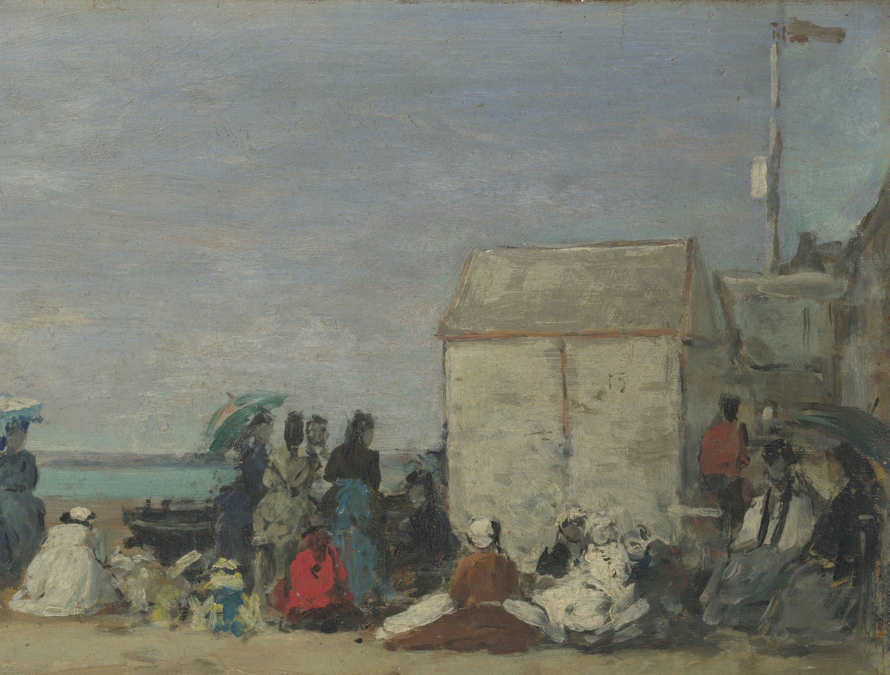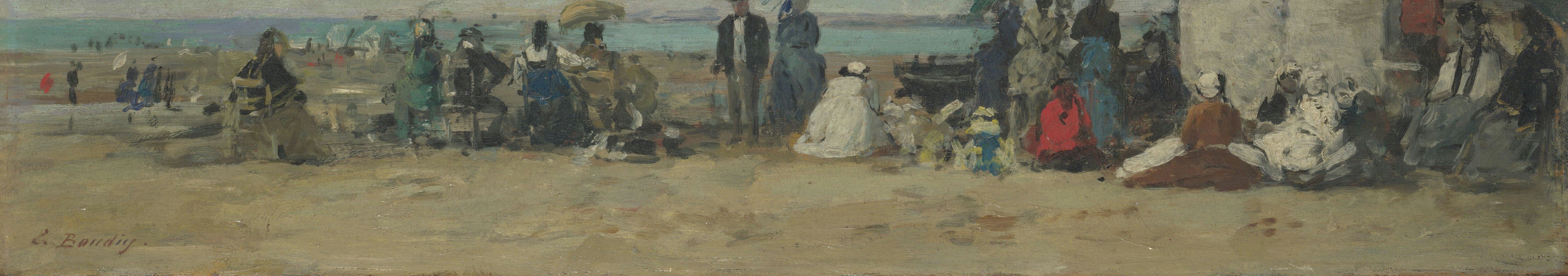 This painting, together with Boudin’s Beach Scene, Trouville, was owned by Monet, who also grew up on the Normandy coast and described Boudin as his master, claiming that he had opened his eyes to the beauty of nature. The fashions suggest that the paintings were probably not conceived as a pair, but were painted at different times. Monet was working alongside Boudin during the summer of 1870 and it has been proposed that one of the women in his The Beach at Trouville is Boudin’s wife. Unlike that picture, however, which features Monet’s family in close-up, the people on Boudin’s beach are anonymous strangers seen from some distance.
