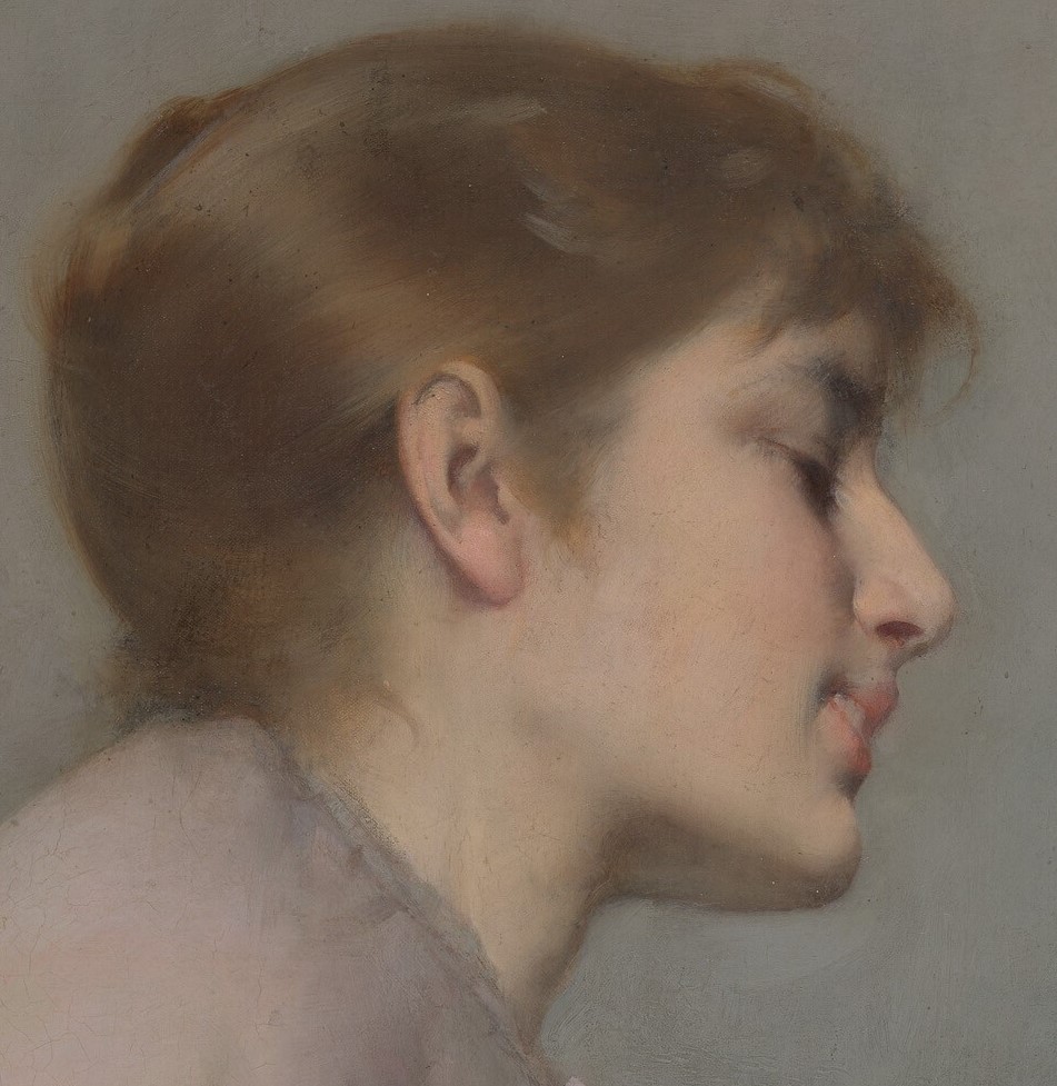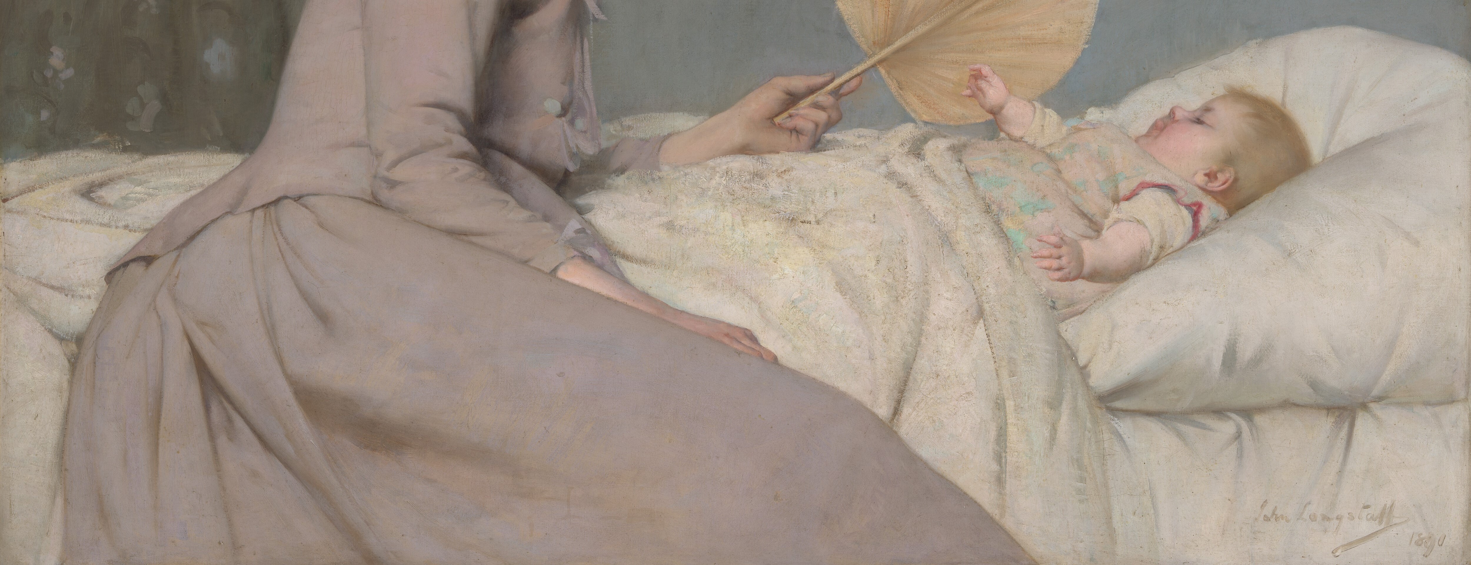 The young mother shows the artist’s wife, Topsy, and their first child, Ralph, who had been born in 1890. Pale and slim after a long winter spent in their one-room apartment that was divided by a curtain into sleeping and eating quarters, Topsy gently waves a palm fan over the outstretched arms of her baby son. The subject of mother and child, which had its origins in the depiction of the Madonna and Child, continued to be a popular subject for nineteenth-century artists, who attempted to record their personal and secular experiences with tenderness and conviction.