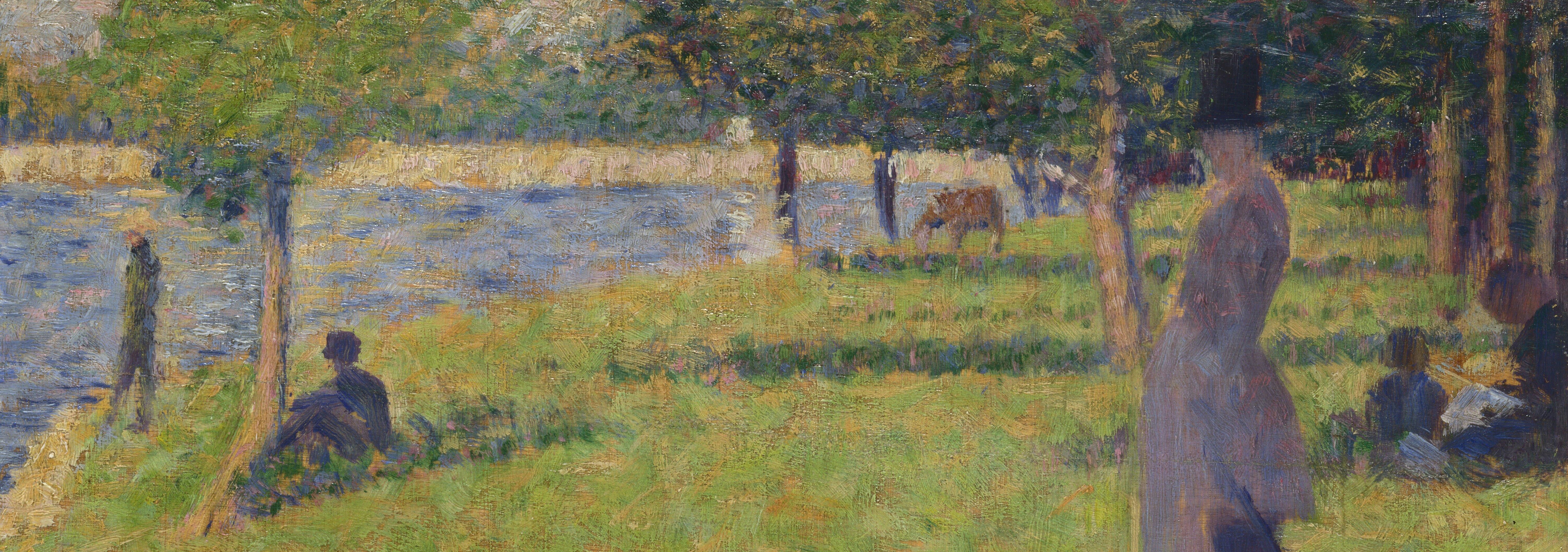 As in the Grande Jatte, the large grassy area fills most of the picture. Seurat has divided this between a shaded foreground (with a preponderance of blue alongside a dark green) and a sunlit middle area (where a golden-yellow is combined with a light green). Compared to the other Study for ‘La Grande Jatte’ in the National Gallery’s collection, there is a reduced range of colours. As Seurat had not yet fully developed the pointillist technique he used in the painitng itself, the sketch may date to 1884–5.