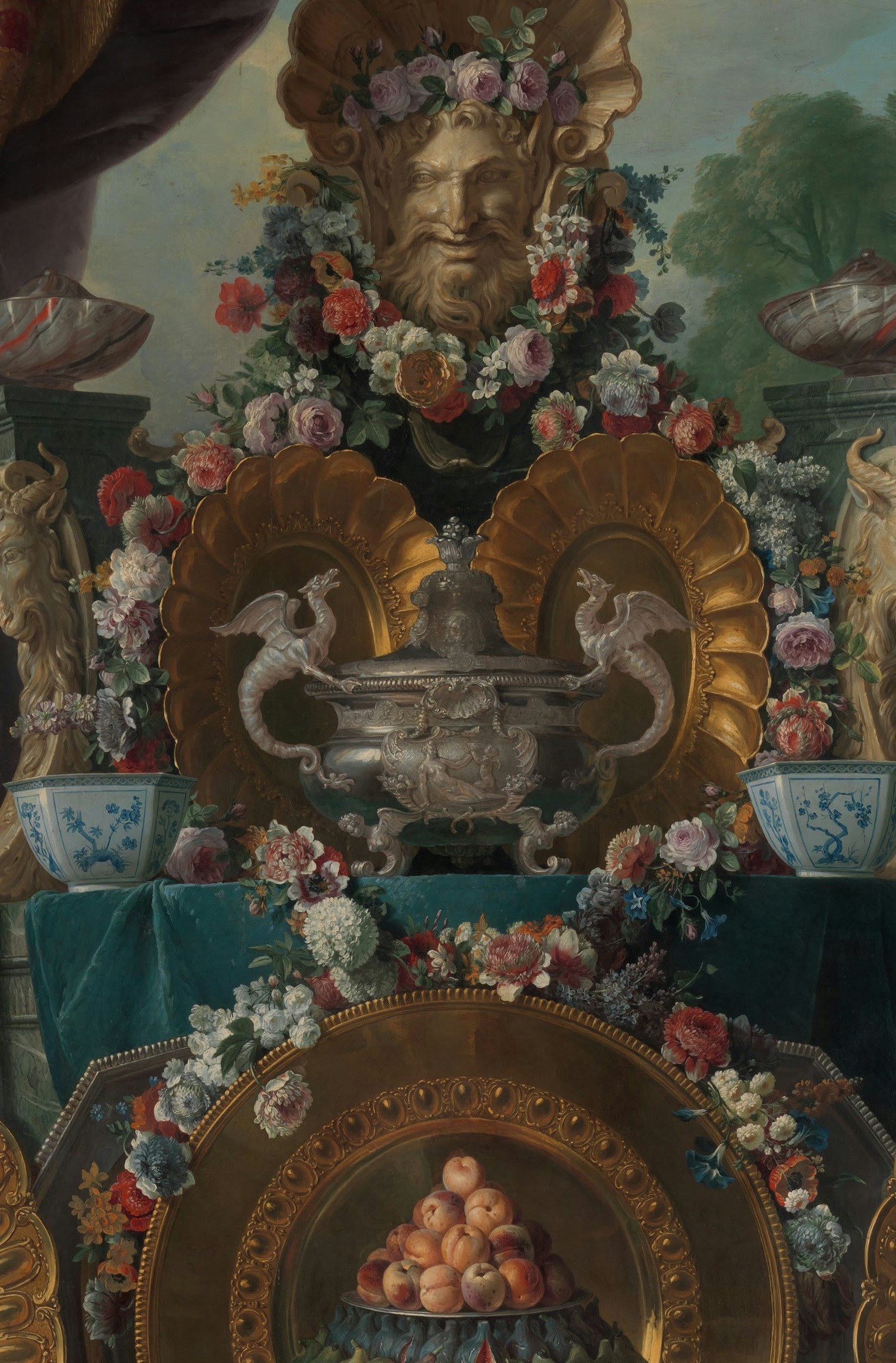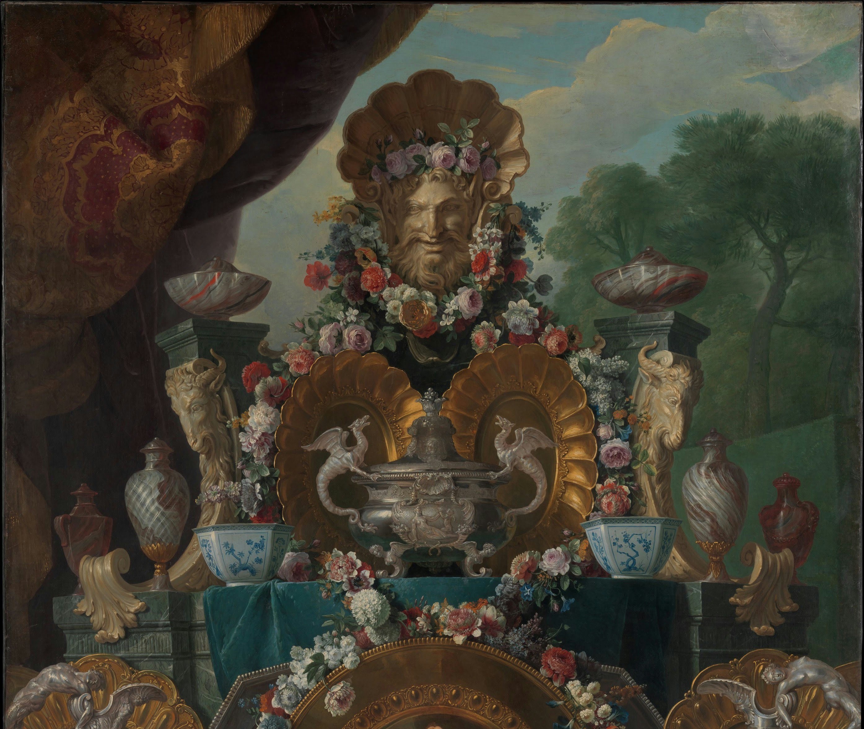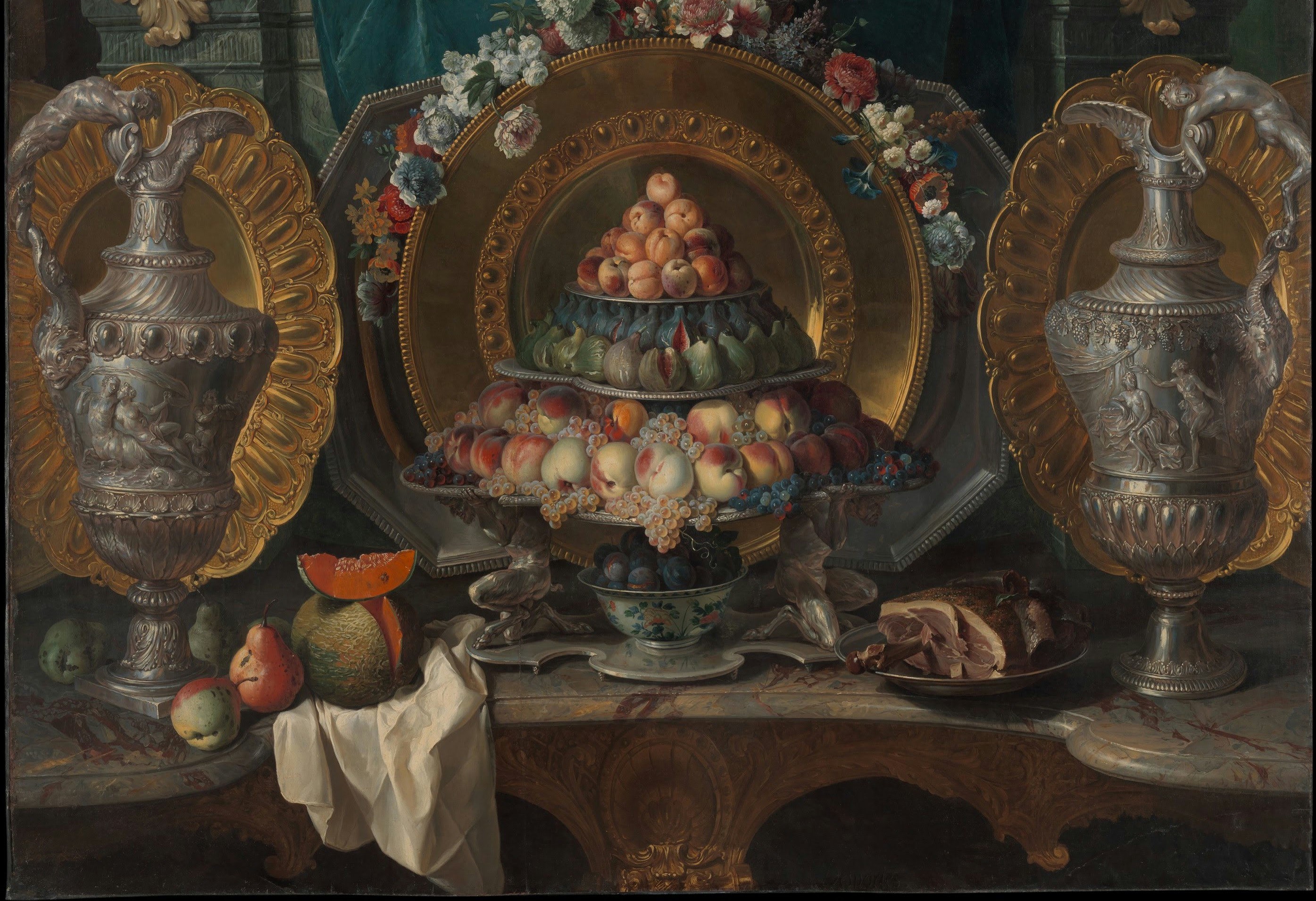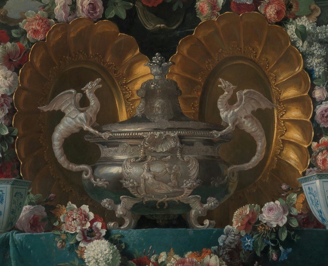 Our canvas typifies the evolution of eighteenth-century still-life painting away from the intimate format of the Low Countries toward a distinctively French idiom rich in pomp and spectacle. Here gold and silver vessels are displayed on a tiered console table laden with fruit and flowers. The composition is monumental in scale. Although the canvas is not dated, the dragon-handled tureen and vermeil salvers are in the Régence style (ca. 1715–23).
