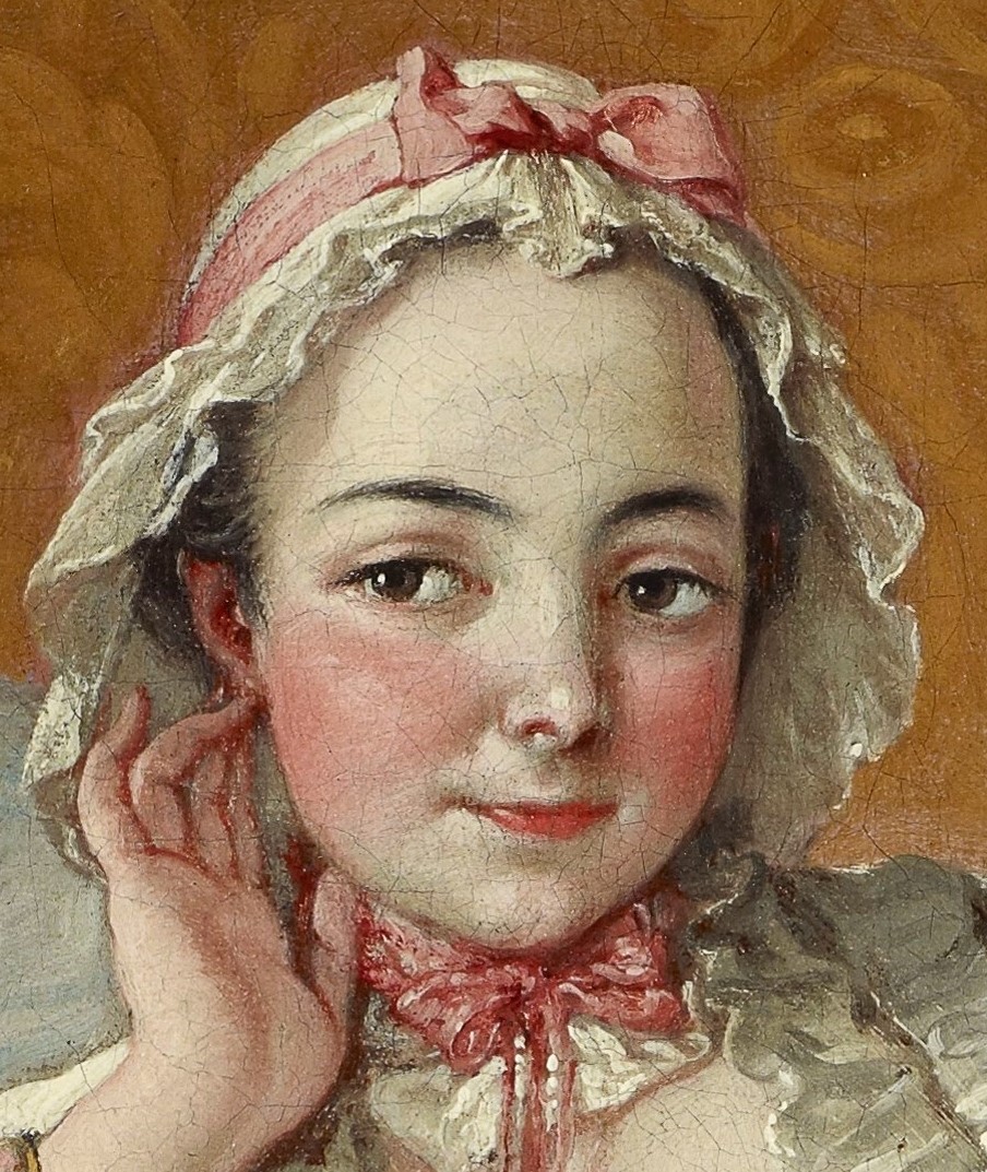 When Marie-Jeanne Buzeau (1716–after 1786) posed so pertly for this informal portrait ten years after her marriage to Boucher, she was twenty-seven and the mother of three children. She frequently served as model for her husband, and in later life she painted miniature reproductions of his more popular pictures and made engravings after his drawings. Besides offering such a candid image of the artist’s wife, the portrait provides a fascinating glimpse of a room in the apartment to which Boucher had moved the year before he signed this canvas on the rue de Grenelle-Saint-Honoré. The porcelain figurine and tea service on the hanging étagère reflect Boucher’s taste for the Oriental bric-a-brac so fashionable throughout the eighteenth century. In its composition the portrait is a witty parody of the classical Renaissance depictions of Venus by Giorgione and Titian, and as such the picture has acquired the sobriquet “Boucher's Untidy Venus.”