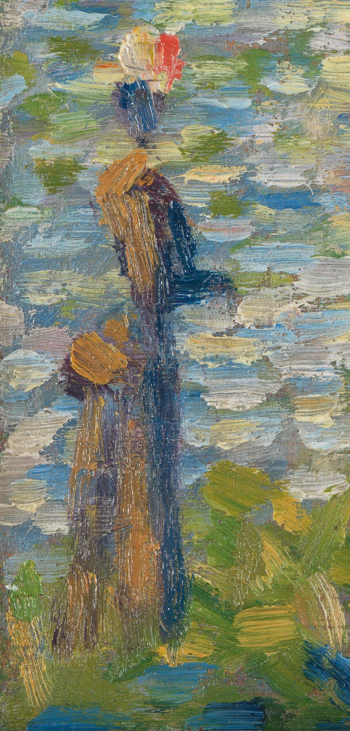 This panel was most likely painted in 1885 and relates to a medium-size canvas, The Seine at Courbevoie (private collection, Paris). It may have preceded Seurat’s decision to paint this particular view of the river, or it may be a preparatory study for the painting. The vertical format is unusual for Seurat, but it allowed him to arrange the composition as a series of stacked horizontal bands formed by the foreground, the river, the far riverbank and the houses and trees of Courbevoie in the distance. Although we are looking across the water towards the opposite riverbank some distance away, these lateral bands reduce the effect of spatial depth and atmospheric recession, as does the placing of the sky near the very top of the picture. The bands are, however, counterbalanced by the continuous vertical of the tree trunk on the right and the shorter vertical of the standing woman on the left, her brown dress partly echoing the darker brown of the tree. Although Seurat has focused on the landscape in this sketch, many of its components are reiterated from the Grande Jatte – for example, the river Seine and its grassy bank, a standing female figure, the emphatic vertical of the tree and the high skyline.