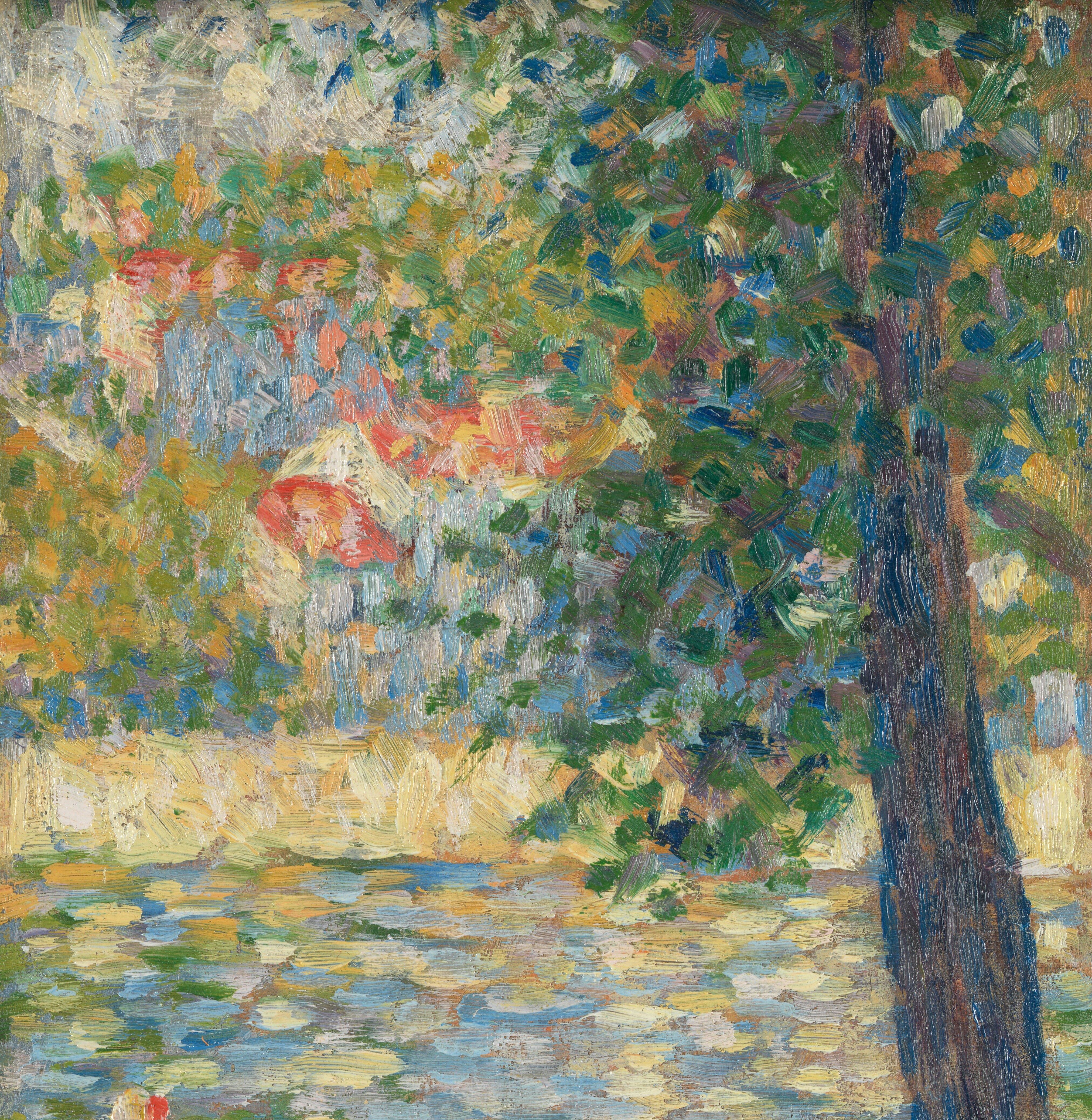 A focus on the underlying structure of the scene is a feature of Seurat’s art, but his application of the paint softens the geometry of the composition. Although Seurat had developed his pointillist technique by 1885, his debt to Impressionism is still evident here, and the freshness of his brushwork especially recalls the earlier work of Monet and Pissarro. Seurat worked rapidly, leaving traces of the bare wood of the panel visible between the brushstrokes. Unlike in some of his sketches, he has not built up the brushwork in layers, although some areas are more densely worked (for example, the roof tops where the colours have mixed together while still wet). The individual strokes themselves are relatively large and fluid, unlike the tighter, more uniform brushwork of pointillism, and are laid down as clean, unmixed colours. Seurat has also modified them according to the object or surface they describe. For example, he has used horizontal lozenge-like strokes for the shimmering water (which recall Monet’s brushwork in Bathers at La Grenouillère), shorter, choppier strokes for the grass and foliage, and longer, sinuous strokes for the tree trunk. The pale yellows and whites used throughout much of the painting create an effect of warm sunlight and contrast with the dark border formed by the tree and the touches of dark green at the very bottom of the picture.
