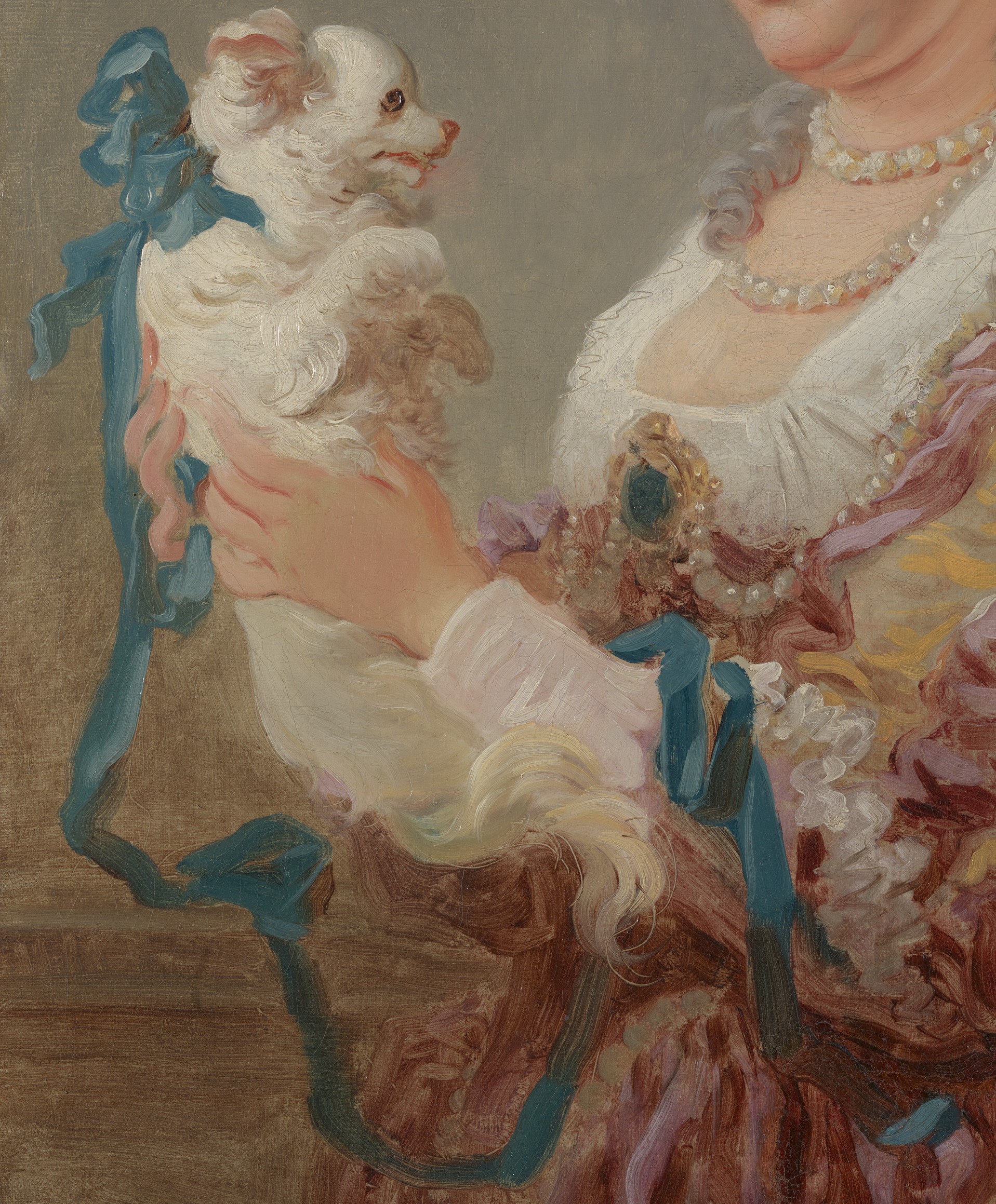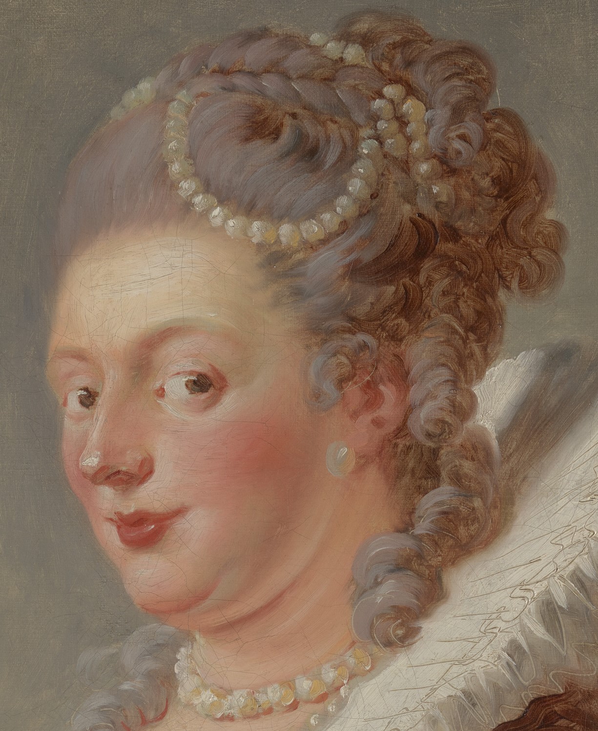 Fragonard’s so-called fantasy portraits are electric performances: brushed with virtuosity, panache, and speed, he reworked the surface while the paint remained wet, including by incising lines into the large white ruff. The theatrical costume recalls Queen Maria de’ Medici’s court dress from over a century earlier, as depicted in a series of paintings by Peter Paul Rubens that Fragonard saw in the French royal collections. A recently discovered drawing makes it possible to identify this woman as the aristocratic salon hostess Marie Emilie Coignet de Courson. Fragonard’s painterly performance arguably outshines her, however, making this a kind of artist’s self-portrait.