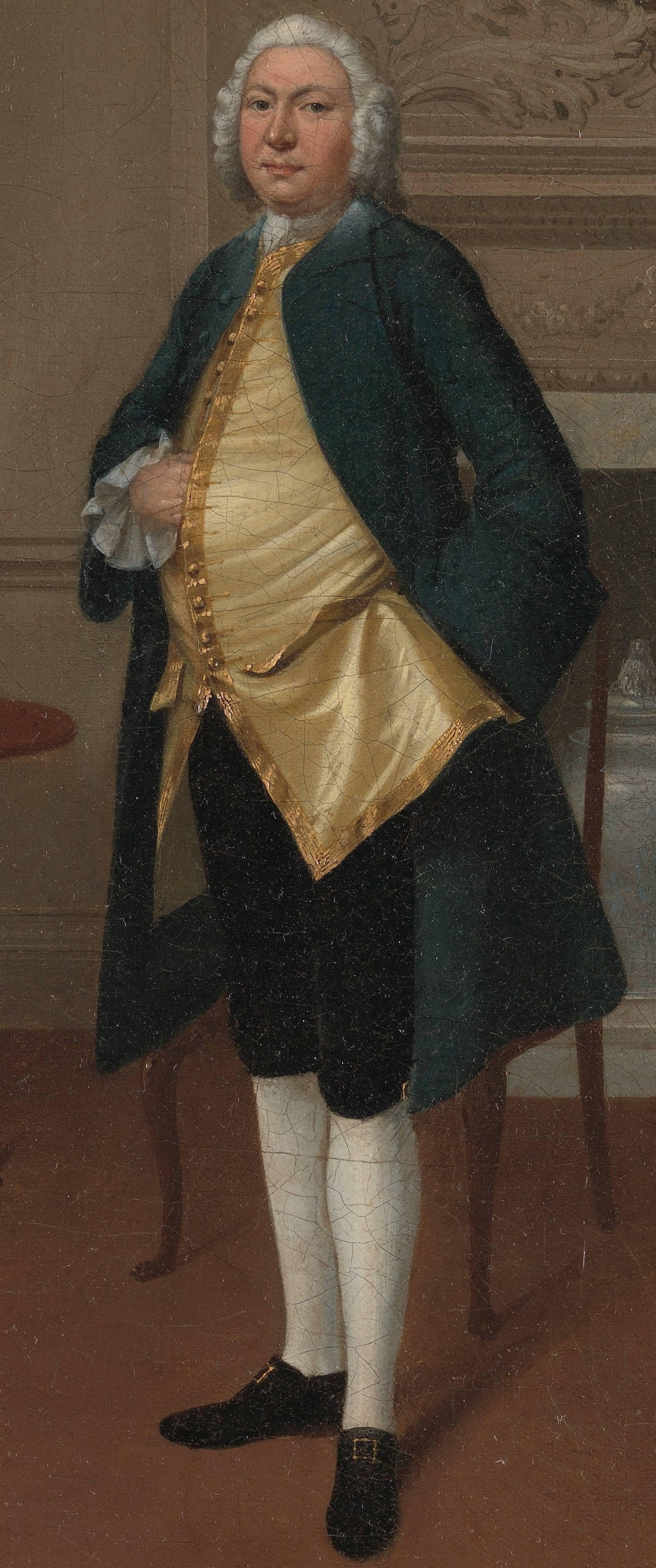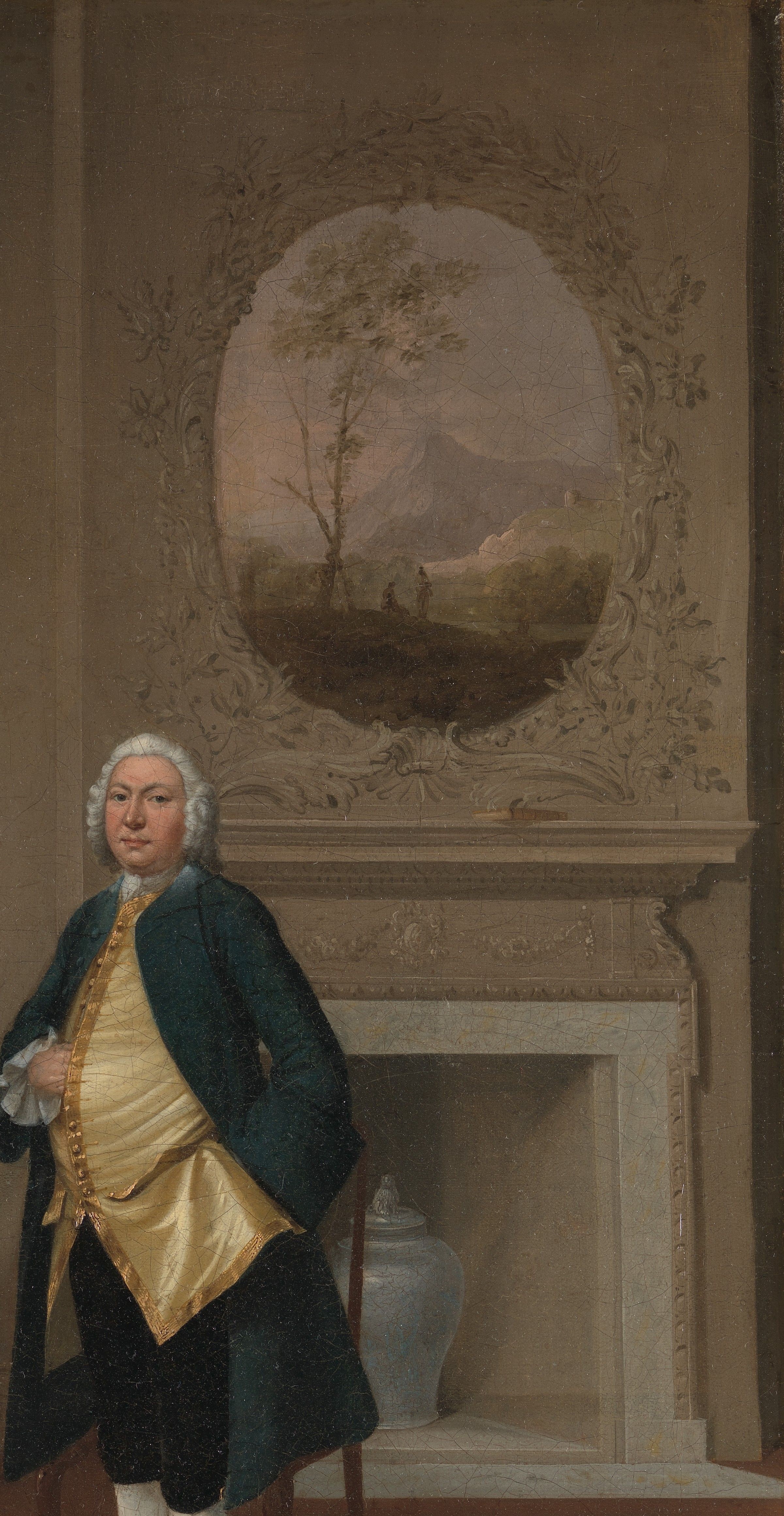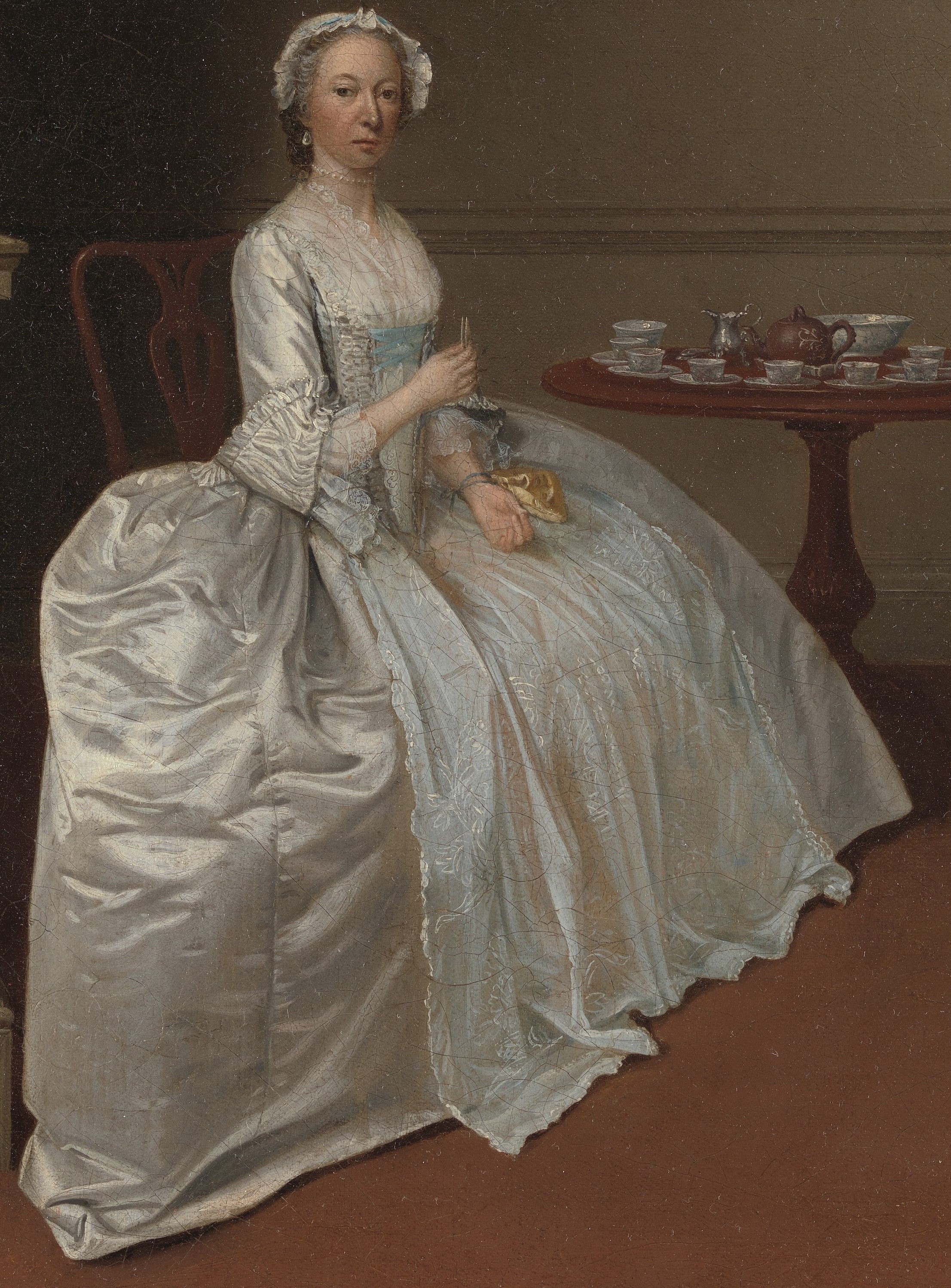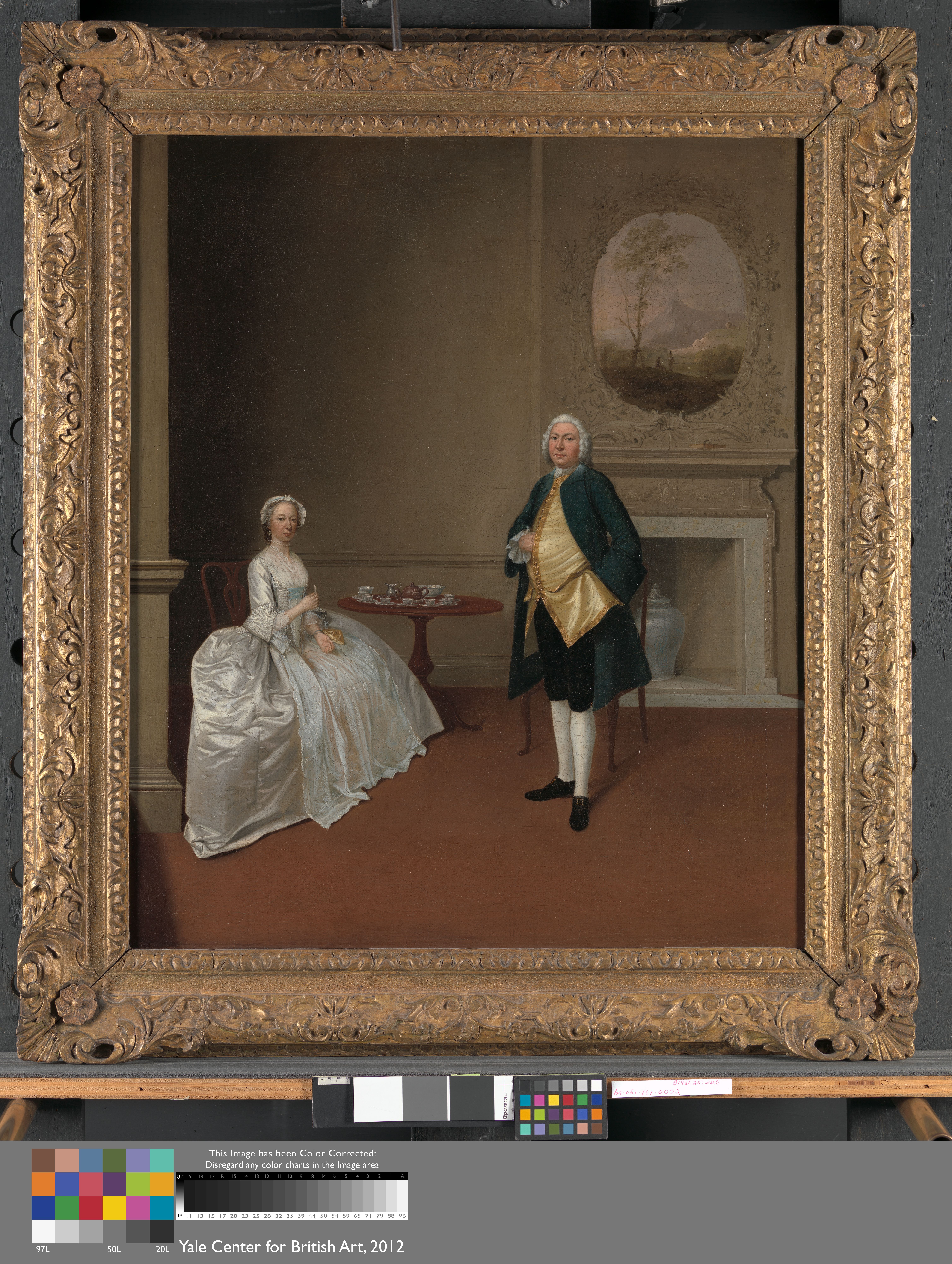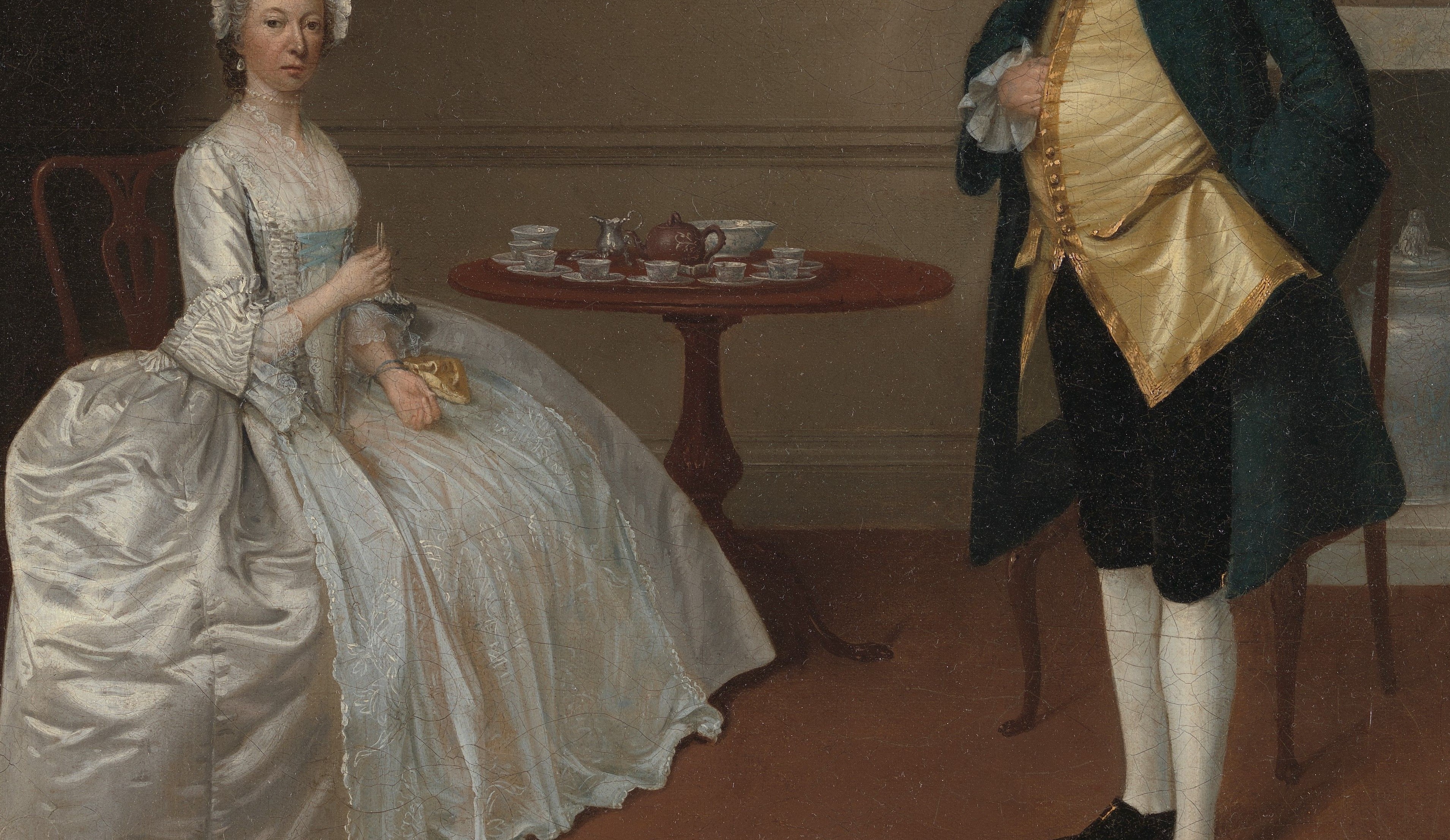 Arthur Devis was one of the most prolific painters of conversation pieces, often working for the families of country gentry with aspirations to refinement and polite taste. Mr. and Mrs. Hill are just such a couple, posed before an Italianate landscape painting in a stucco frame and a Chinese vase in the fireplace. A table made from West Indian mahogany is set for tea with a Chinese porcelain service, an English redware teapot in imitation of Chinese ceramics, and a silver milk jug. Mr. Hill’s stance reflects formal etiquette for gentlemen, rules that Devis continued to use in his paintings while poses used by other artists in their portraits began to suggest greater spontaneity and psychological depth. In a period when Britons worried about the enervating effects of luxury, Devis provides an image of Mr. and Mrs. Hill as models of polite rectitude. Despite their consumption of refined objects from around the world, the interior remains remarkably austere, a reflection of the couple’s own moral probity.