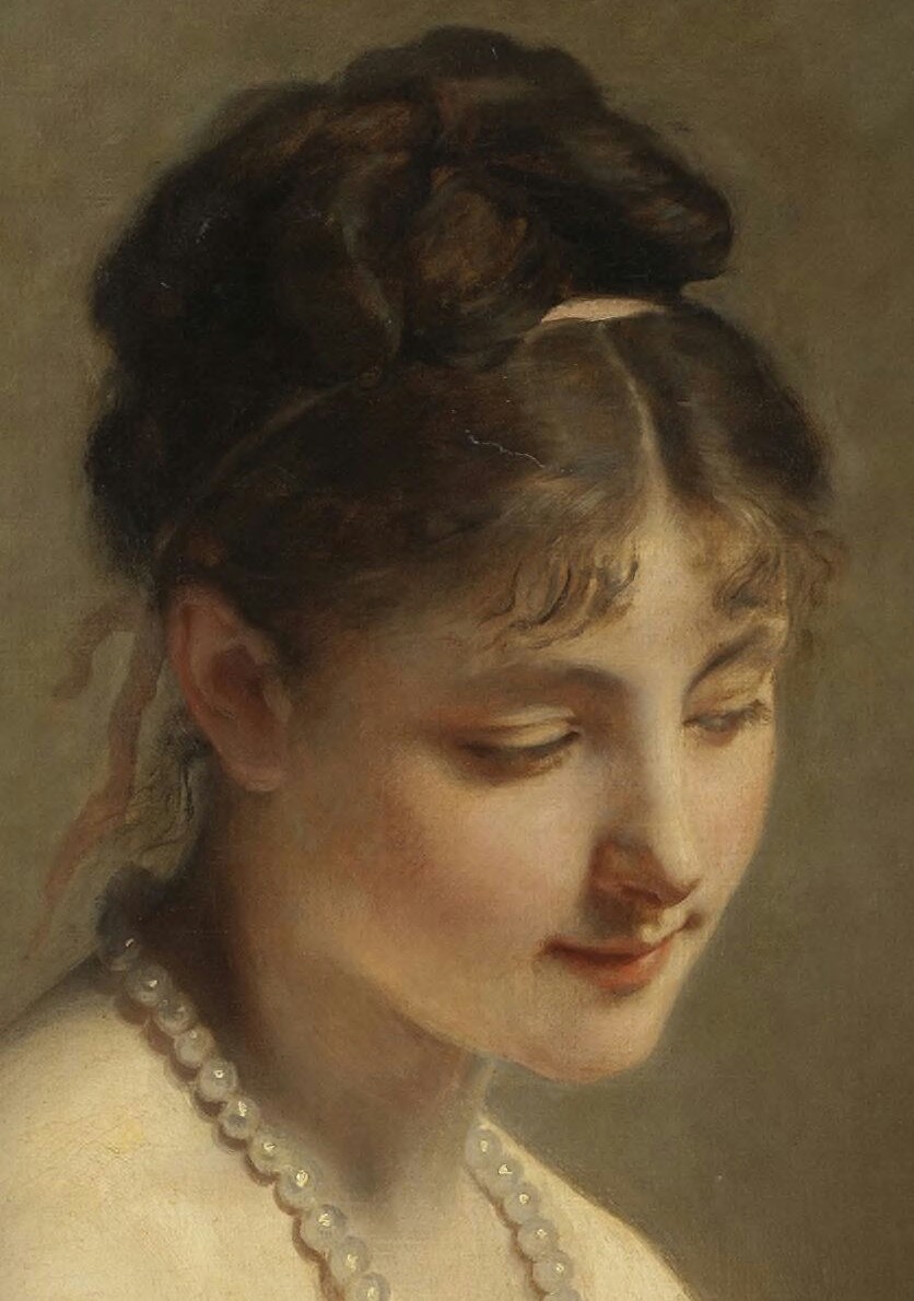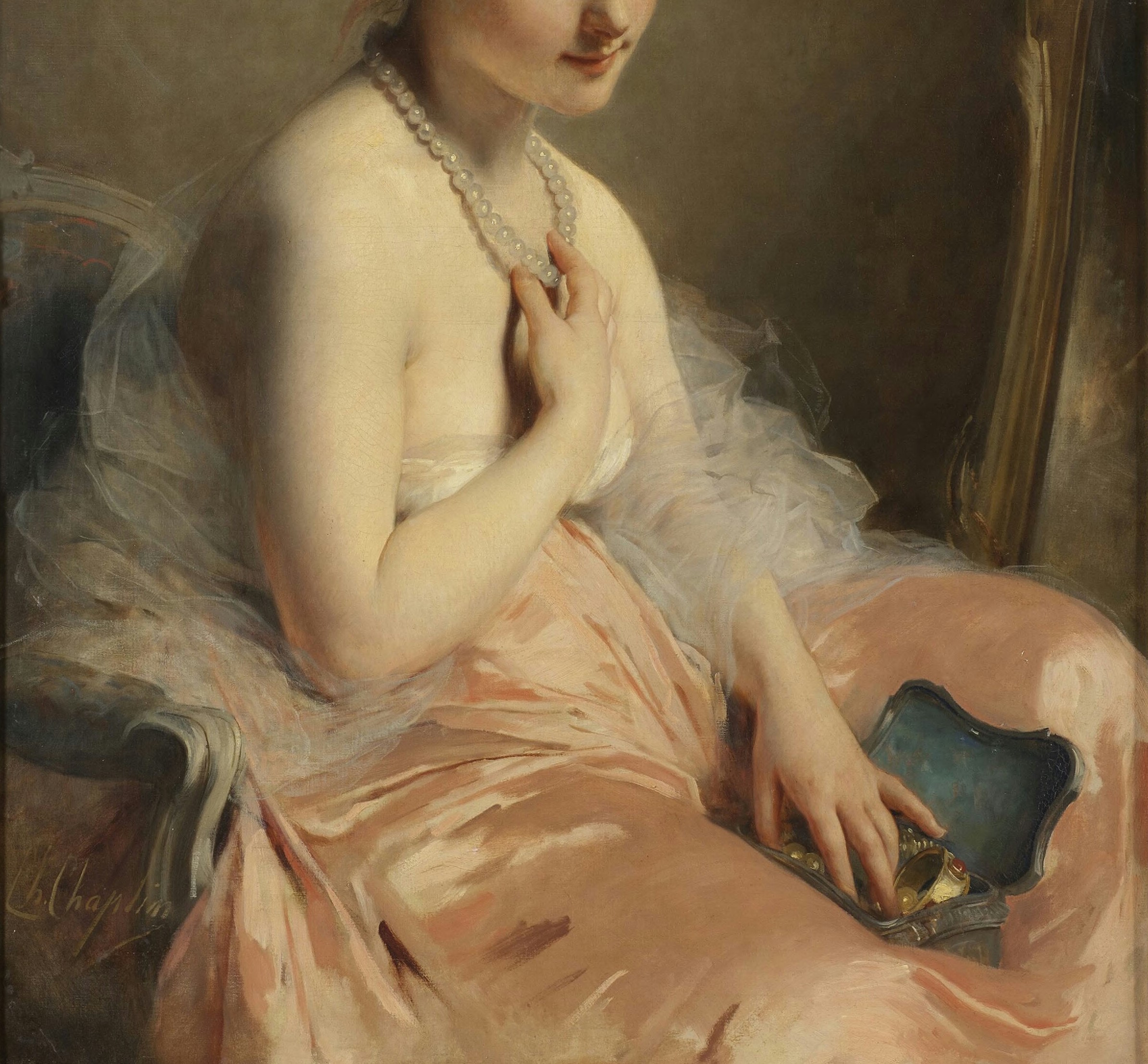 Den halvnakna kvinnan sitter framför en spegel och provar tvekande ett pärlhalsband. Den plastiskt modellerade figuren och det minutiösa stoffmåleriet, var typiska för tidens akademiska tradition. Chaplin var berömd för sina erotiska och objektifierande kvinnoporträtt som köptes av dåtidens aristokrati och finanselit. Han var som många salongkonstnärer påverkad av det sena 1700-talets porträtt och genremåleri.