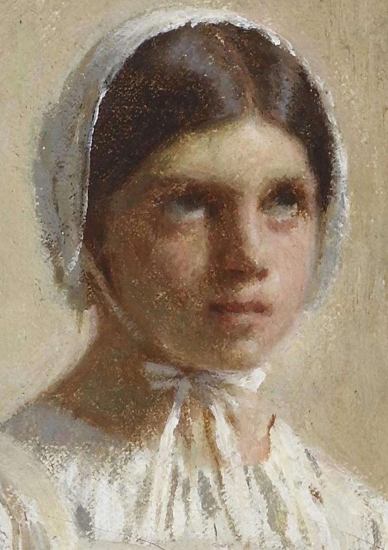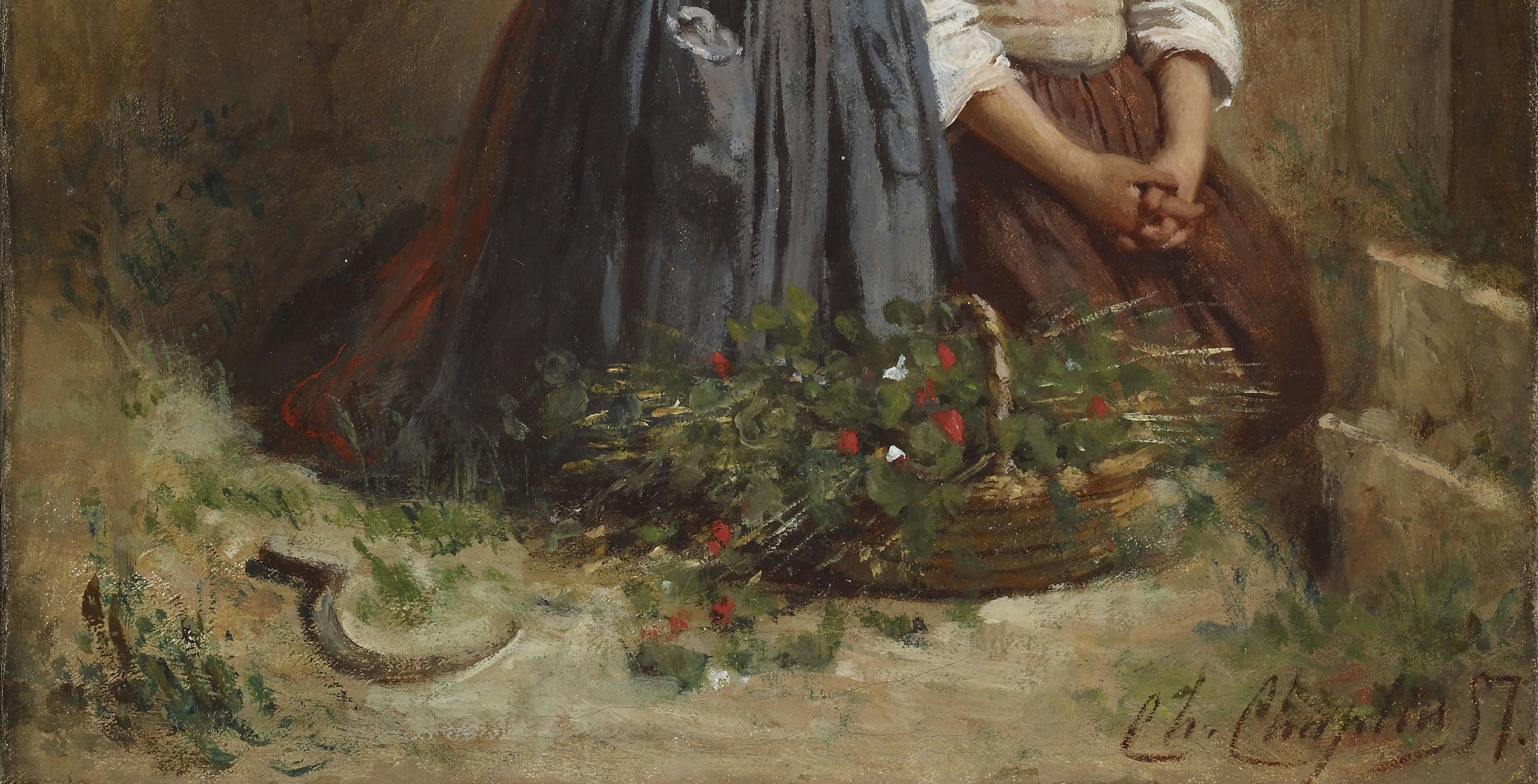 Two peasant girls are kneeling in prayer. In front of them is a basket of flowers and a sickle.